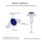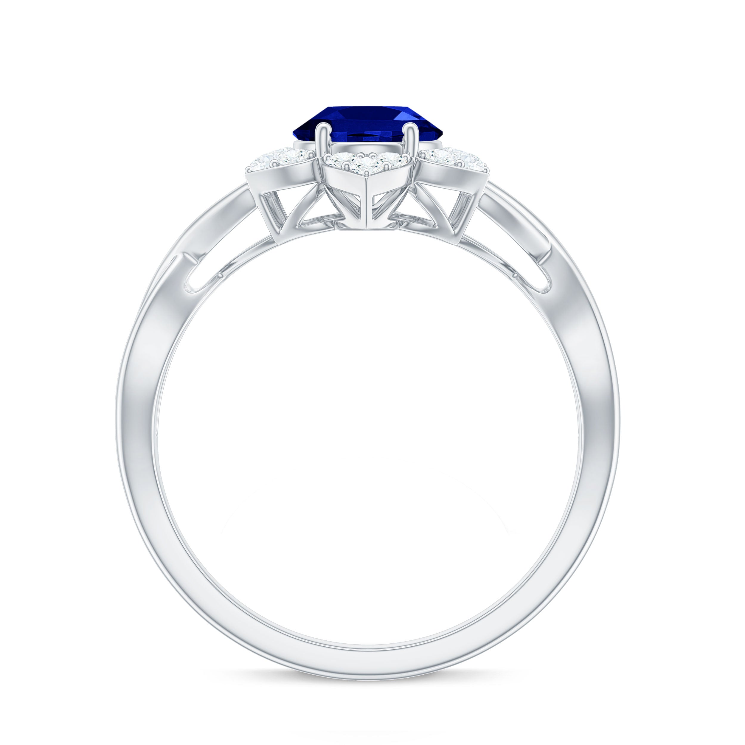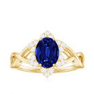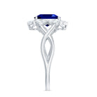 Adorned with a delightful floral Diamond halo, this exquisite ring showcases an oval-shaped created blue sapphire at its center. The crossover shank adds a unique touch, making the ring even more captivating. Set in prongs for added radiance, this statement piece of jewelry exudes timeless allure and elegance.