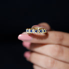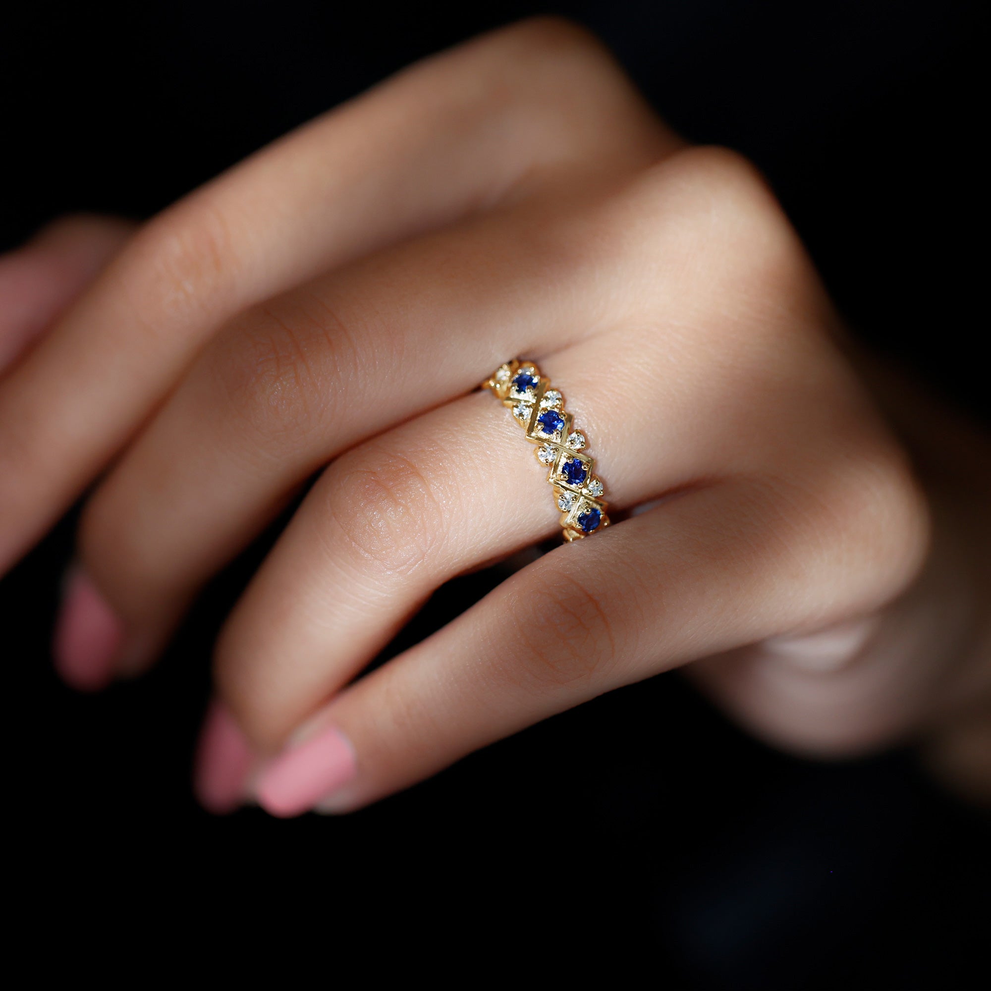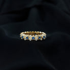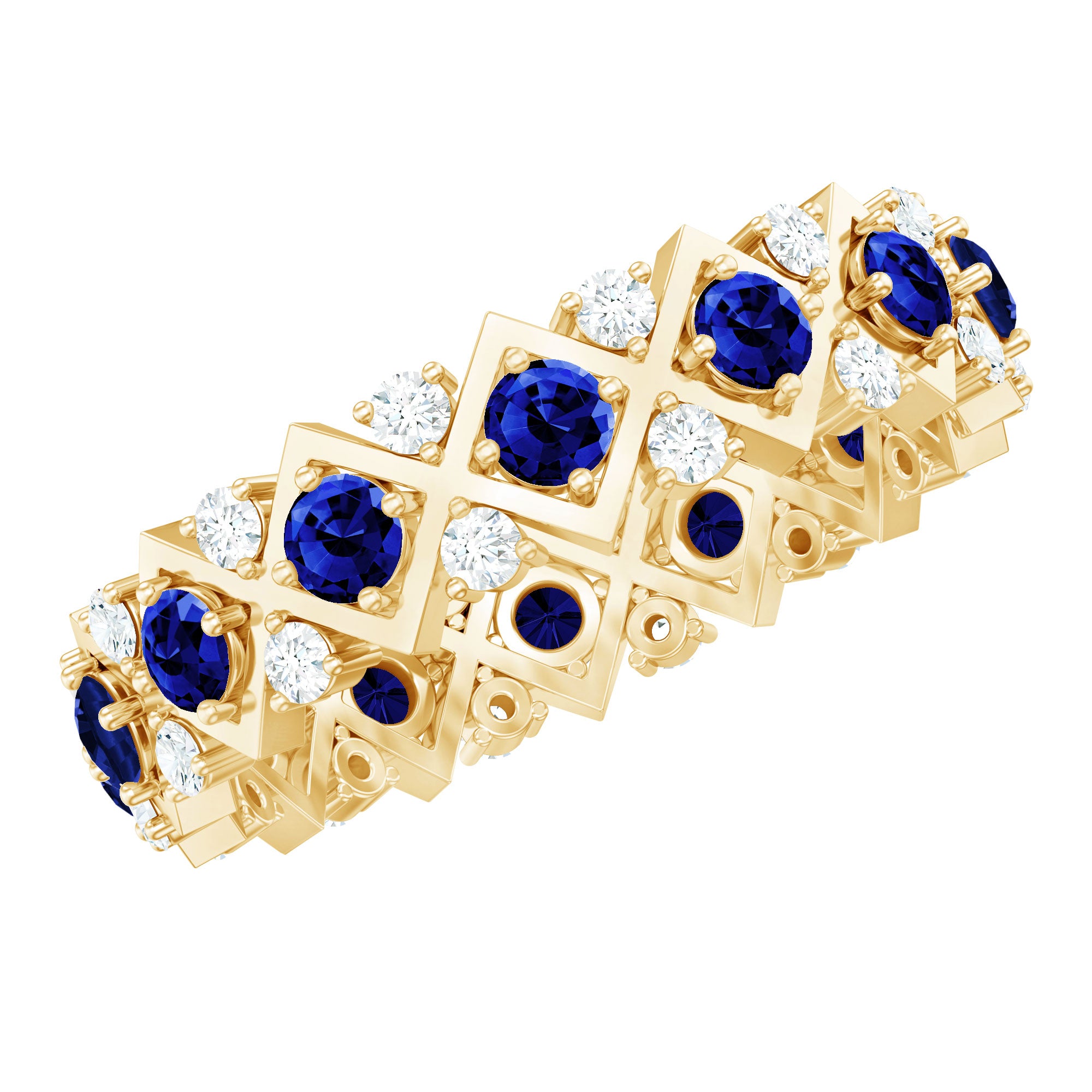 Experience the understated charm of this elegant solid gold Created Blue Sapphire Ring. The full eternity band is adorned with Round Shape Created Sapphires and Diamond stones, making it the perfect piece to accessorize with multiple staples. This classic eternity ring is the epitome of sophistication and style.