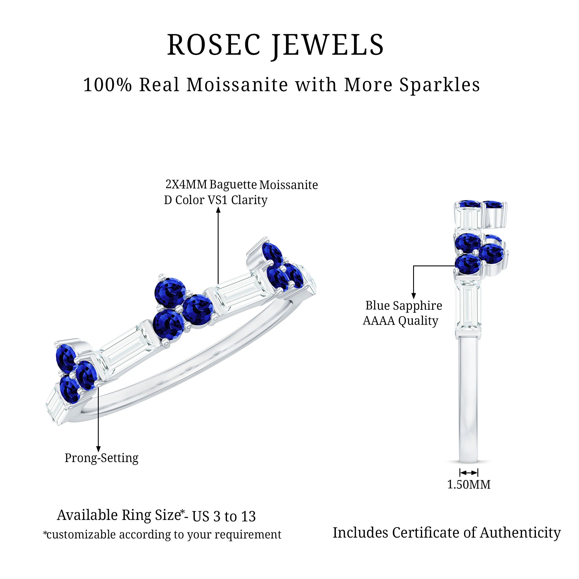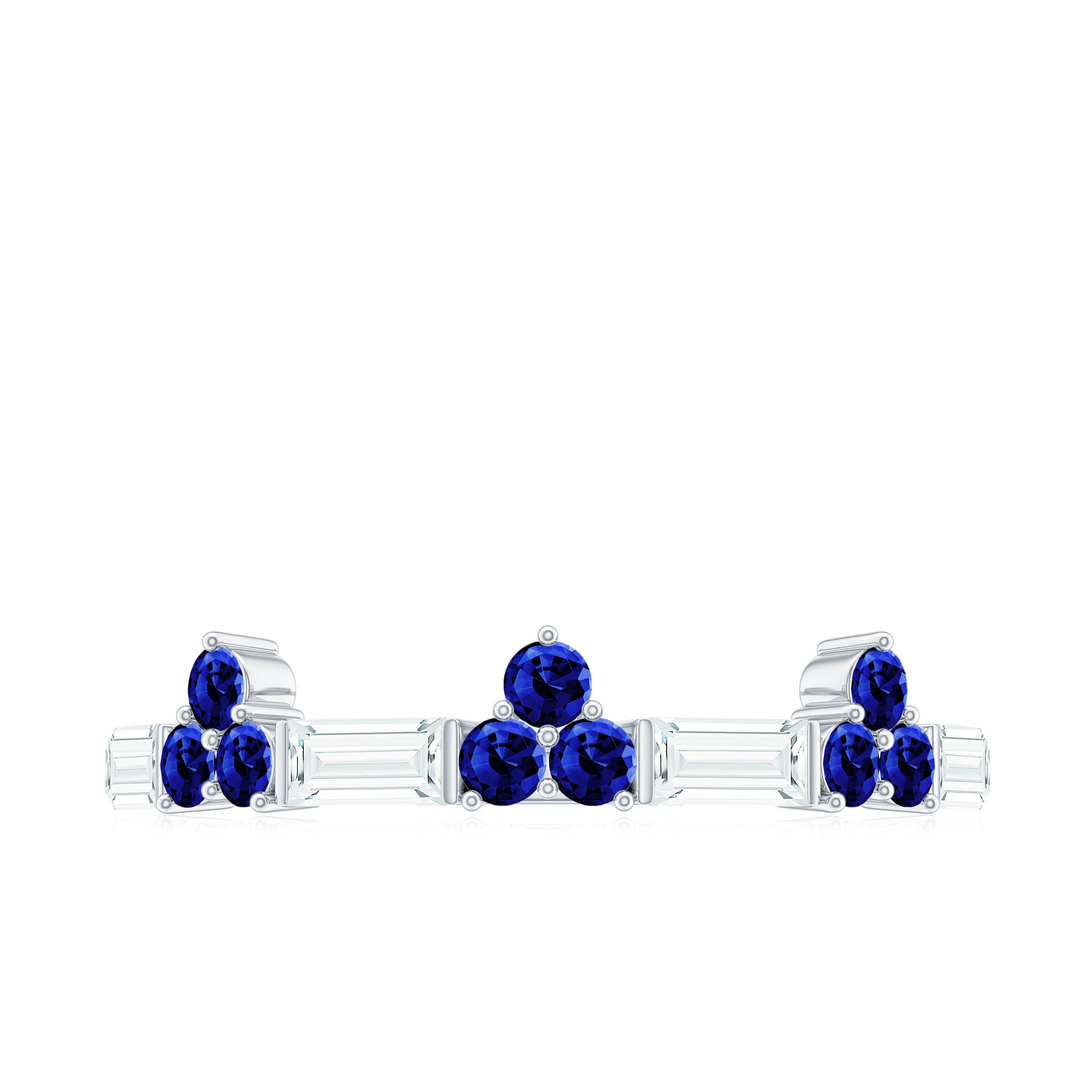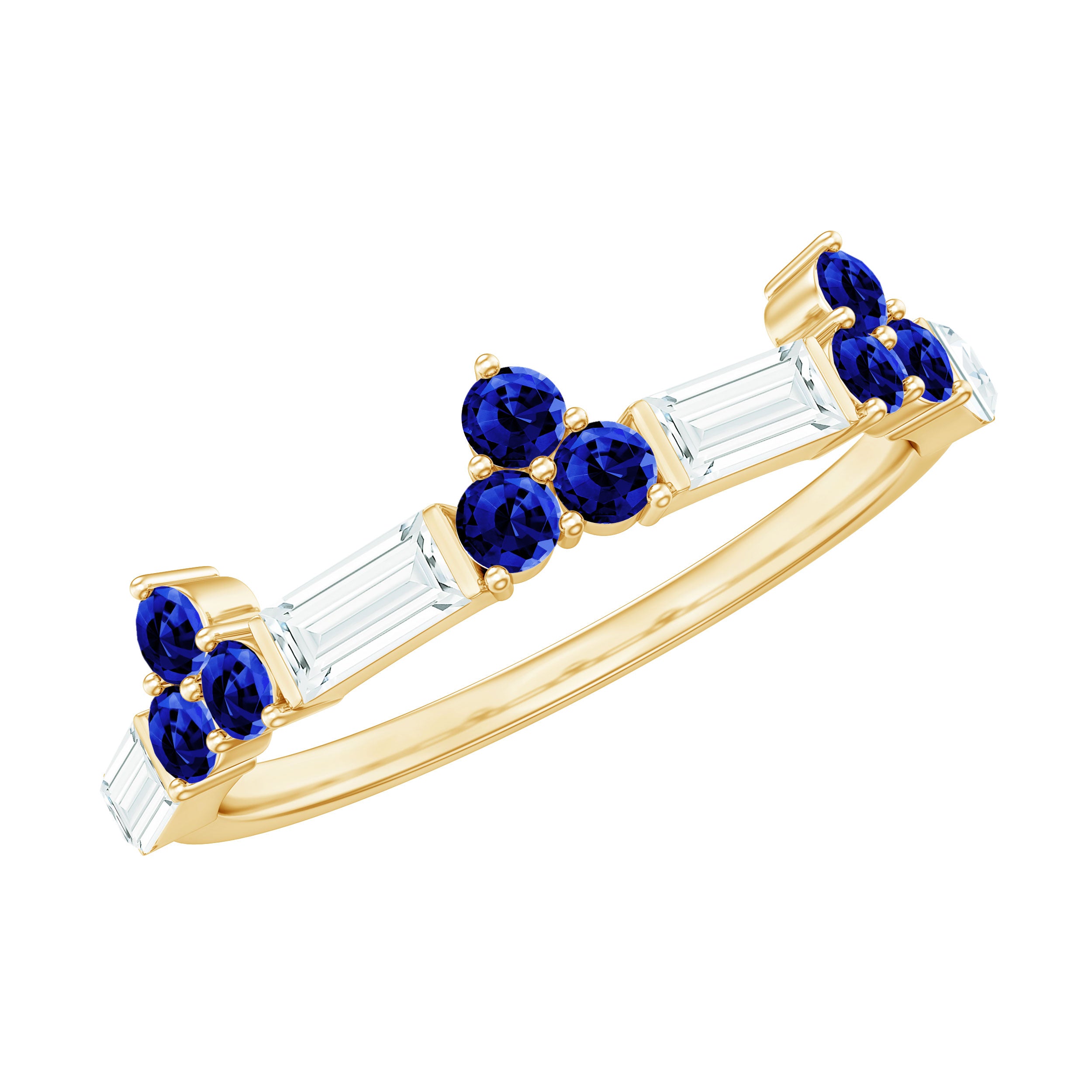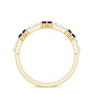 This minimal wedding band features round cut created blue sapphire and a baguette cut moissanite set in beautiful gold. The simple yet striking design makes it the perfect choice for those looking for a timeless and understated piece to symbolize their love on their special day. The combination of the brilliant round cut created sapphire and the angular baguette cut moissanite creates a unique and eye-catching look that is sure to be treasured for years to come.