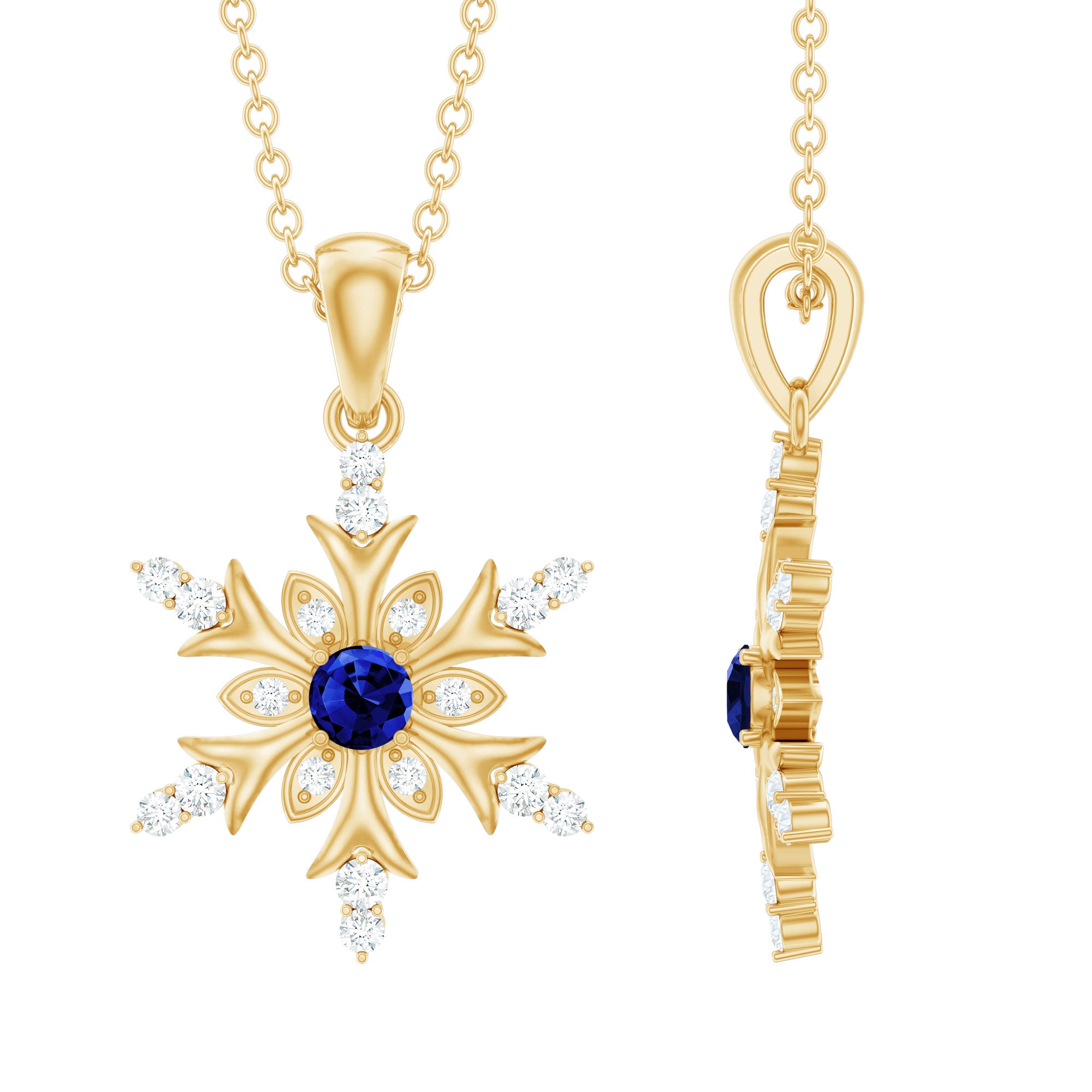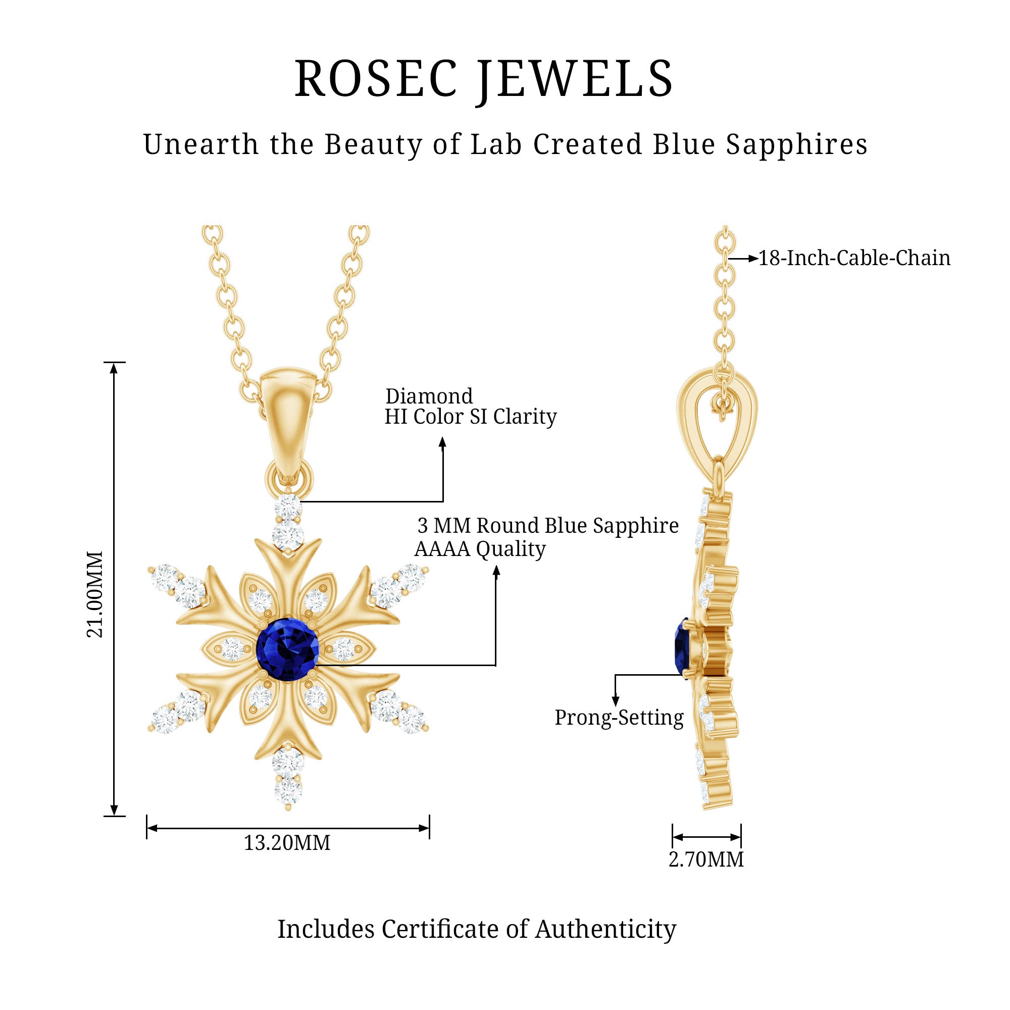 Infuse a festive and glamorous touch into your ensemble with this stunning Snowflake Necklace. Adorned with Round Shape Created Blue Sapphires and sparkling Diamond accents, this necklace exudes a radiant and joyful charm. Let this Snowflake Pendant Necklace be the perfect accessory to celebrate special occasions or add a touch of sparkle to your everyday style. Embrace the enchanting allure of this necklace and embrace the spirit of celebration and beauty.