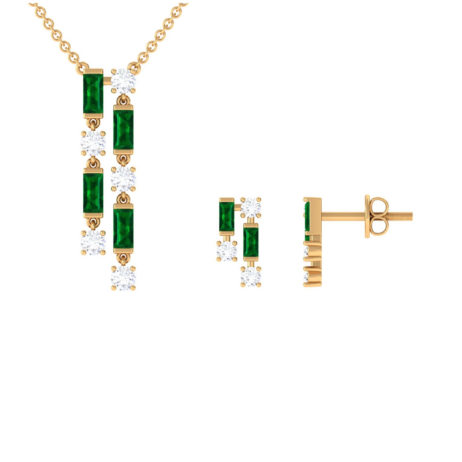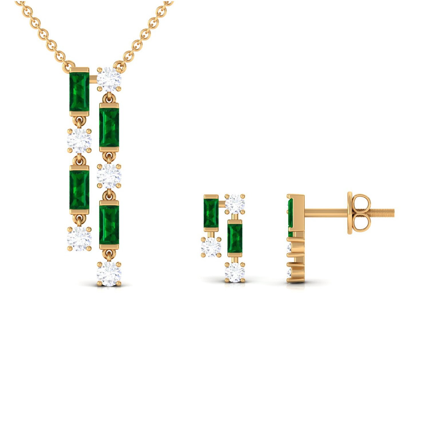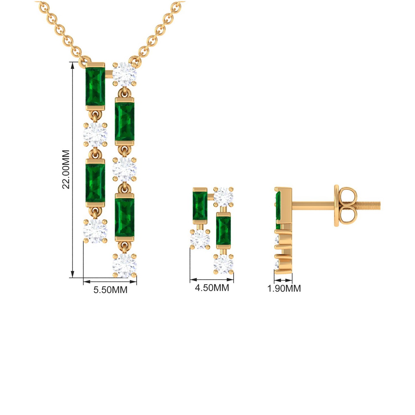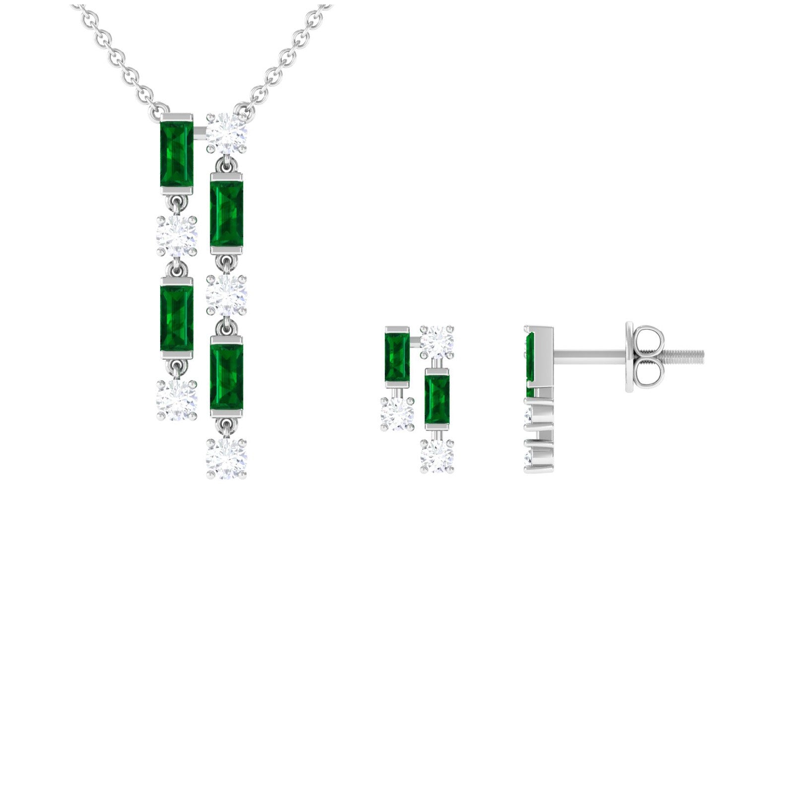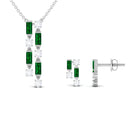 Make a statement with this beautiful Dangle Necklace and Earrings Set, featuring Baguette Cut Created Emerald in a bar setting and round Diamond stones. The intricate design and exquisite craftsmanship of this jewelry set create a stunning contrast, making it a standout piece of jewelry. This Created Emerald necklace set is perfect for adding a touch of luxury to any outfit or special occasion.