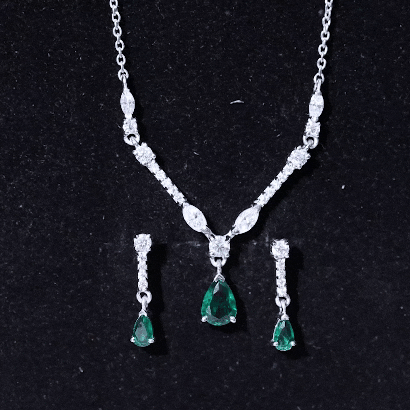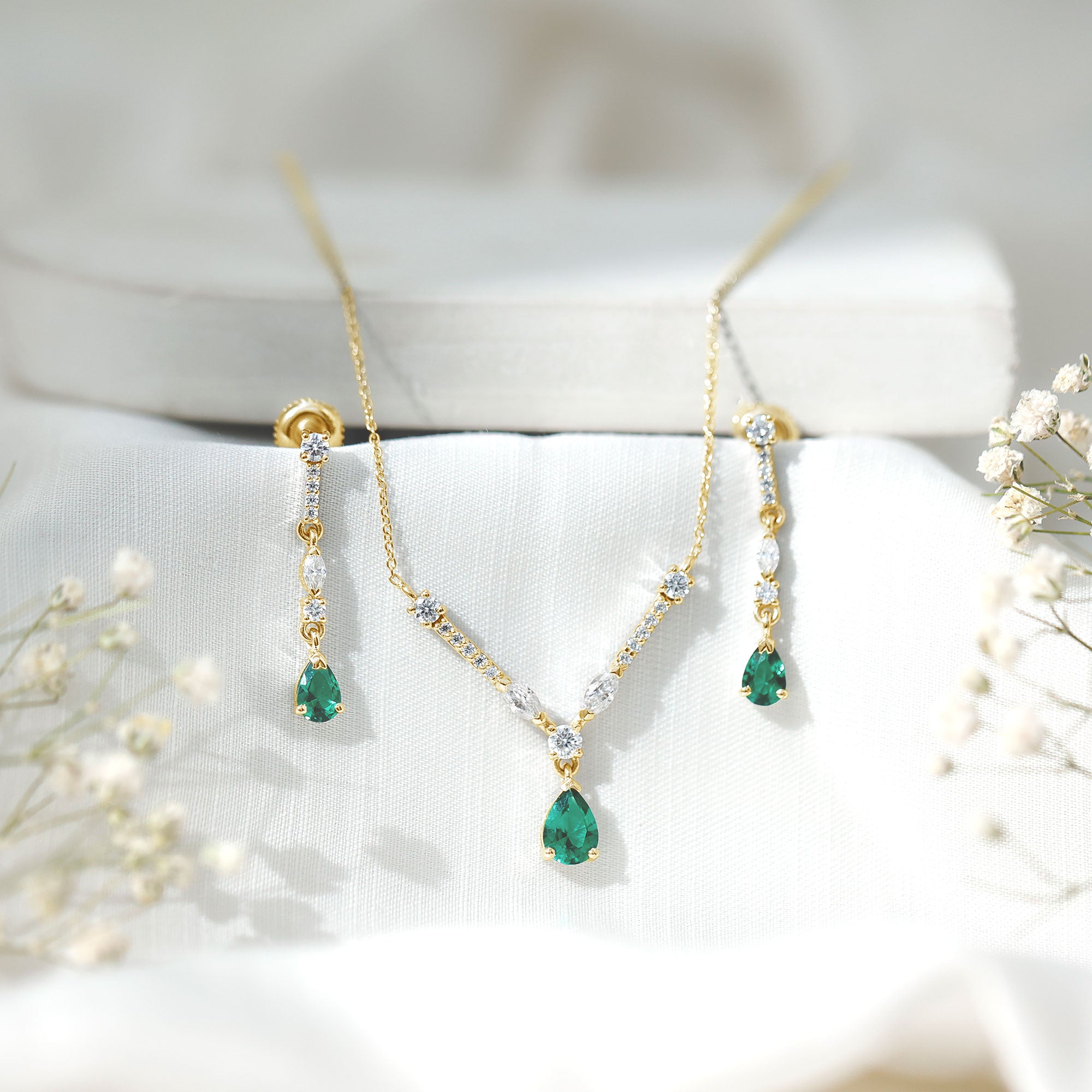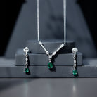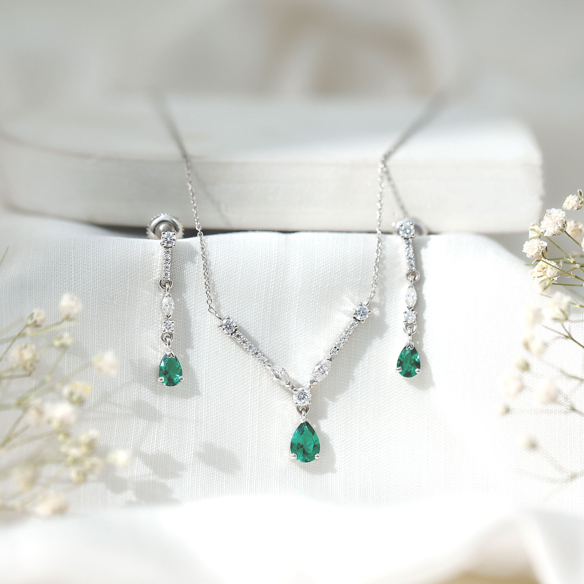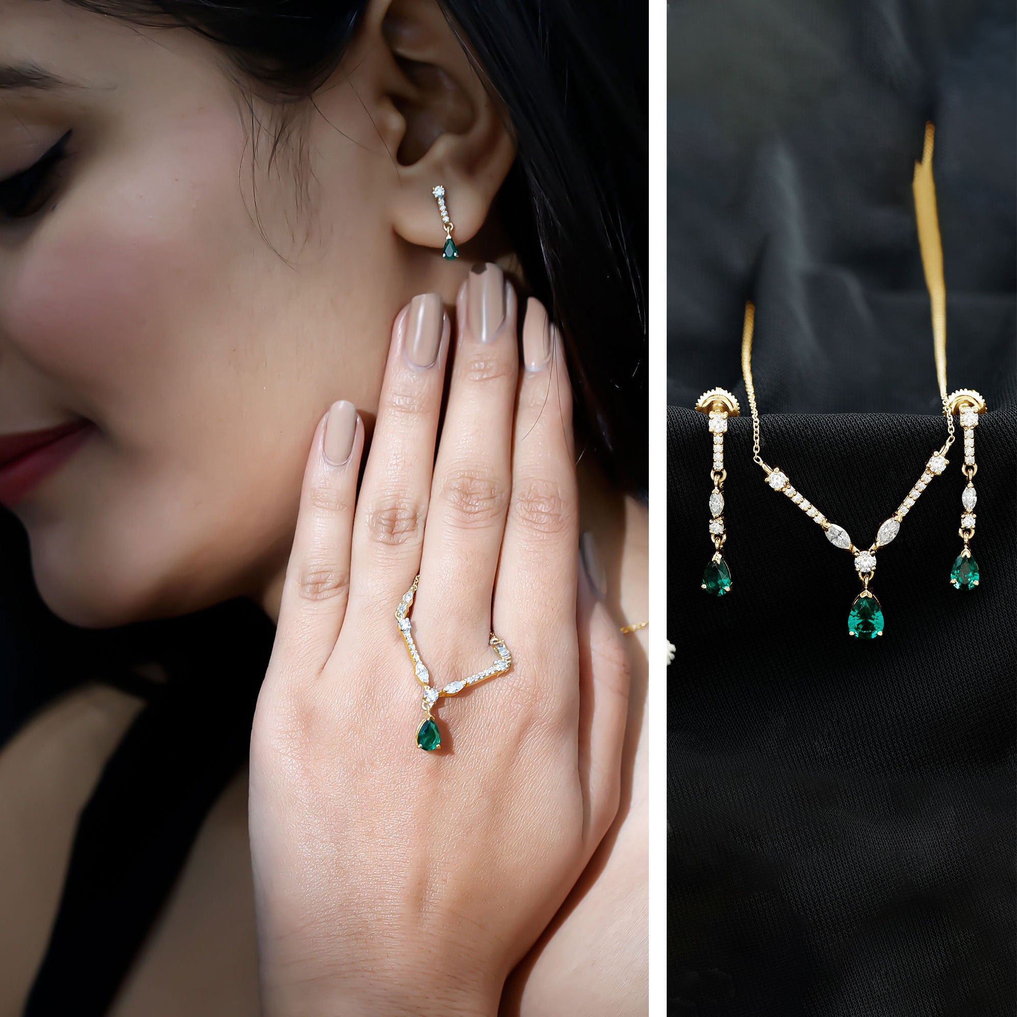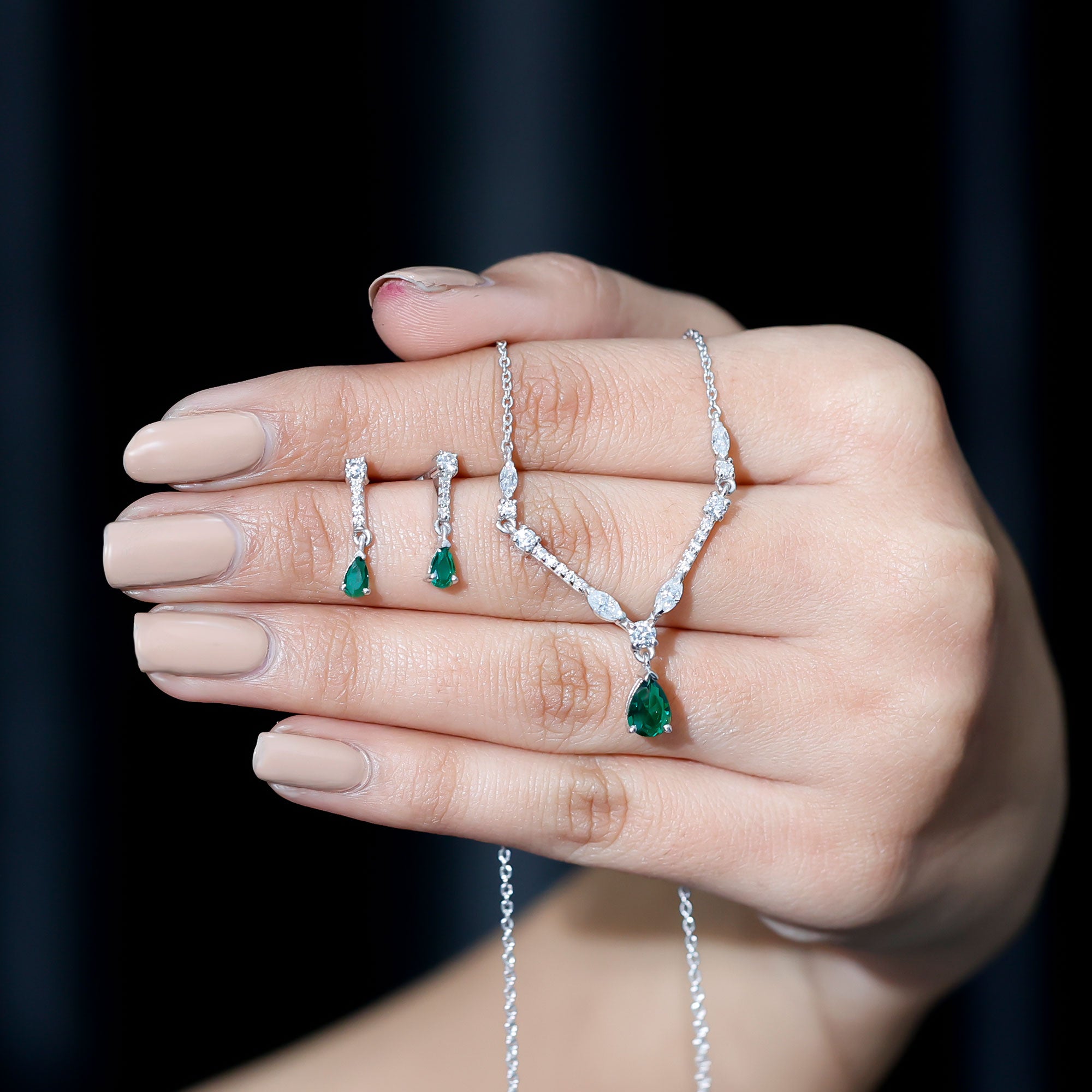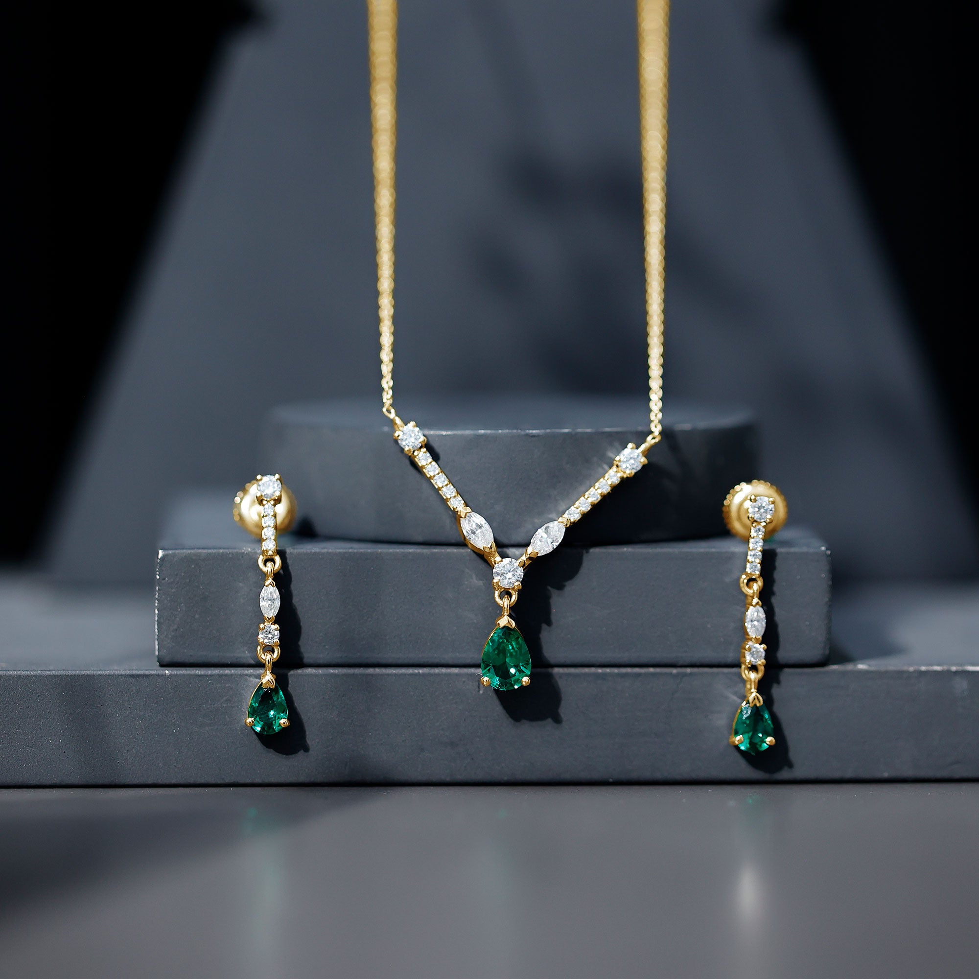 If youre in search of the perfect Necklace Earrings jewelry set to grace your bride-to-be on your wedding day, your search ends here. Feast your eyes on the stunning Created Emerald Jewelry Set, boasting a mesmerizing Pear Cut Created Emerald stone in a reliable Prong Setting, accentuated with glistening Moissanite on both the pendant and drop earrings. This drop jewelry set is guaranteed to create an impression.