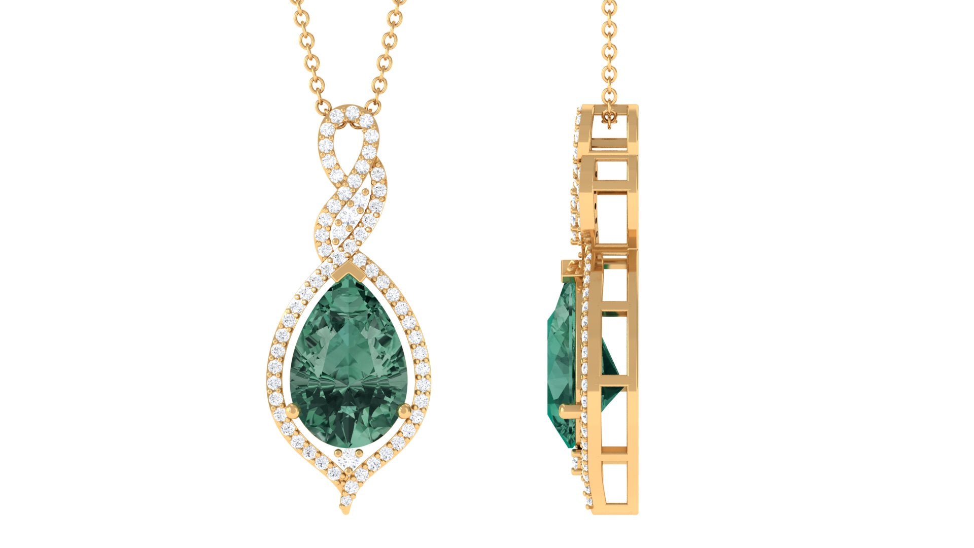 Experience the captivating elegance of this Teardrop Pendant, featuring a gracefully suspended pear-shaped created green sapphire. Its enchantment is further enhanced by a radiant infinity design, while round moissanite stones lovingly embrace and illuminate the enigmatic hue of the center stone. With its exquisite beauty, this pendant necklace is sure to captivate attention wherever you go, leaving a lasting impression.
