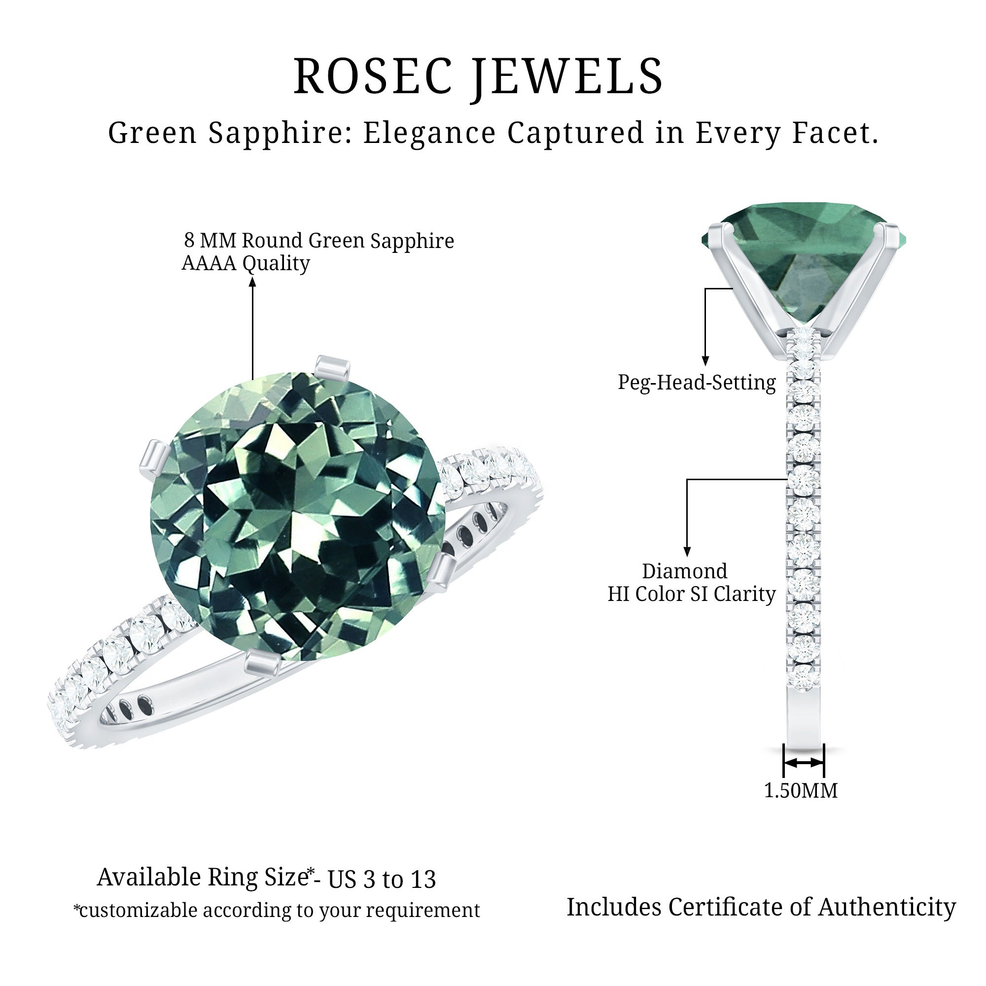 Make a lasting impression with the gift of this breathtaking Solitaire Engagement Ring, a moment that will be cherished eternally. This exceptional engagement ring showcases a round-cut created green sapphire, elegantly set in a peg head setting, accompanied by shimmering Diamond side stones.