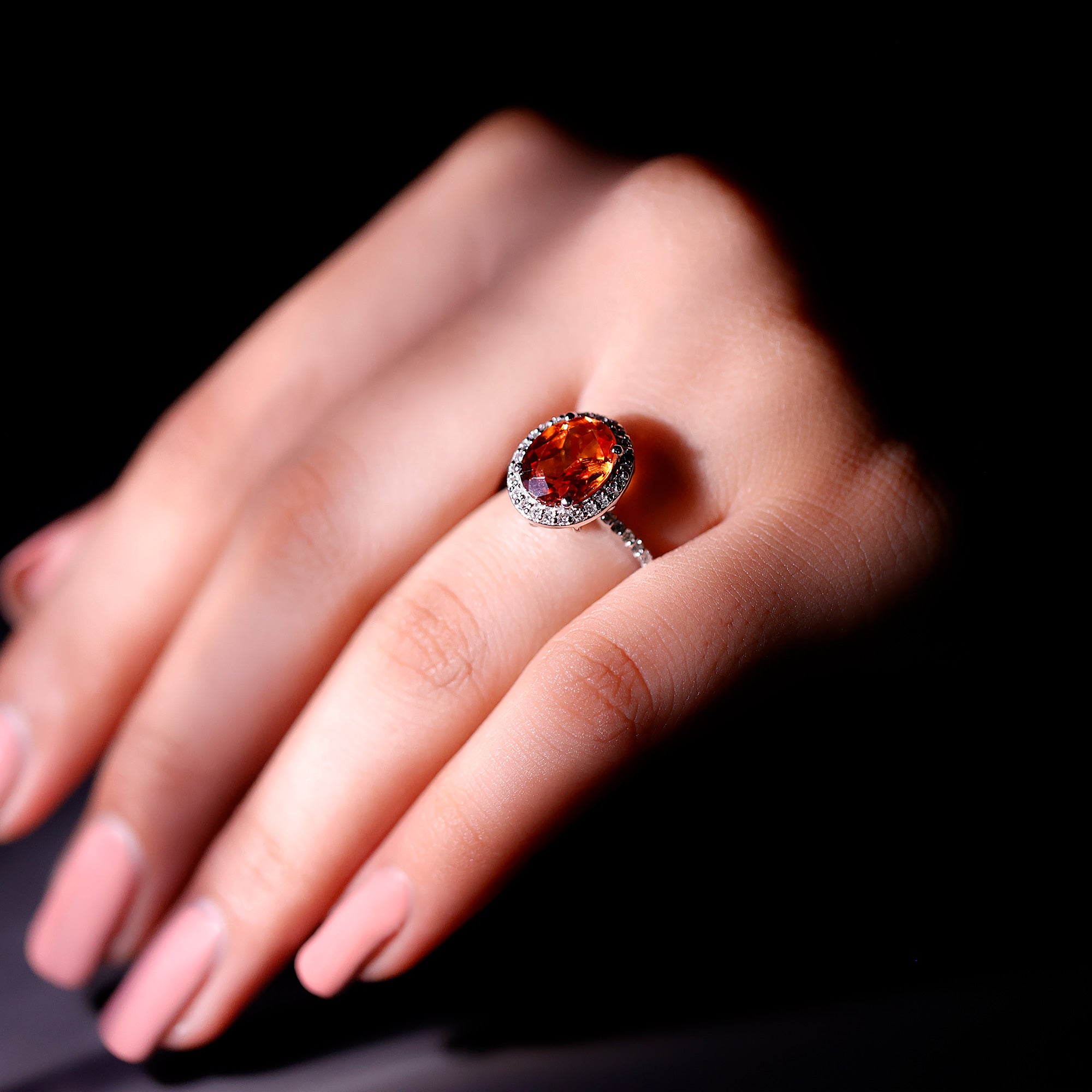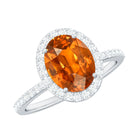 Cherish every moment, with this Halo Engagement Ring. Embellished with Oval Cut Created Orange Sapphire secured in Prong Setting while Round Shape Diamond studded as Halo and on the shank. The Created Orange Sapphire Ring exhibits an alluring design to complement your beautiful dress effortlessly. It is certain that the Oval Ring will leave your beloved speechless and bring tears of joy and happiness to her eyes.