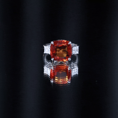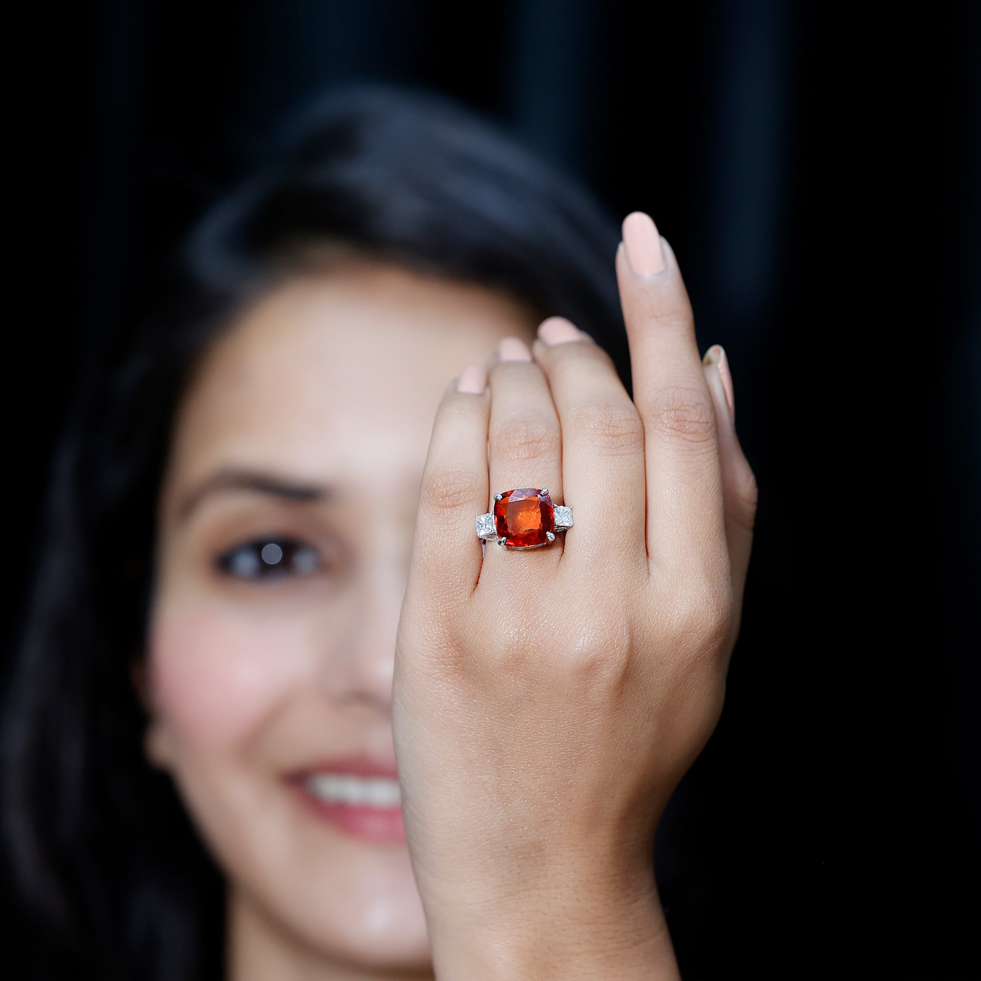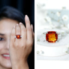 The simple yet stunning Engagement Ring is embellished with Cushion Cut Lab Created Orange Sapphire in Claw Setting while Princess Cut Moissanite, studded on either side of the center stone. . The Created Orange Sapphire Ring has classic beauty and gorgeous design elements that elevate your jewelry collection. Surprise your lady love with this Statement Ring and make her shine like a diva.
