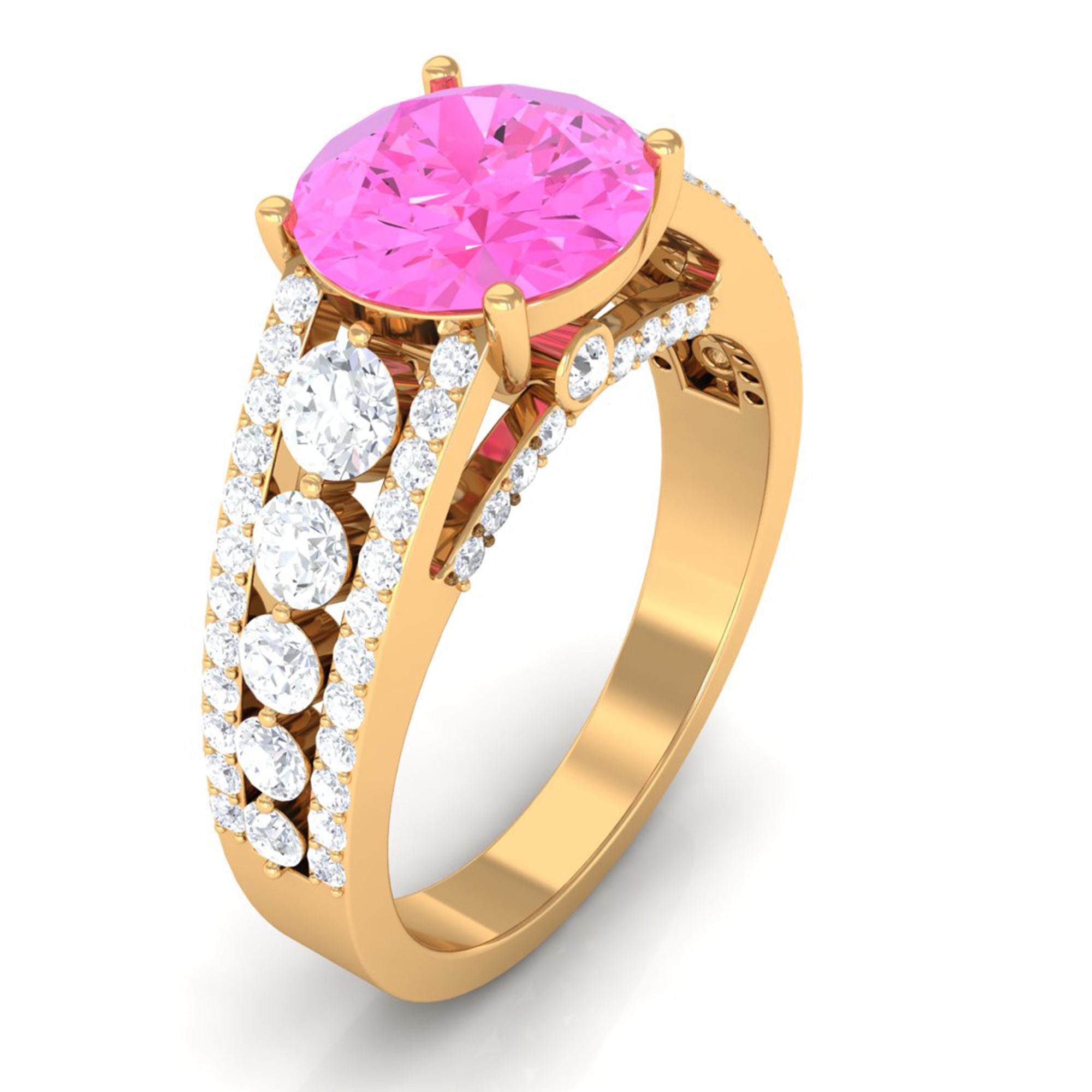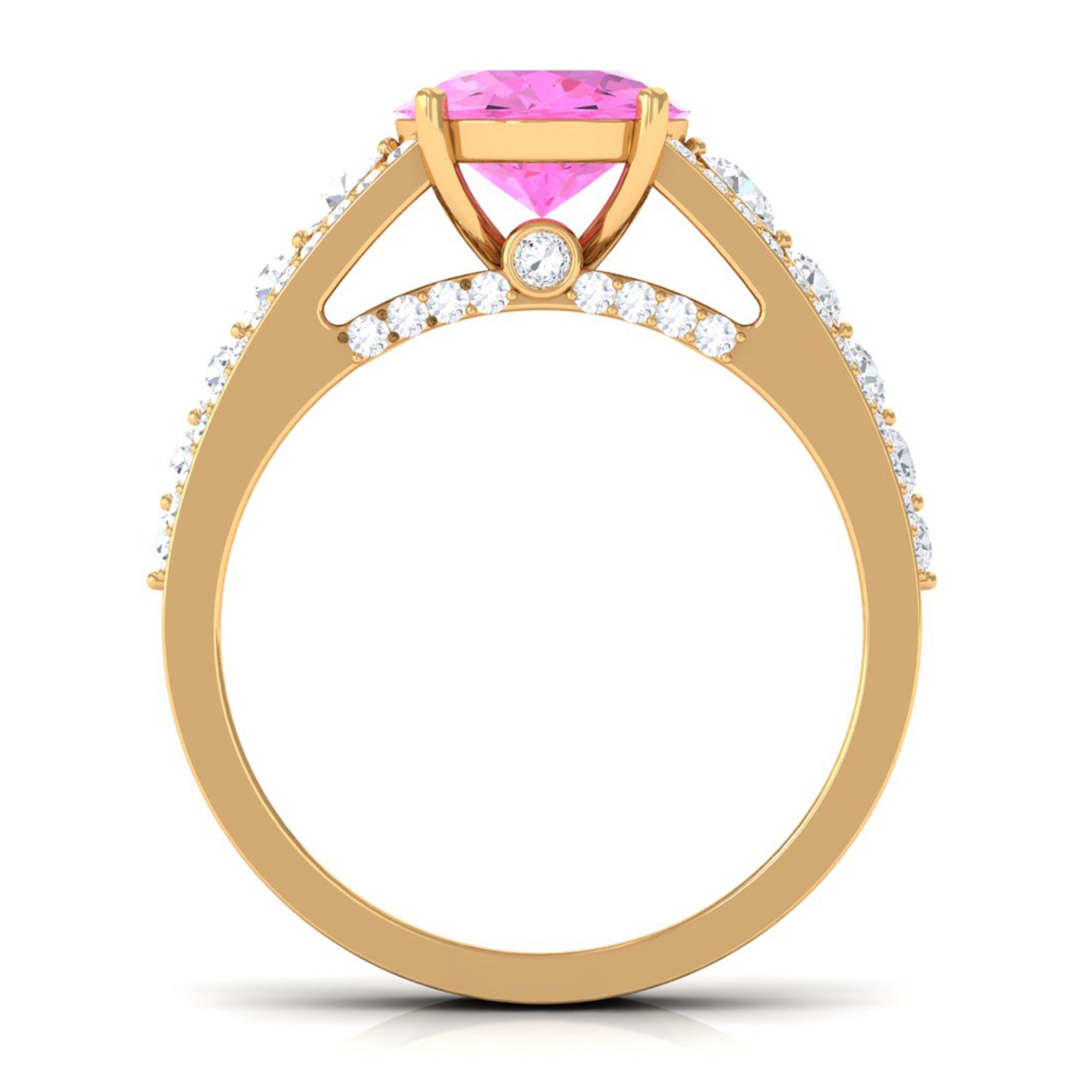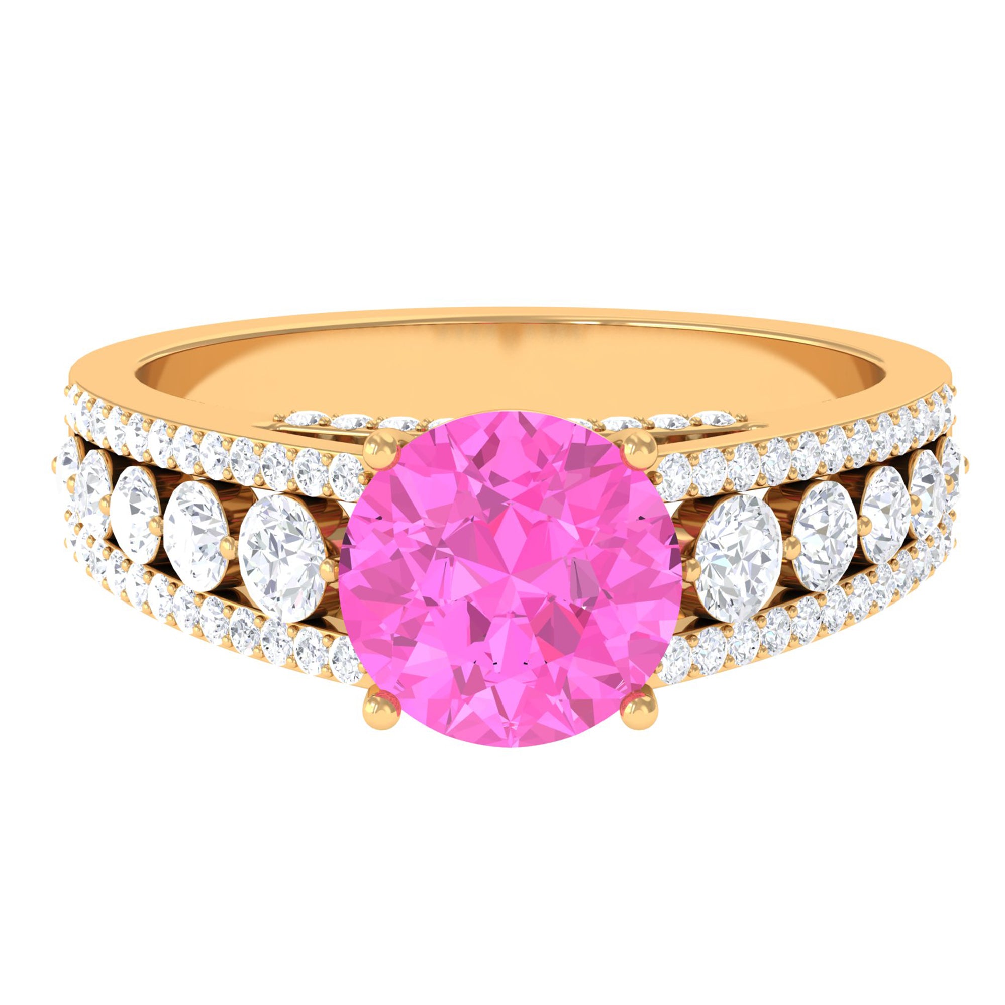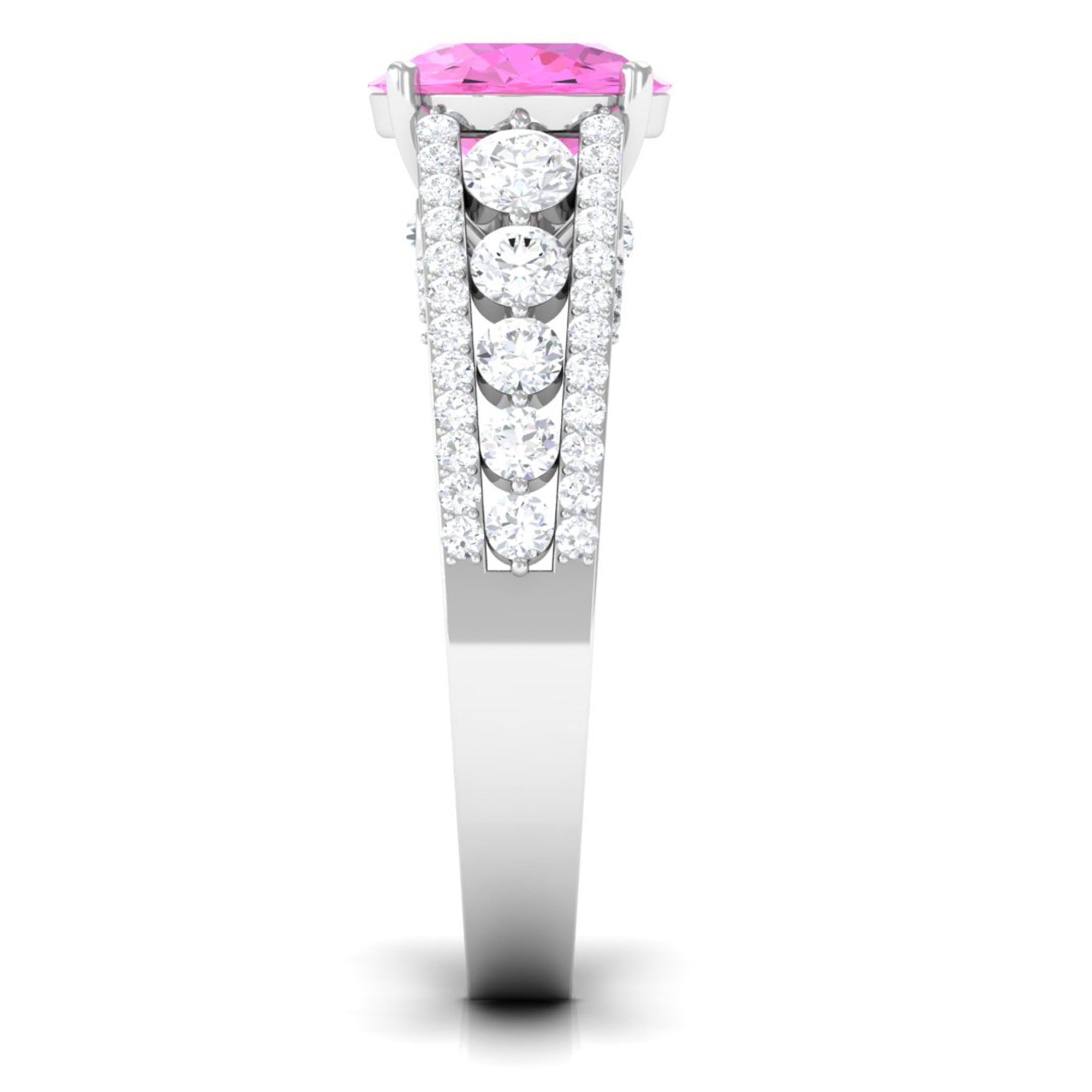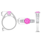 An eye-catching Engagement Ring for the bride-to-be! Featuring Round Shape Lab Created Pink Sapphire as the centerpiece secured by 4 Prong Setting, additional Round Hidden Moissanite sparkles across the bridge. Graduated size Moissanite line the center of the shank while two rows of Round Moissanite line each side of the band. Declare your feelings for your partner by getting this Created Pink Sapphire Ring, as she will never keep it away from herself.