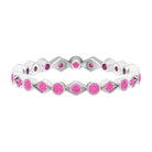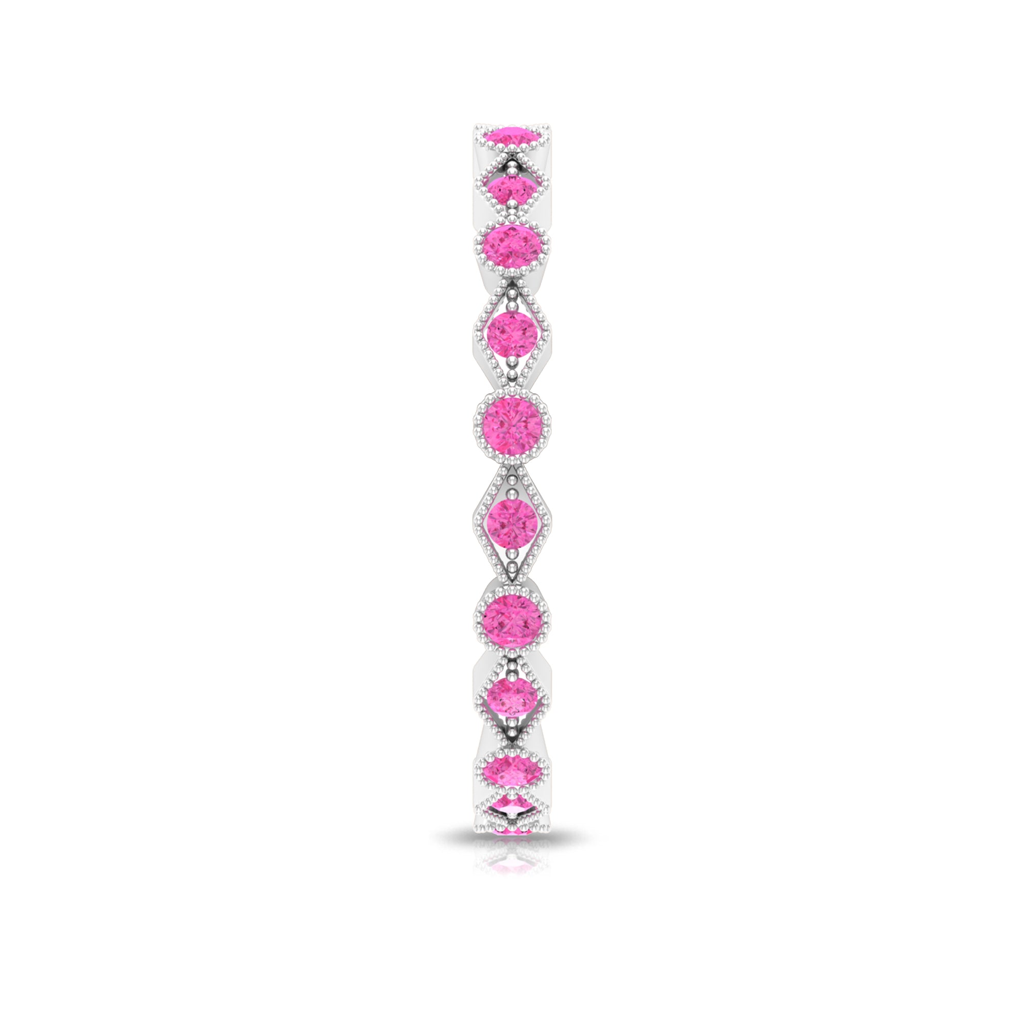 Combine this Fine Jewelry piece with your celebration attire to double the Joy. This unique Stackable Eternity Ring is embellished with Round Shape Created Pink Sapphire set on the entire ring in an alternate setting pattern. The solid Gold Ring is decorated with Gold Beaded Detailing.