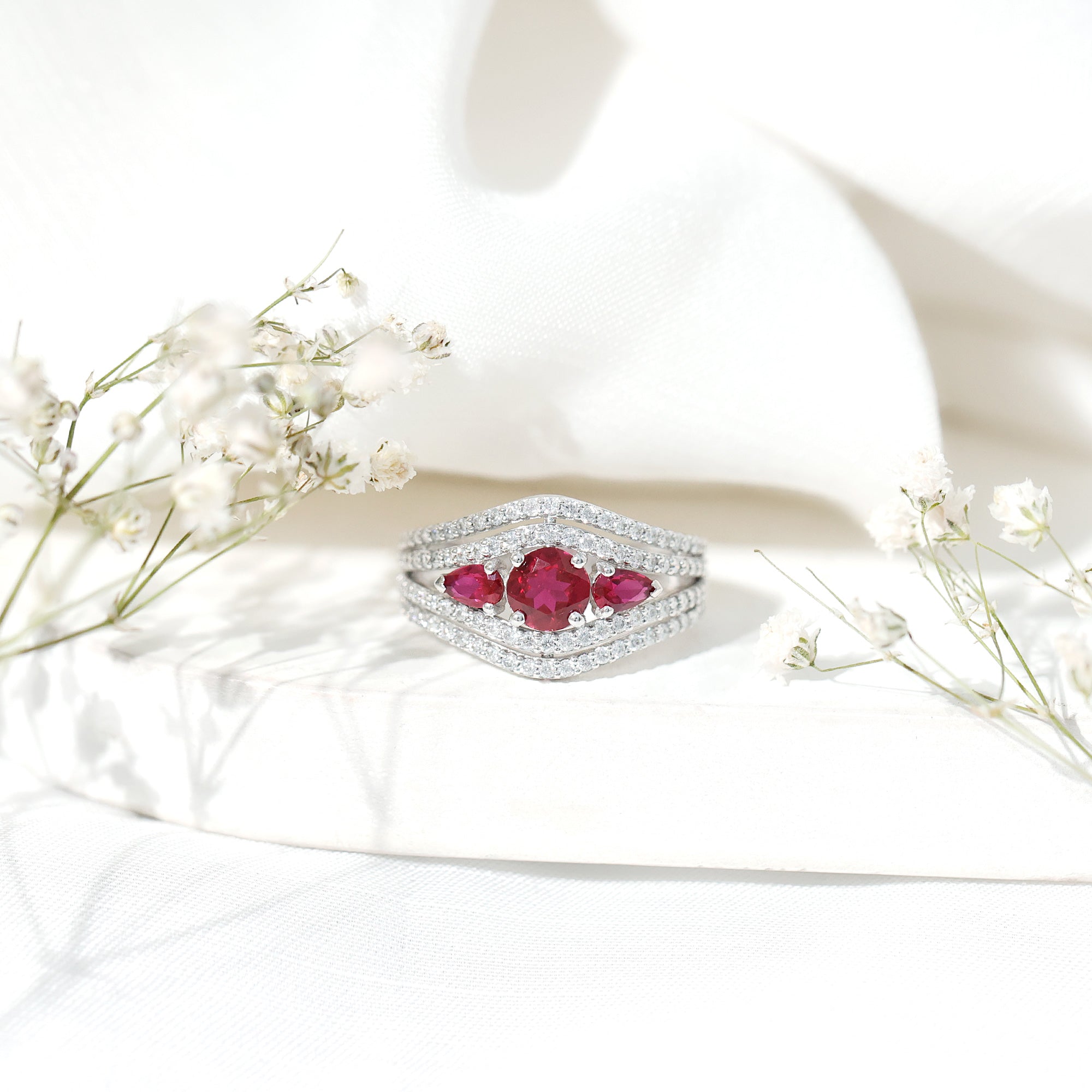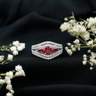 Created Ruby 3 Stone Engagement Ring With Moissanite