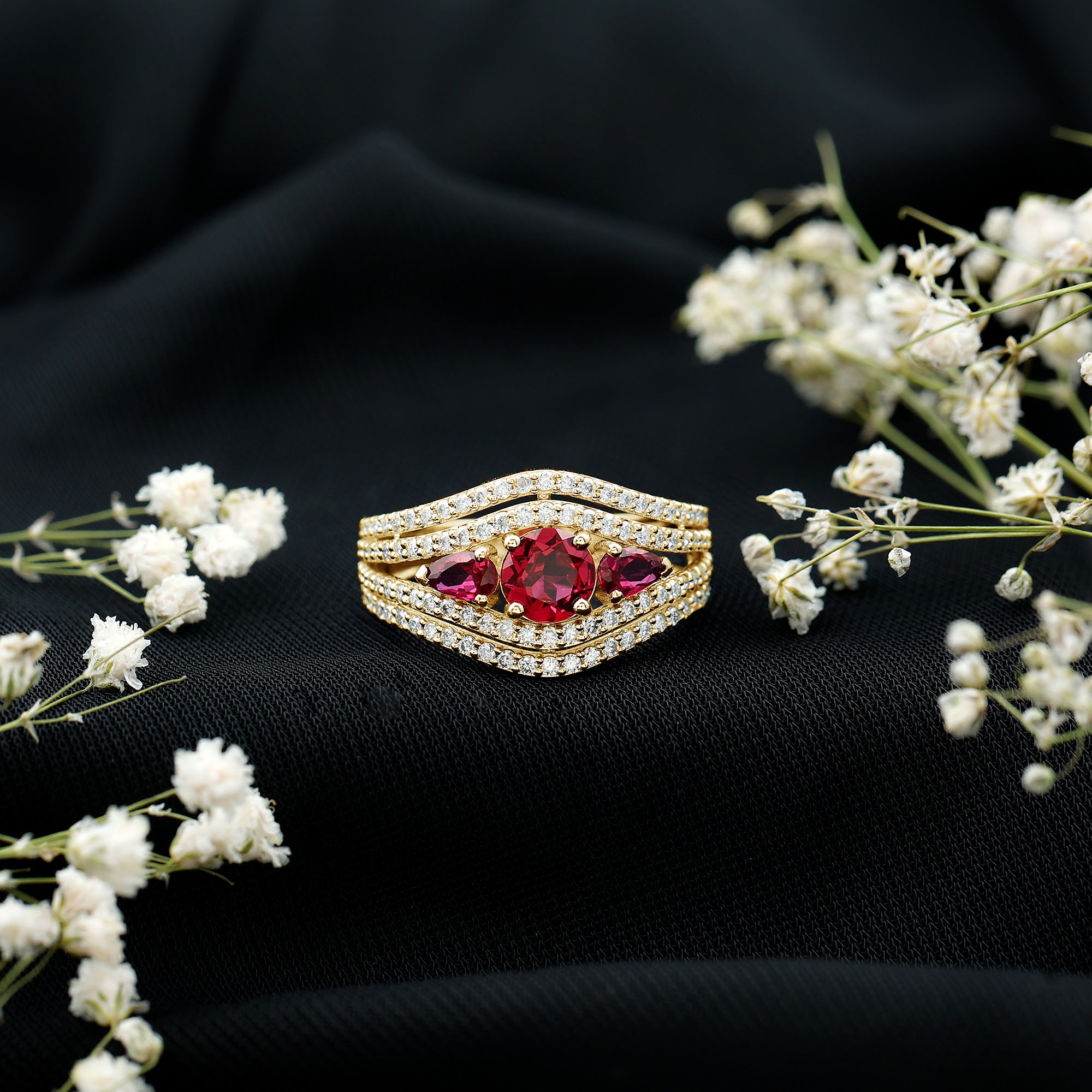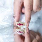 Let this stunning Ruby 3 Stone Engagement Ring be the symbol of your everlasting love. Features a trio of round and pear shape lab created ruby exquisitely held in prong setting. Sparkling round-shaped moissanite glistening on the shank for a unique and eye-catching look. Crafted to attention, the three stone ring is a masterpiece that she will cherish forever. The captivating red allure of rubies with the eternal shine of moissanite makes this ruby ring gold absolutely stunning.