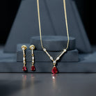If youre searching for the perfect jewelry set to adorn your bride-to-be on your wedding day, look no further than this stunning Created Ruby Jewelry Set. With a gorgeous Pear Cut Created Ruby stone set in a secure Prong Setting and accented with sparkling Moissanite on both the pendant and drop earrings, this drop jewelry set is sure to make a statement. The elegant design is both classic and modern, making it a versatile addition to any jewelry collection.
