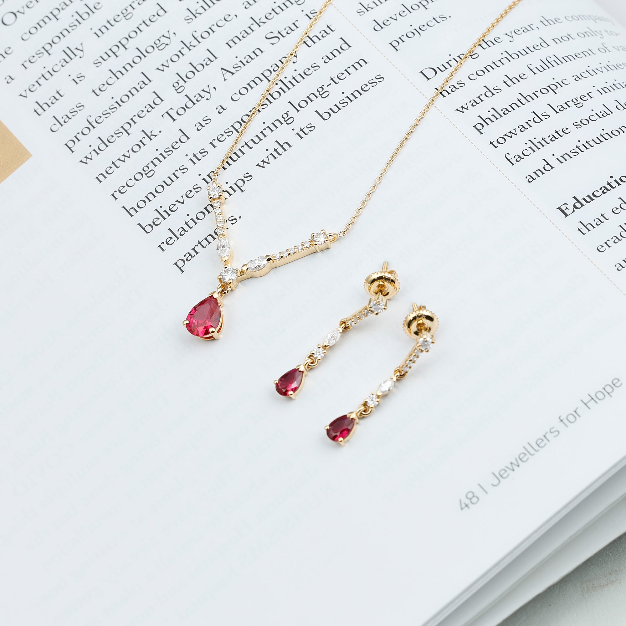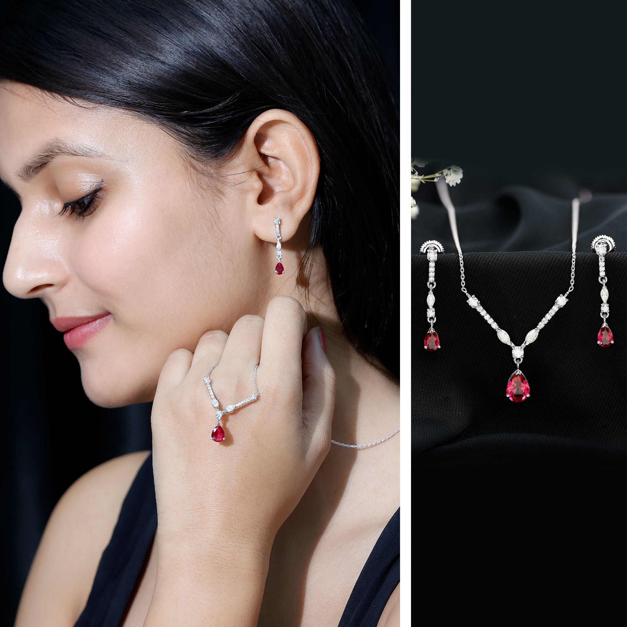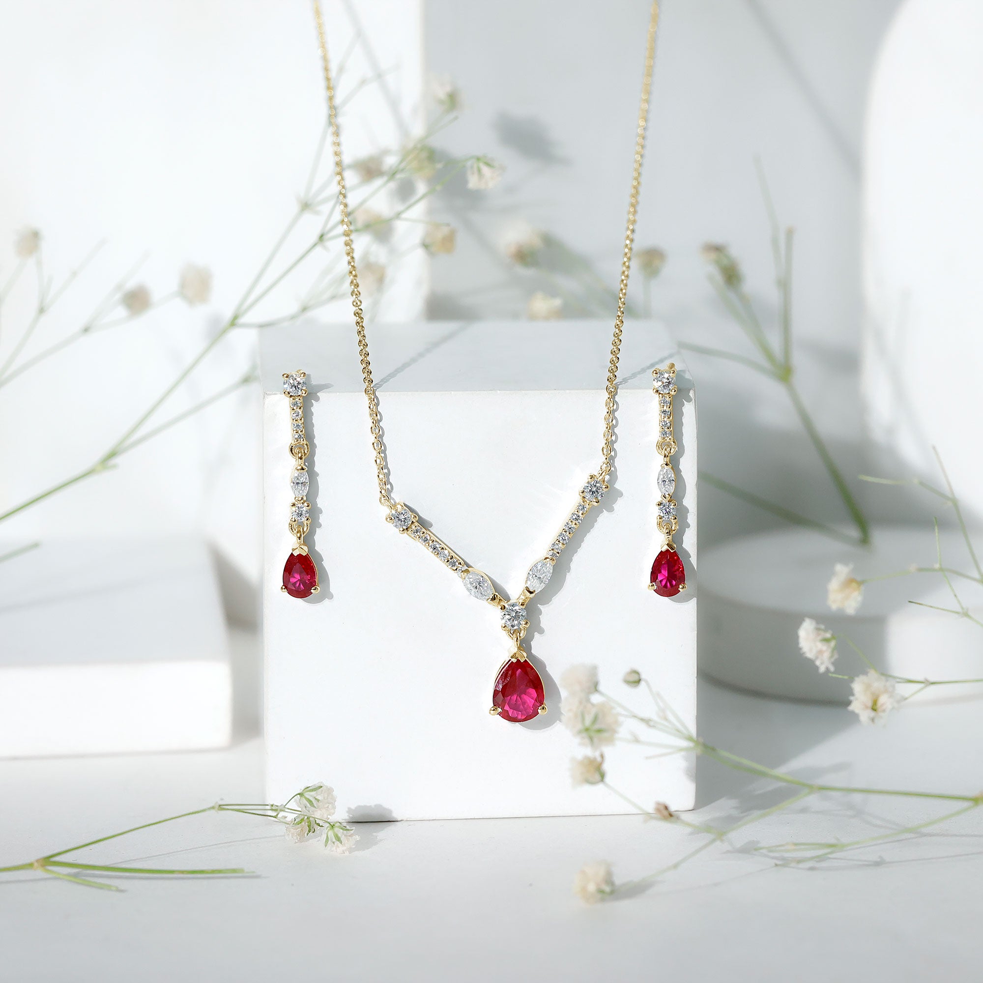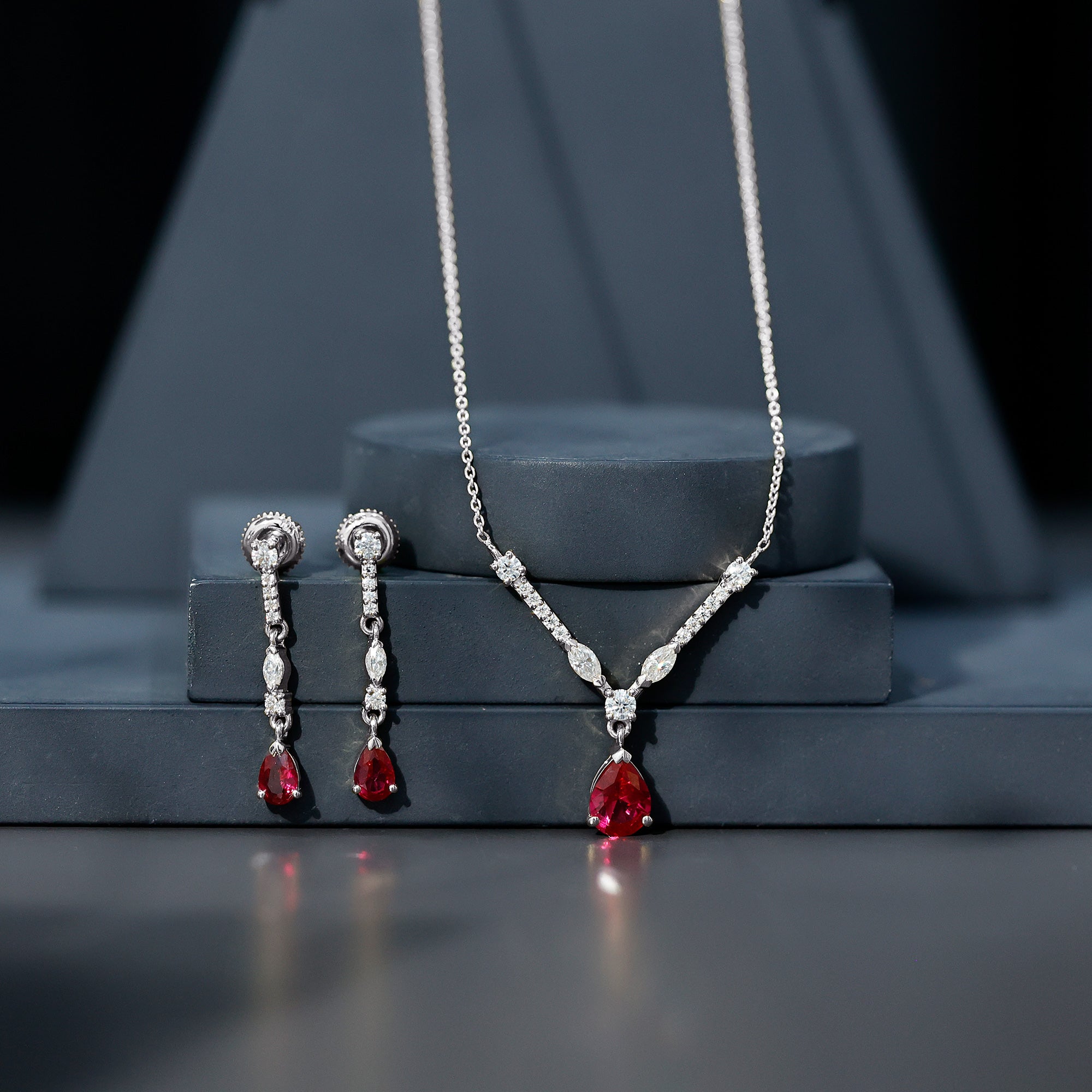 If youre searching for the perfect jewelry set to adorn your bride-to-be on your wedding day, look no further than this stunning Created Ruby Jewelry Set. With a gorgeous Pear Cut Created Ruby stone set in a secure Prong Setting and accented with sparkling Moissanite on both the pendant and drop earrings, this drop jewelry set is sure to make a statement. The elegant design is both classic and modern, making it a versatile addition to any jewelry collection.
