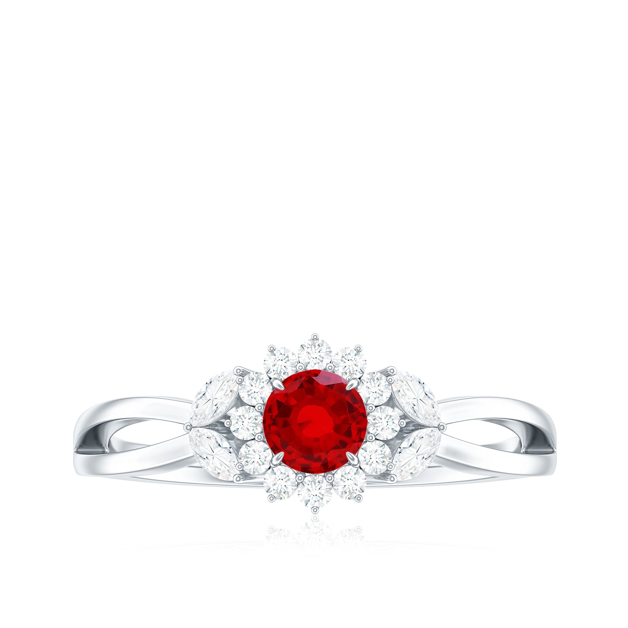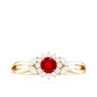 Indulge in the beauty of Lab Ruby Floral Promise Ring which is a testament to your commitment to creating exceptional jewelry for your lady love. Elevate your style and celebrate love and elegance with this Floral Engagement Ring that makes the perfect piece to adorn your finger with timeless beauty and grace. Adorned with 4 mm Round Shaped Lab Ruby in Claw Setting with the Halo of Moissanite. To create a Stunning and eye-catching design this Marquise Moissanite in the form of leaves adds a touch of elegance to this ring. In a simple yet captivating way the Split Shank on the ring adorns your romantic wedding with elegant floral and leaves. Natural themes lend to unique outcomes in jewelry, will make your engagement ring stand out from the crowd.