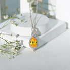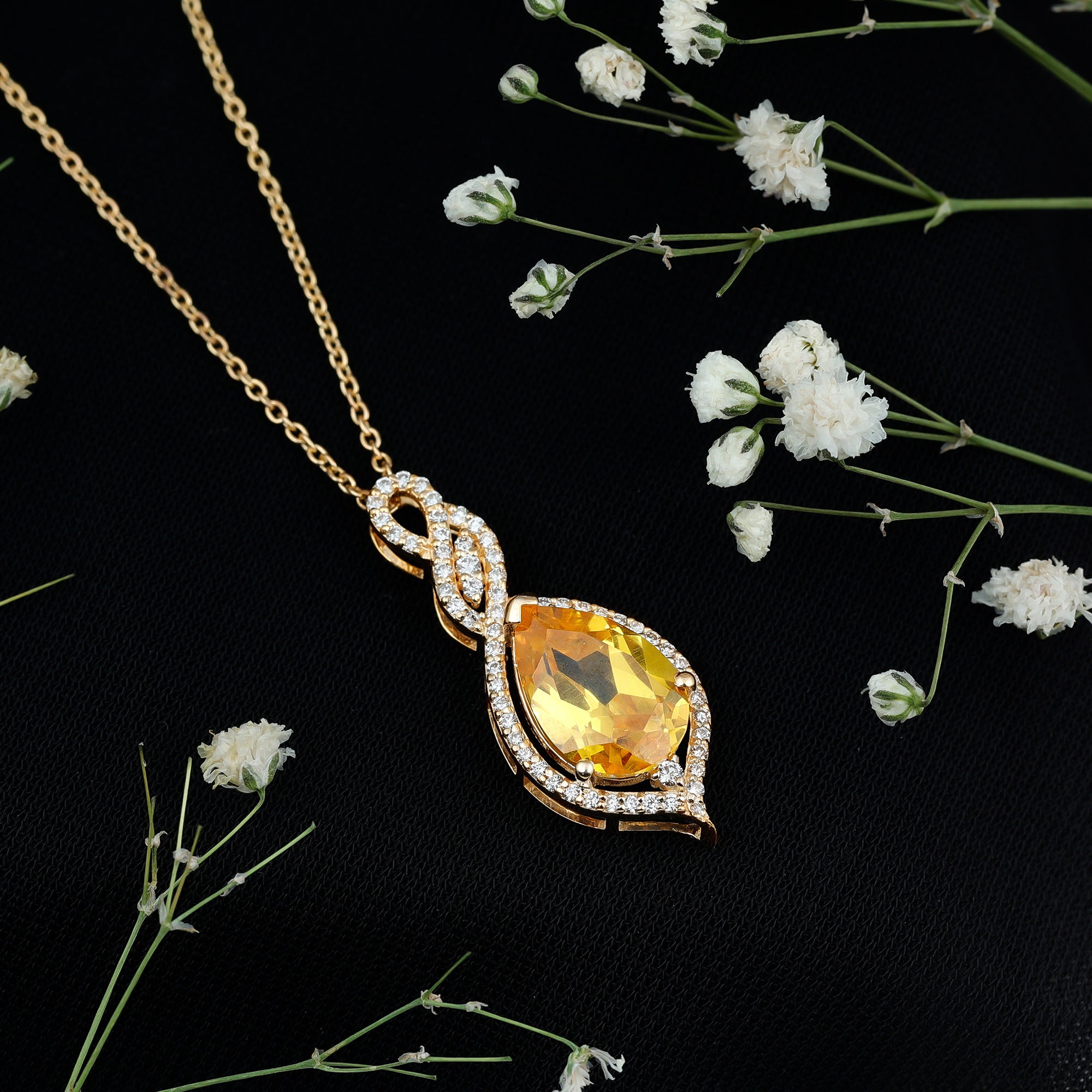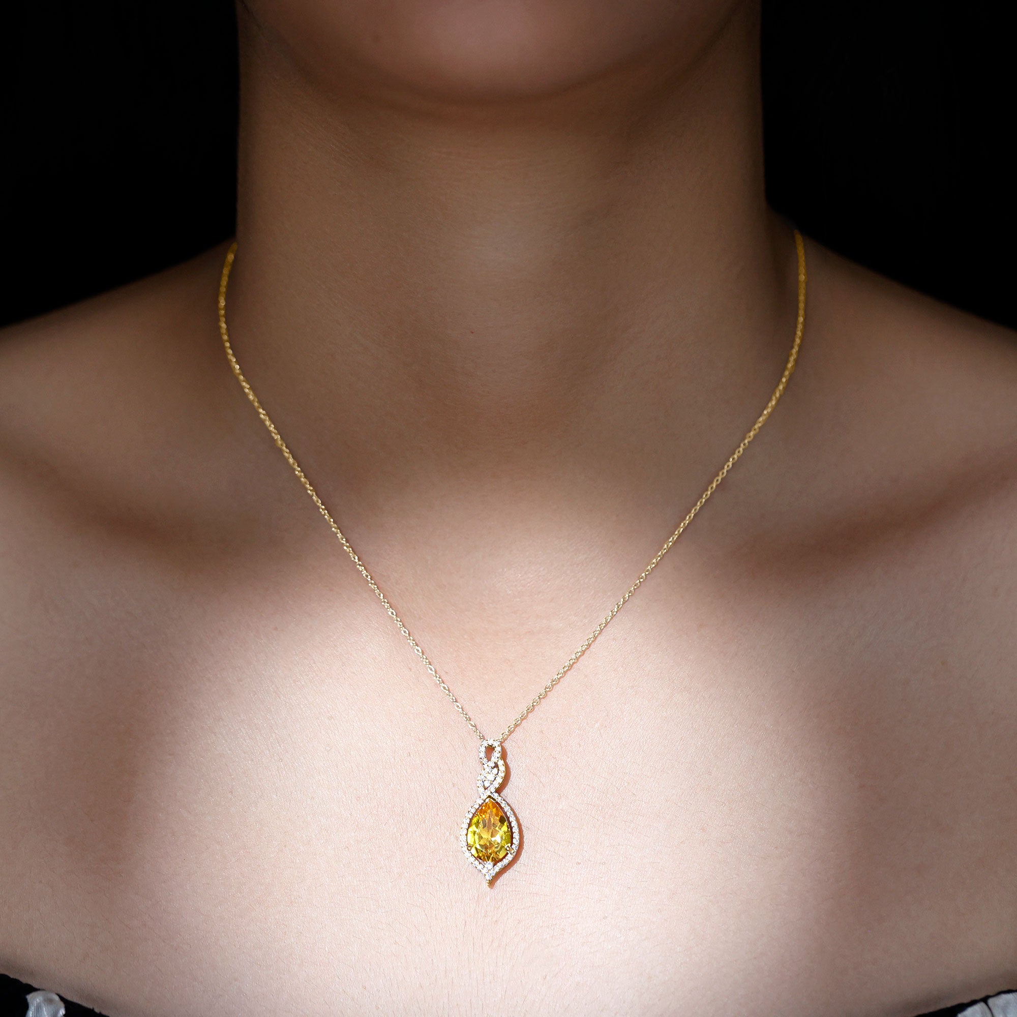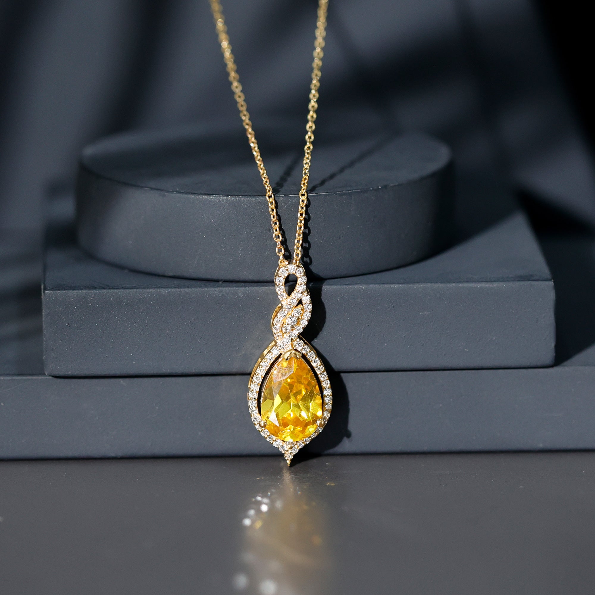 Discover the exquisite charm of the Teardrop Pendant, radiating a timeless elegance that captivates. The pear-shaped created yellow sapphire effortlessly enchants, accompanied by brilliant Diamond stones that infuse a mesmerizing sparkle. With a graceful suspension, this pendant transforms into the perfect accessory, elevating any outfit and making a resounding declaration of sophistication and grace.