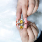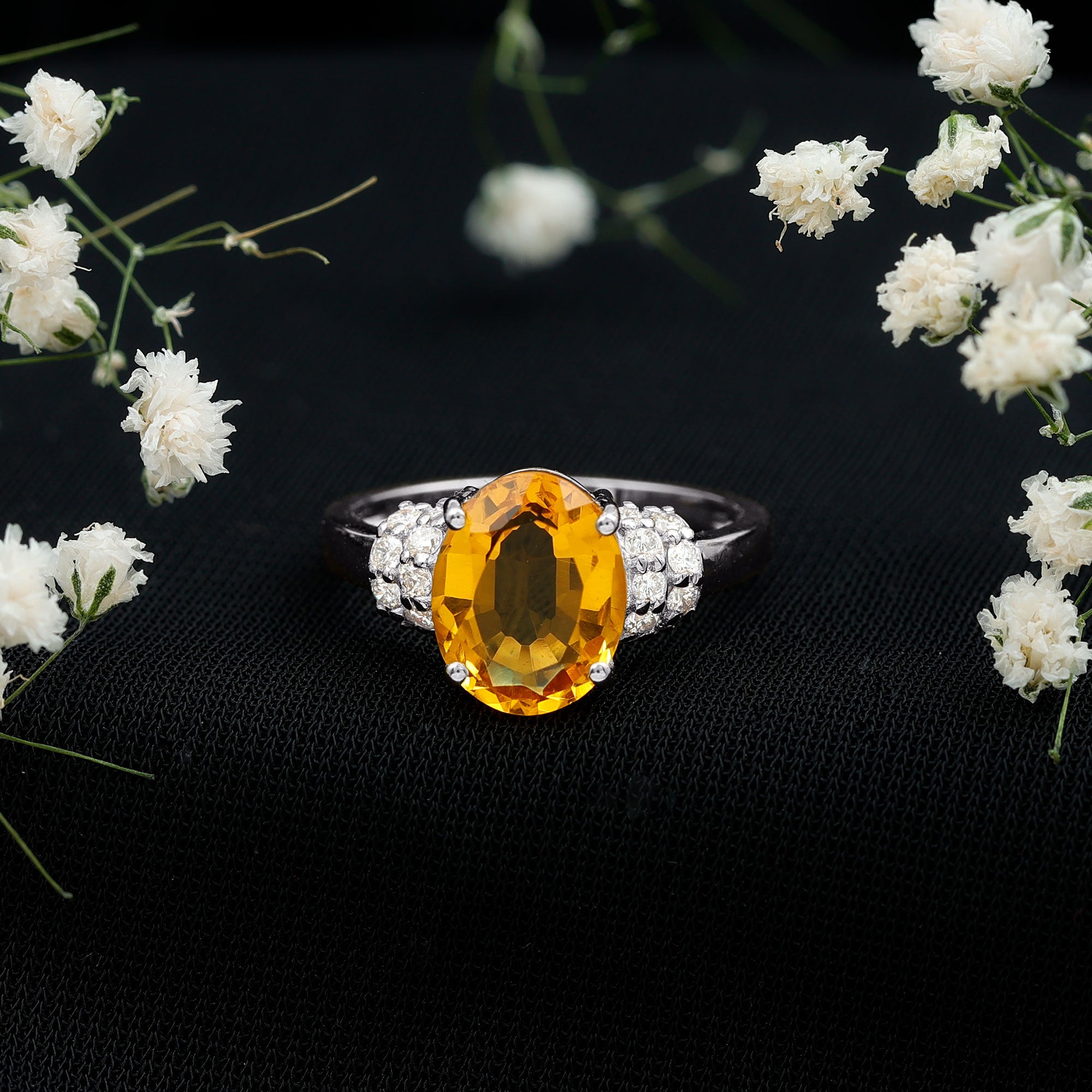 Elevate your style and make a striking impression at your special events with this exquisite Solitaire Engagement Ring. This ring features a captivating Oval Cut Created Yellow Sapphire placed gracefully on its unique shank in a prong setting. The addition of Round Brilliant Diamond stones forming a collar adds an opulent touch to this accessory, making it a must-have addition to your jewelry collection.