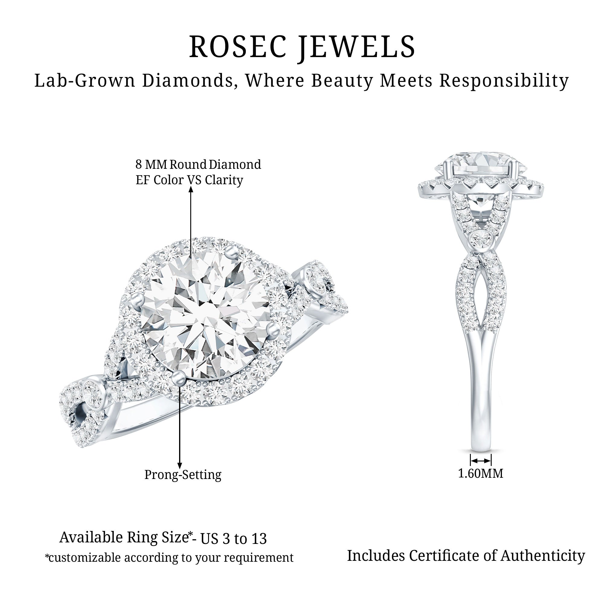 Introducing this stunning Lab Grown Diamond Engagement Ring, which perfectly combines timeless elegance with modern allure. The band of this Crossover Ring showcases two strands adorned with round cut diamonds that intertwine beautifully, creating a breathtaking criss cross effect. This classic design draws the eye with a central 8 MM round cut lab made diamond of EF-VS quality, set delicately in prongs with a diamond halo and enhanced by a surprise stone for an extra touch of sparkle. Both delightful and stylish, this 2 Carat Diamond Ring symbolizes eternal love and showcases refined taste. Its unique twist in design adds a touch of sophistication to this timeless piece. This Diamond Halo Engagement Ring is a thoughtful and budget-friendly gift for your loved one. Made with ethically sourced, lab grown diamonds, it offers the luxury of fine jewelry while being gentle on the planet. Whether you are proposing or treating yourself to something special, this Criss Cross Diamond Ring comes in a signature jewelry box and is available in US sizes 3 to 13, ensuring a perfect fit for every hand. It is perfect for celebrating a new beginning or simply conveying how much you care.