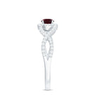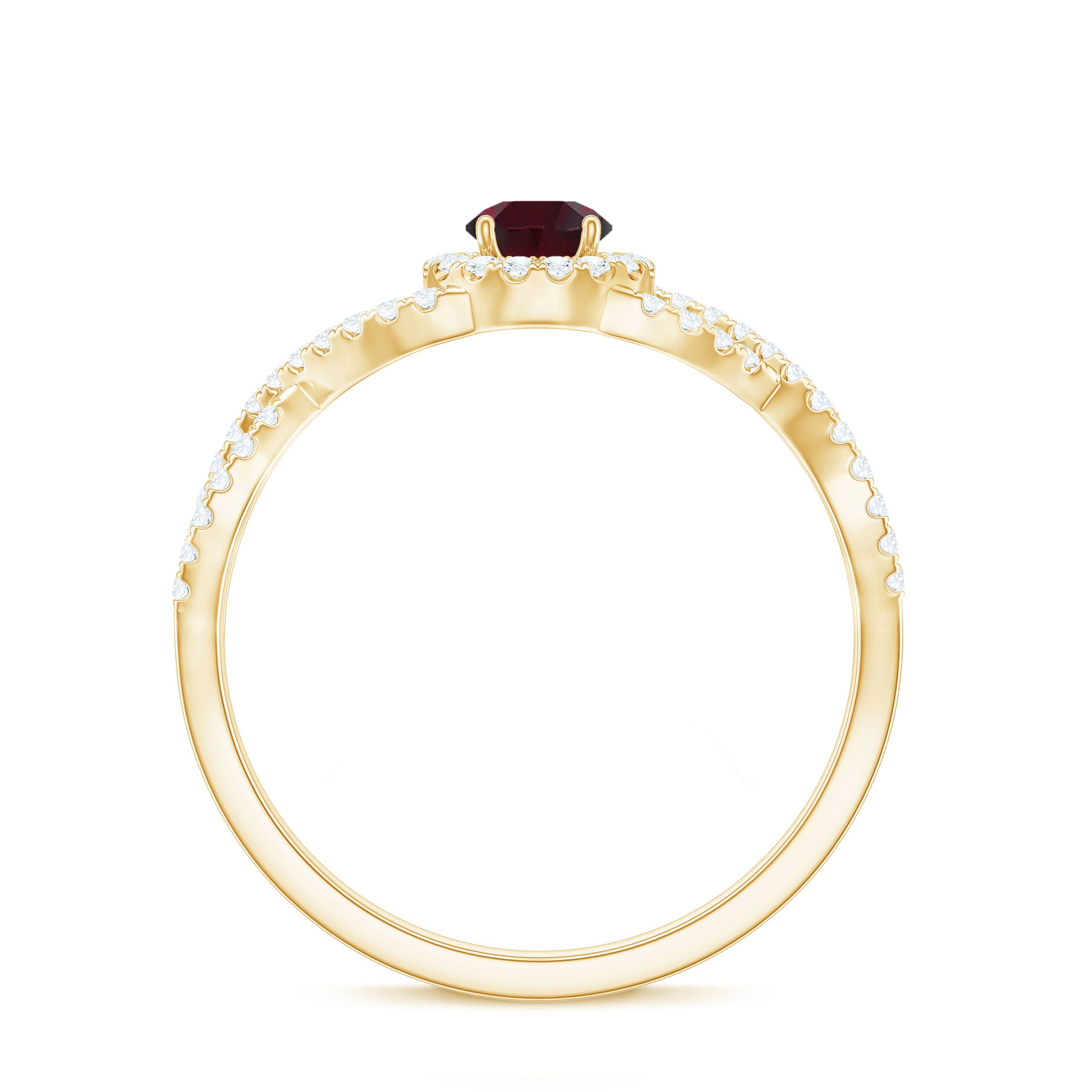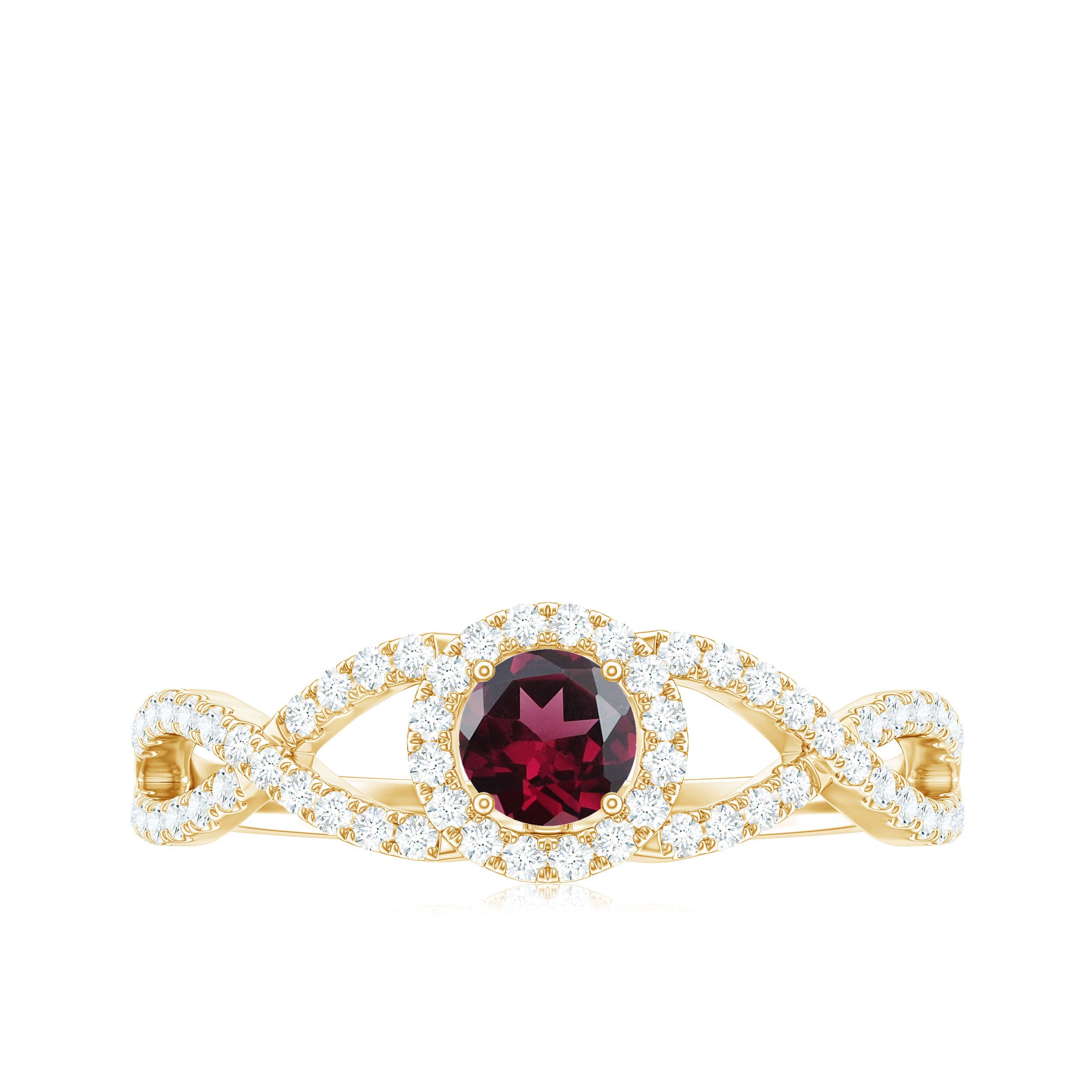 Make a statement with this Criss Cross Engagement Ring. Featuring a Round Shape Rhodolite set in a prong setting, mounted in gold and accented with Diamond stones, this ring is a stunning symbol of your love.