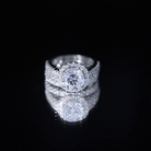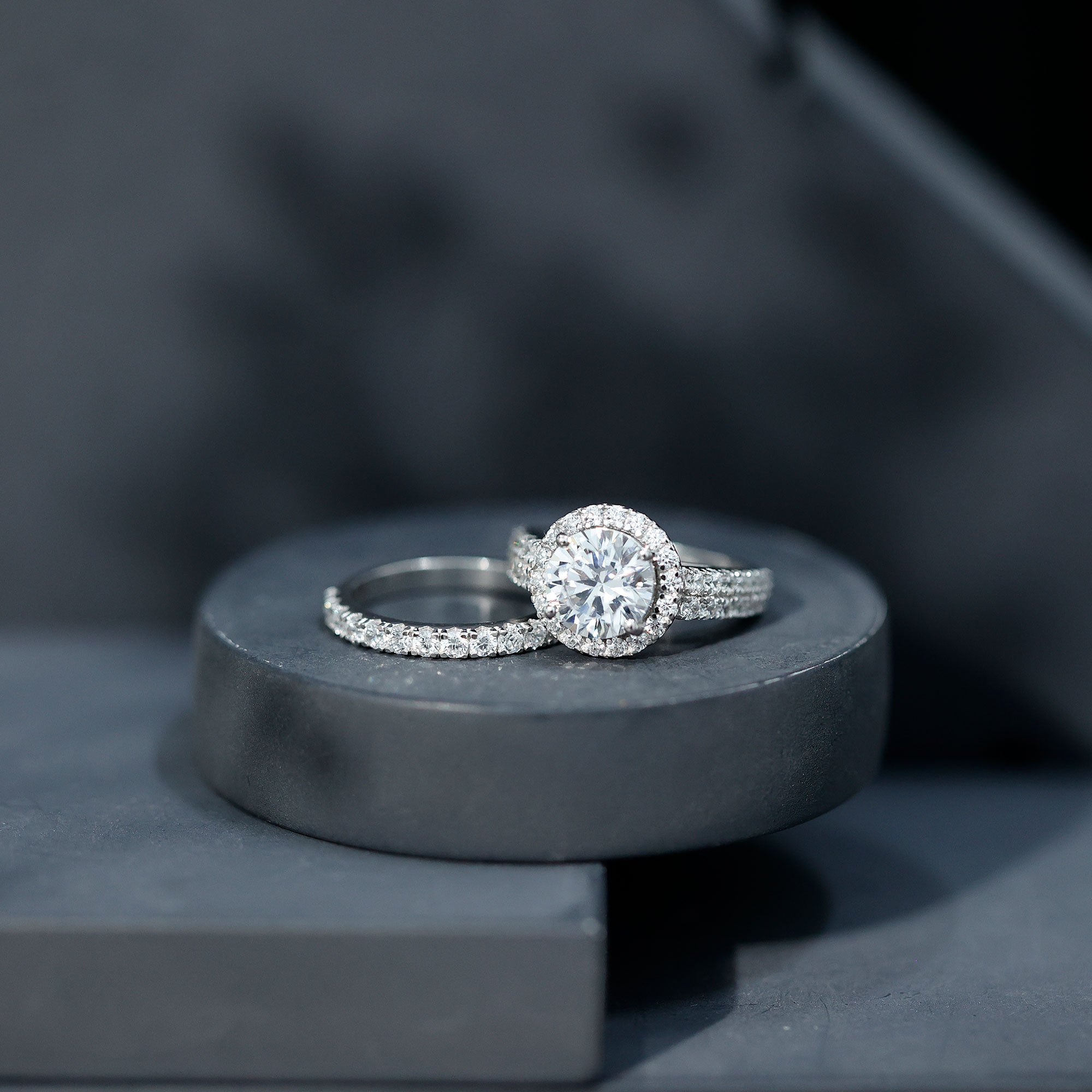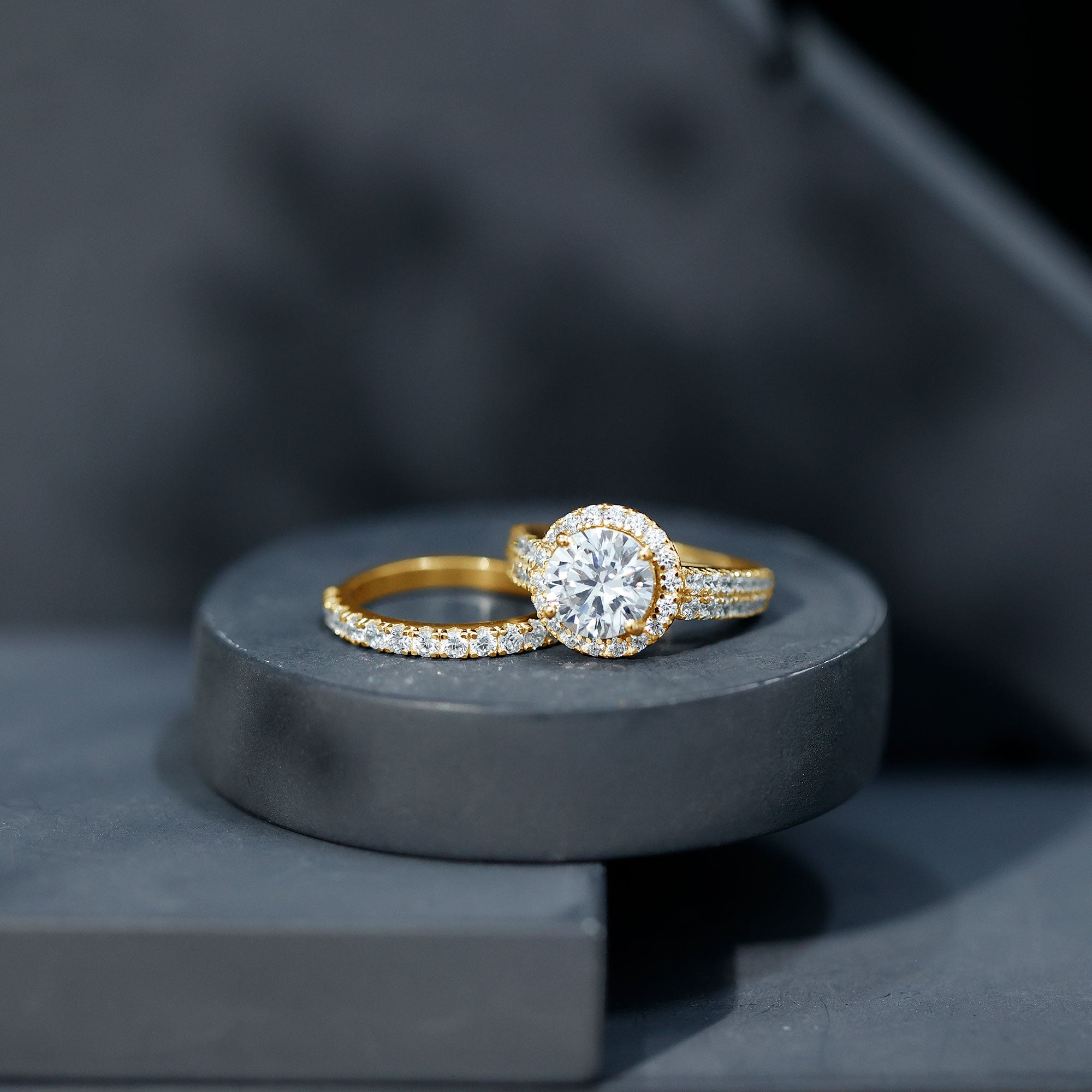 Preserve every romantic moment with the Zircon Wedding Ring Set, featuring a central Round Shape Zircon embraced by a delicate halo and side stones. This exquisite Enhancer Band Ring is also adorned with round cubic zirconia. This ensemble of Cubic Zirconia ring set will add a sparkling touch to her attire.