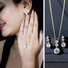 Nothing shines quite like a bride on her wedding day, and this Dangle Necklace and Earrings Set is made to match that beautiful glow. Created with soft sparkle and graceful movement, this Three Stone Jewelry Set is perfect for brides who want jewelry that feels elegant yet easy to wear. Each piece features three round zircon stones placed one after another in secure prong setting. The pendant rests on a delicate cable chain that lays comfortably on the skin, adding a bright touch to the neckline without feeling heavy. The matching earrings are designed with screw back closures, giving the bride a secure fit from the walk down the aisle to the final dance of the night. This Zircon Necklace Set blends simplicity and beauty, making it ideal for all types of bridal looks - classic, modern, minimal, or detailed. Even after the wedding, this Bridal Jewelry Set becomes a lovely keepsake. It can be worn on anniversaries, parties, or special occasions, always reminding her of the joy and love. Perfect as a gift or as a finishing touch to her wedding style, this Cubic Zirconia Pendant and Earrings Set brings beauty, grace, and a soft, lasting shine.