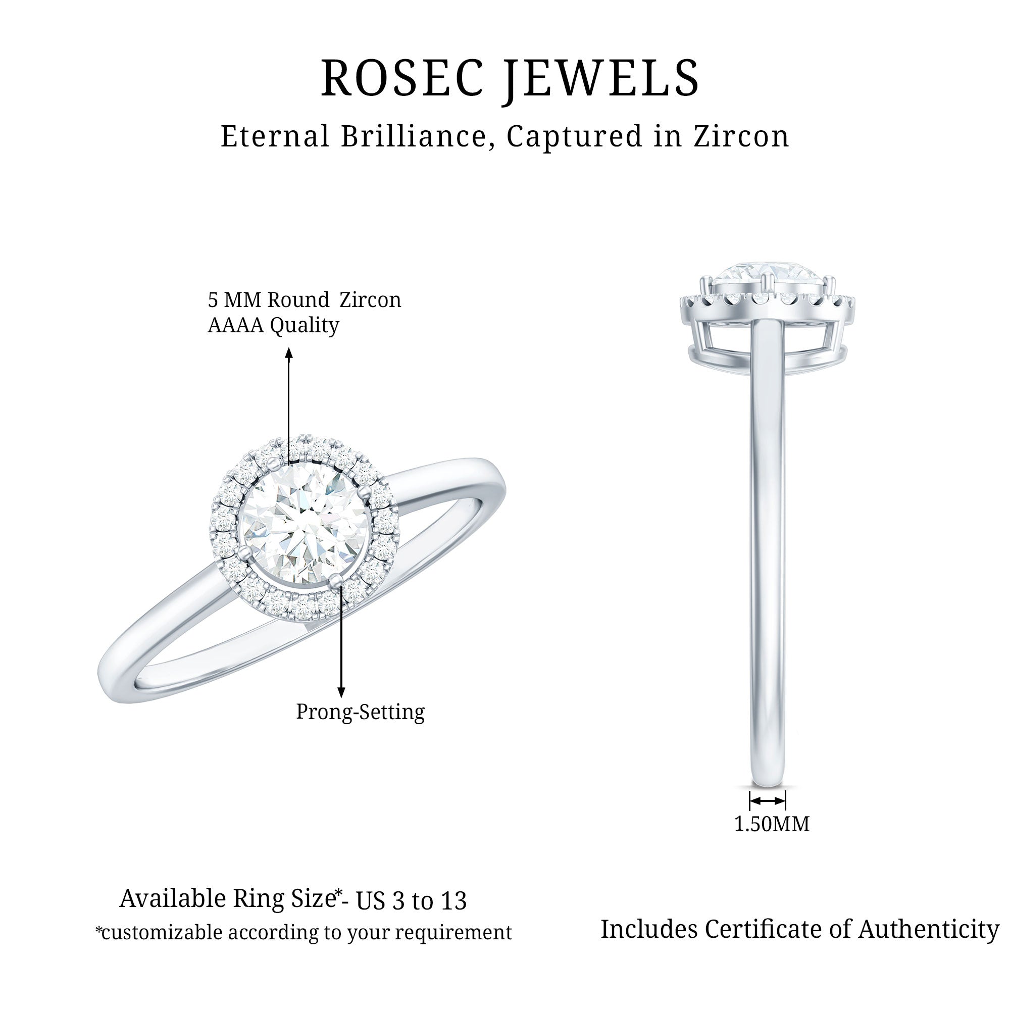 This amazing Solitaire Ring is adorned with Round Cut Zircon in Prong Setting with Halo makes it a stunning engagement jewelry for your special day.