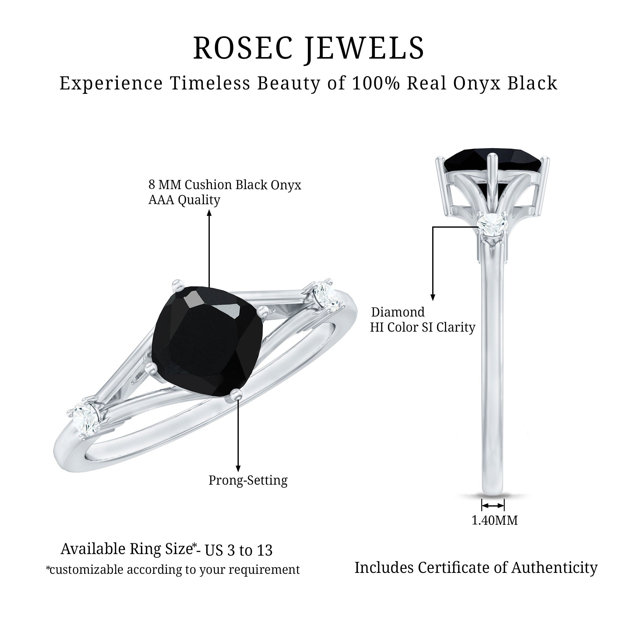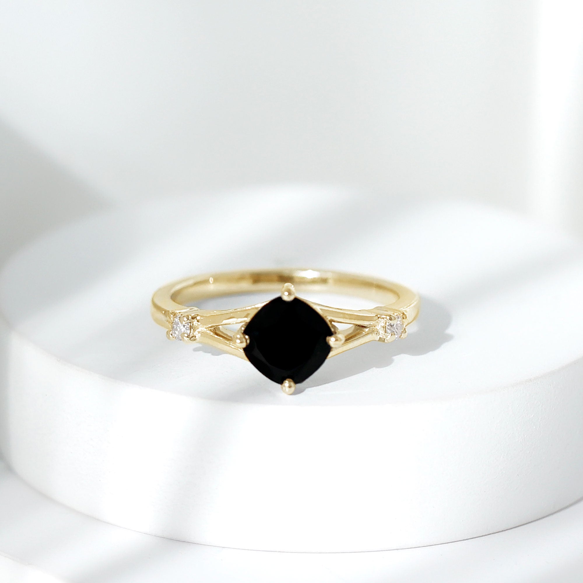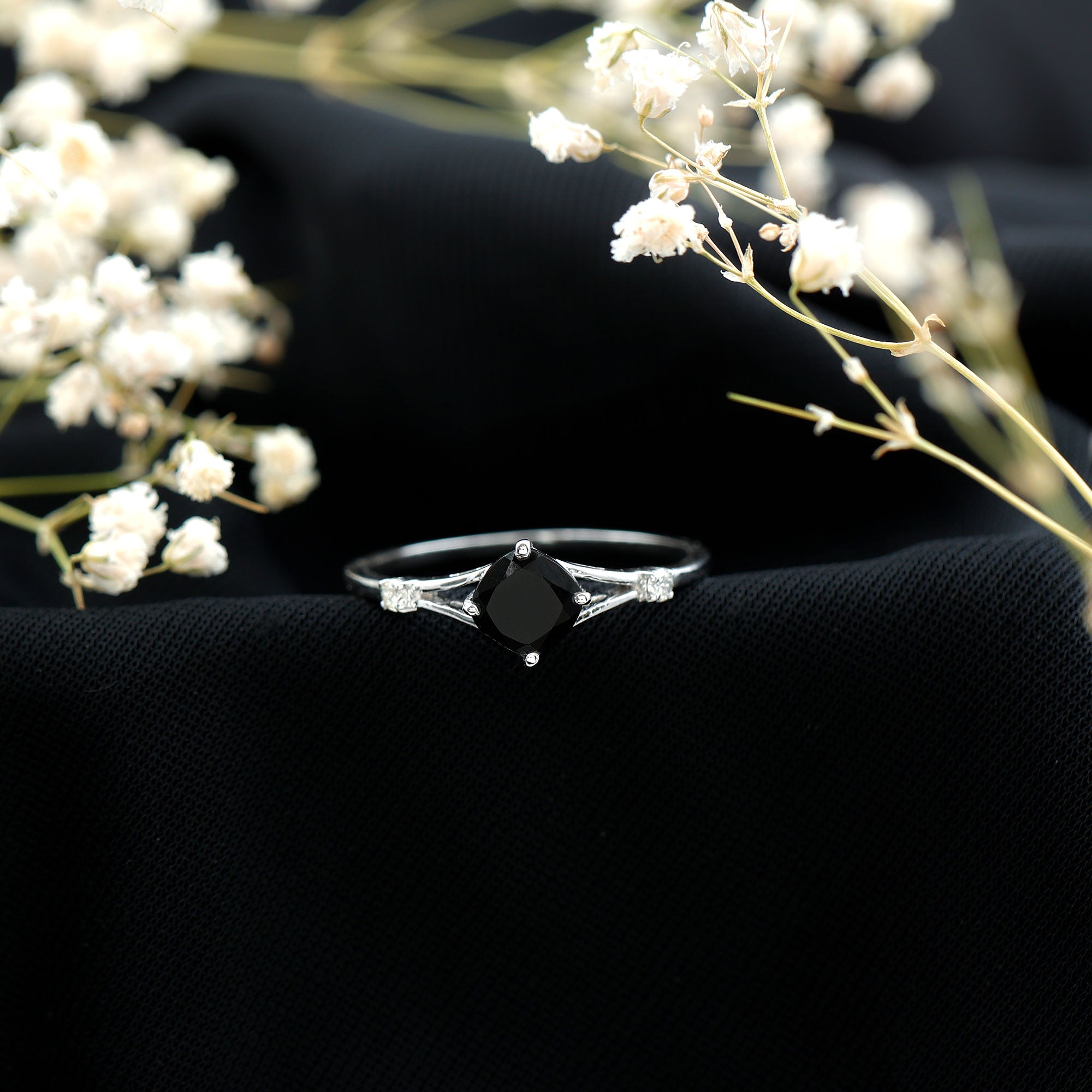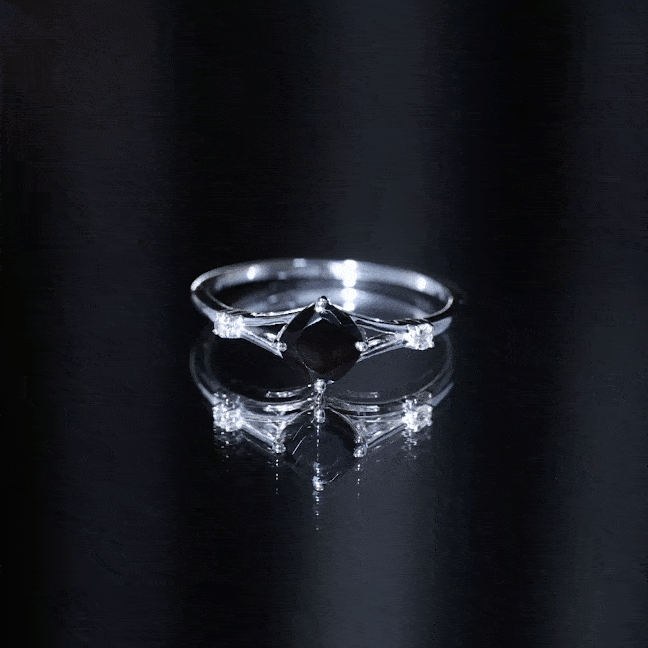 The Cushion Black Onyx Split Shank Engagement Ring with Diamond is designed for those who prefer a bold and structured engagement style. The deep tone of the center stone creates a striking focal point, while the overall design remains refined and balanced.