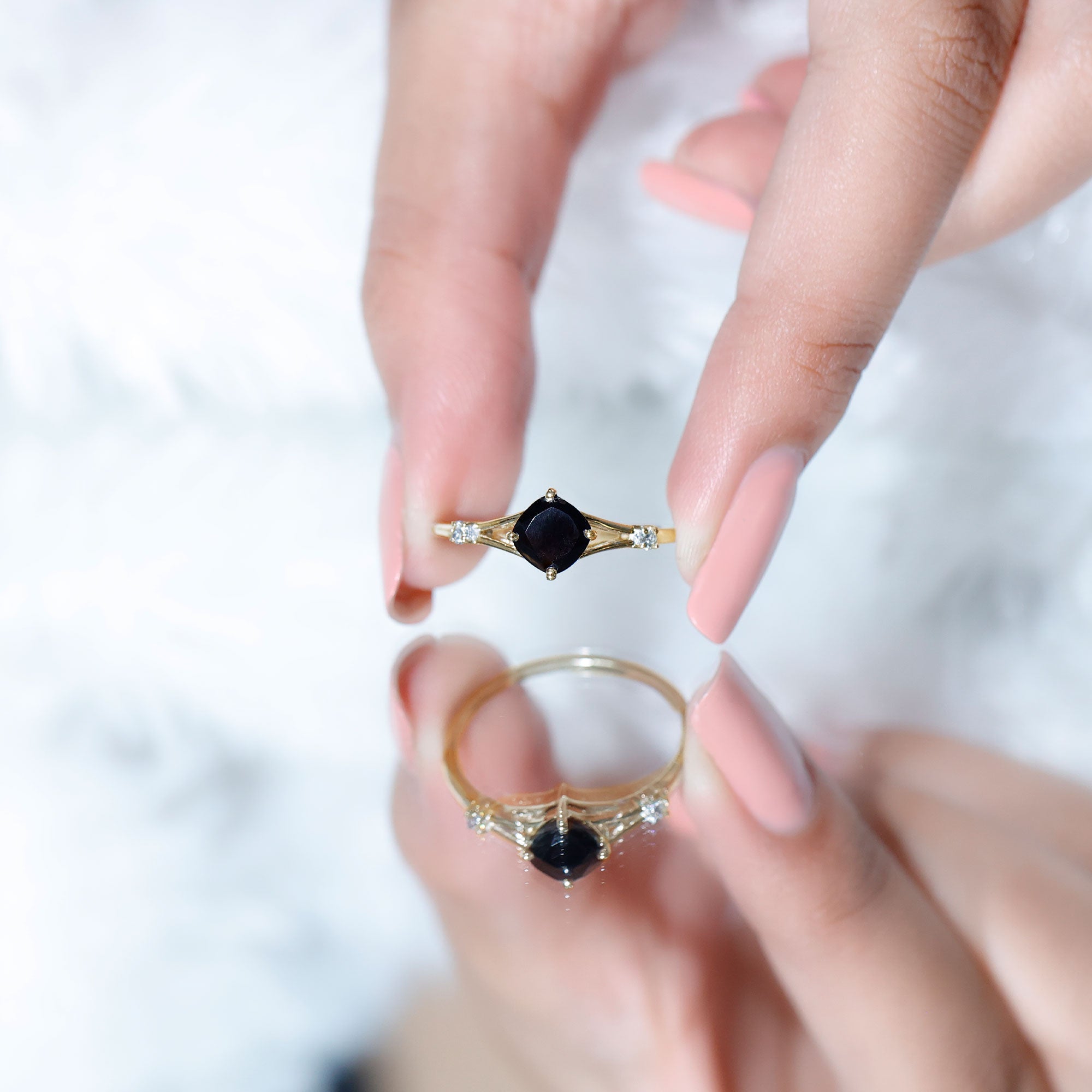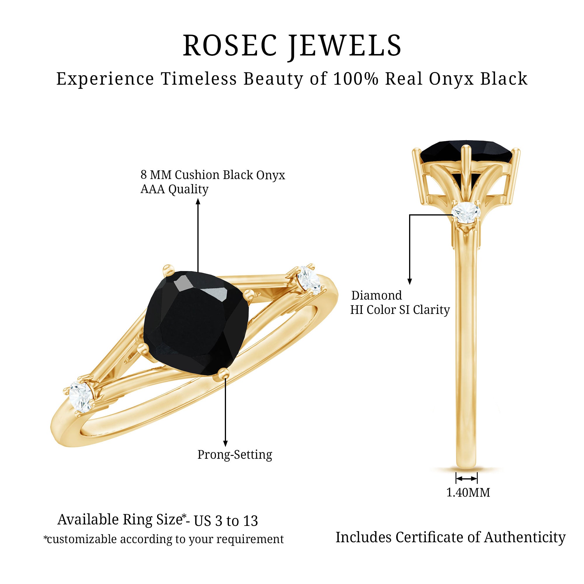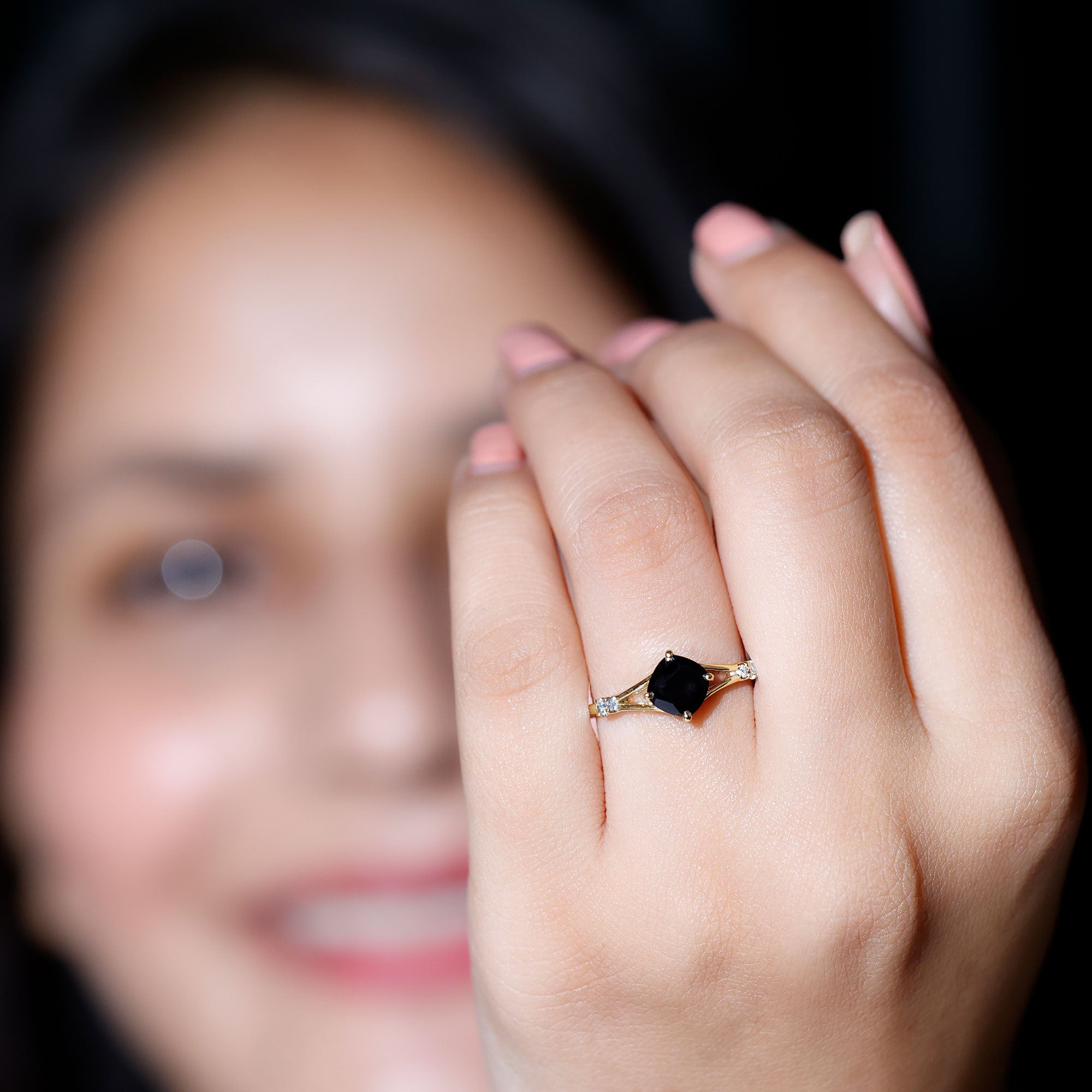The Cushion Black Onyx Split Shank Engagement Ring with Diamond is designed for those who prefer a bold and structured engagement style. The deep tone of the center stone creates a striking focal point, while the overall design remains refined and balanced.