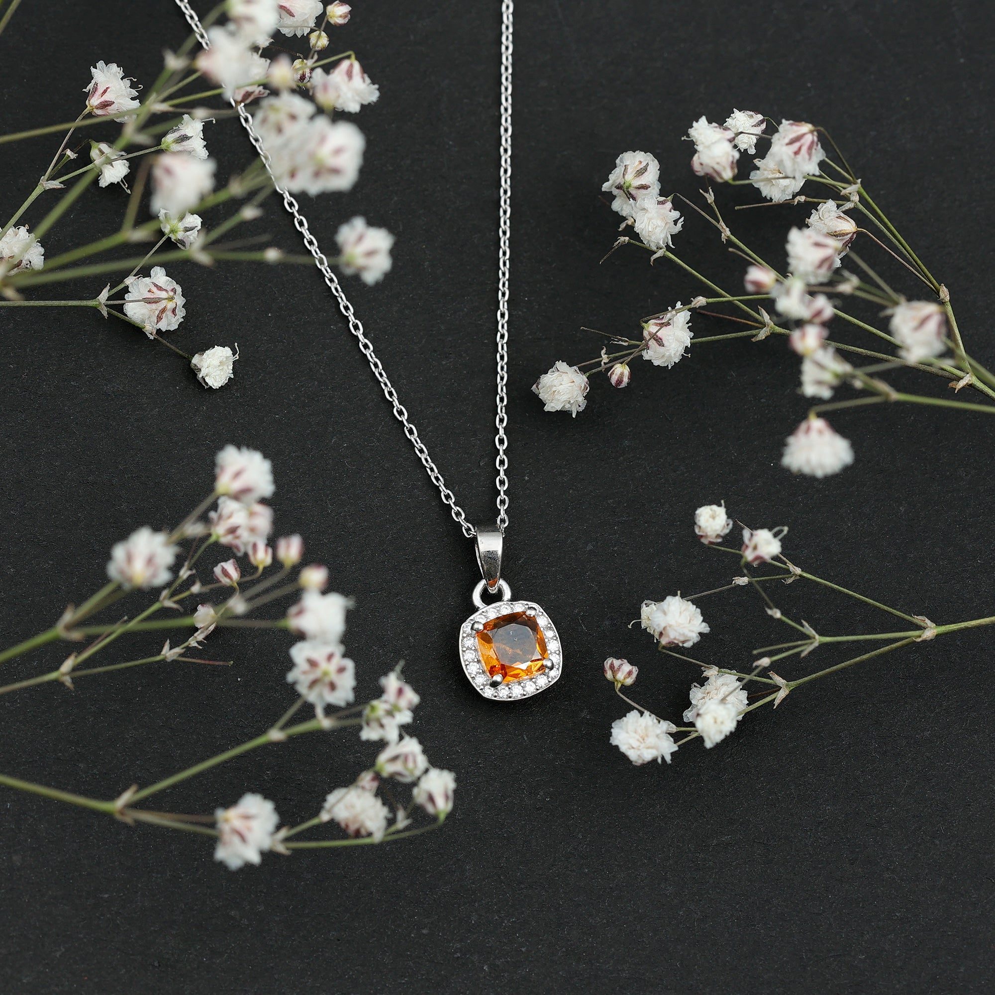 Add a vibrant hue to your outfit with this Citrine Pendant Necklace that exudes a bright hue, which makes you the center of attraction. The classic pendant features a 6 MM Cushion Cut Citrine of AAA Quality encircled by Halo of smaller round shape Moissanites. The pendant with standard bail dangles in a sturdy cable chain, which can be adjusted as per the choice of style. This November Birthstone Pendant can be a thoughtful gift for Scorpions and Sagittarians. This Real Citrine Pendant can be presented as a symbol of joy and personal power. The pendant will be delivered to you in a premium packaging.