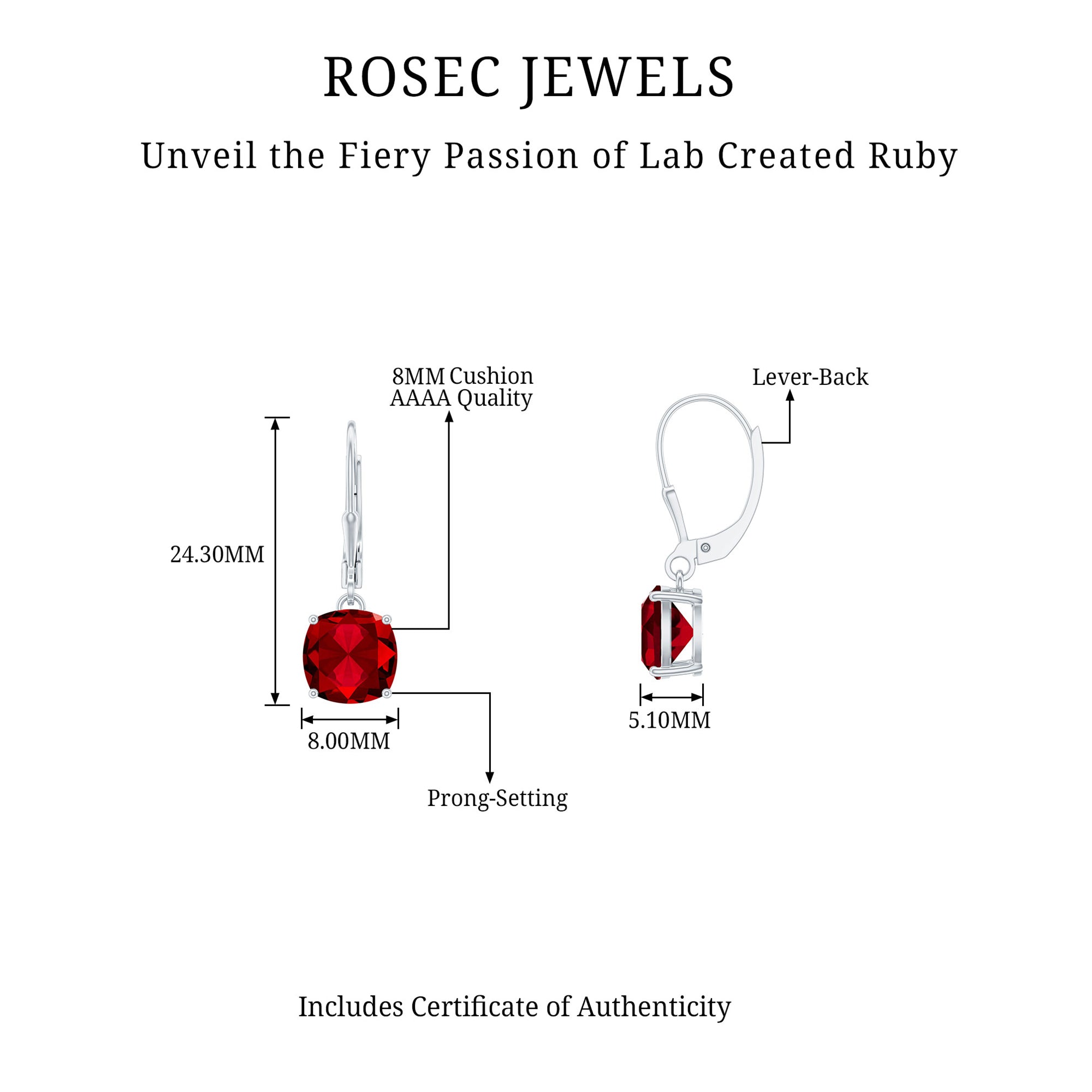 Enhance your ears with these beautifully crafted Lab Grown Ruby Earrings, perfect for your special occasions. These Solitaire Drop Earrings showcase an 8 MM Cushion Cut Lab Created Ruby of AAAA Quality, elegantly hanging from a lever back closure and secured in prong setting. Ideal for cocktail parties, office meetings, outings with friends, or romantic dinners, these Dangling Earrings will surely make you shine. Crafted in 14k white gold plated silver with lab grown ruby, they are a great choice as you are choosing ethically sourced jewelry. Ruby symbolizes strength and beauty, making it an ideal gift for someone you admire for their strength, whether its your mom, wife, or sister.