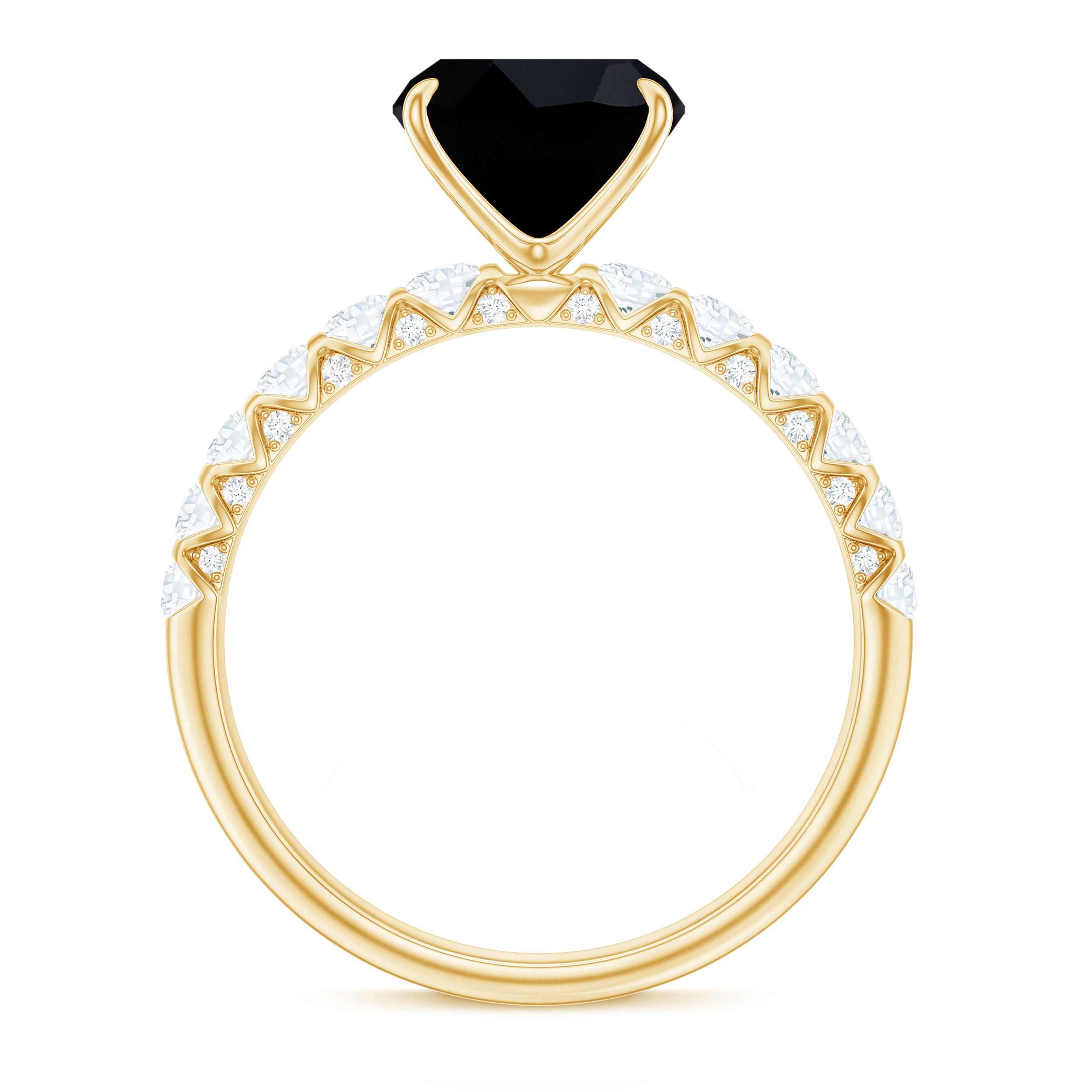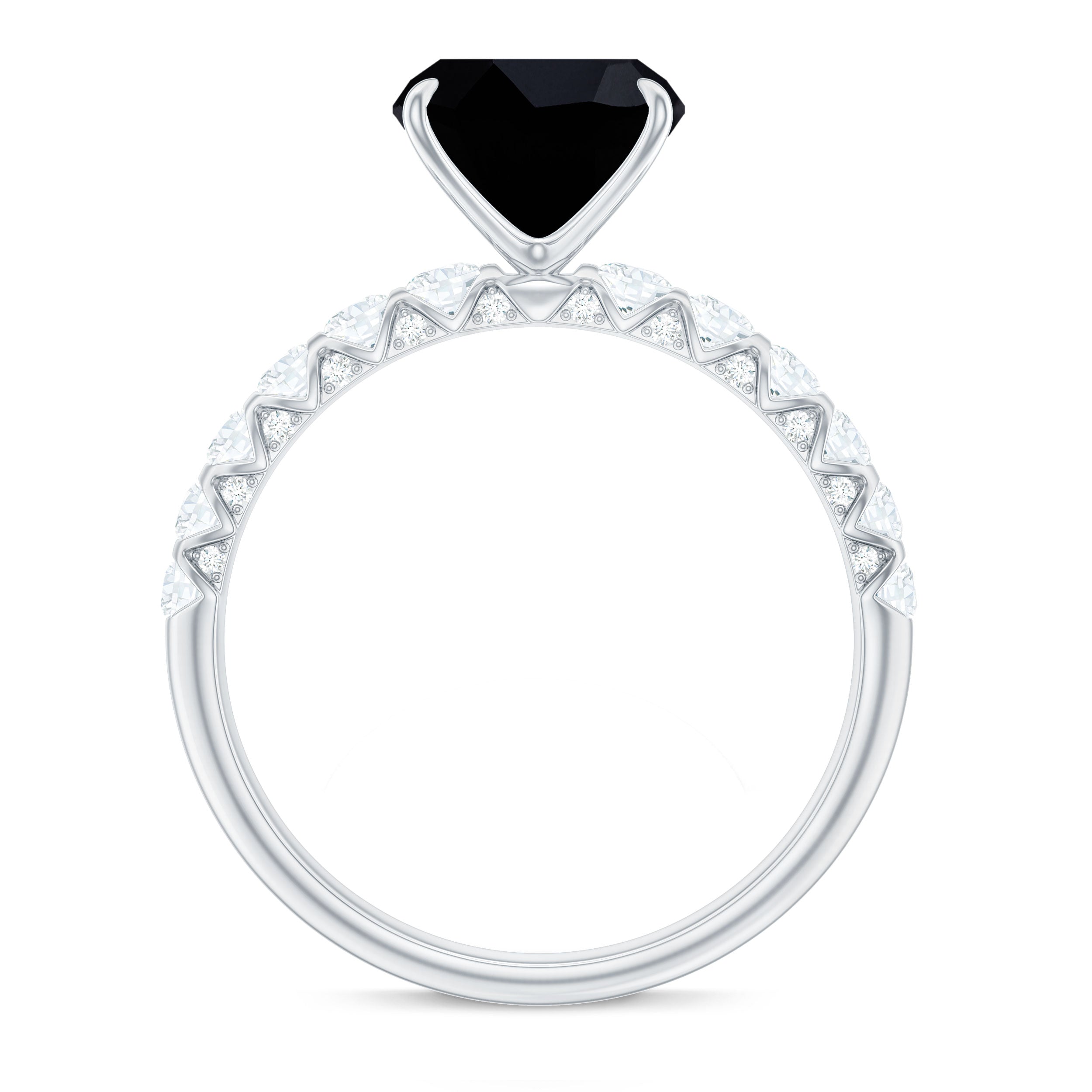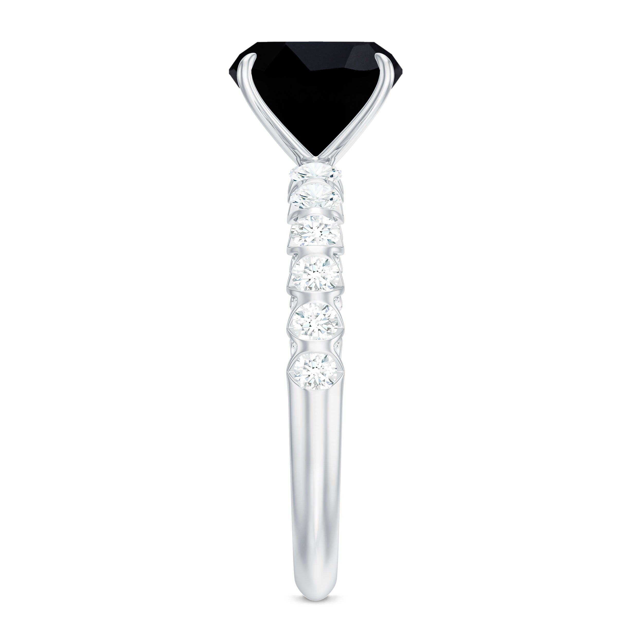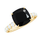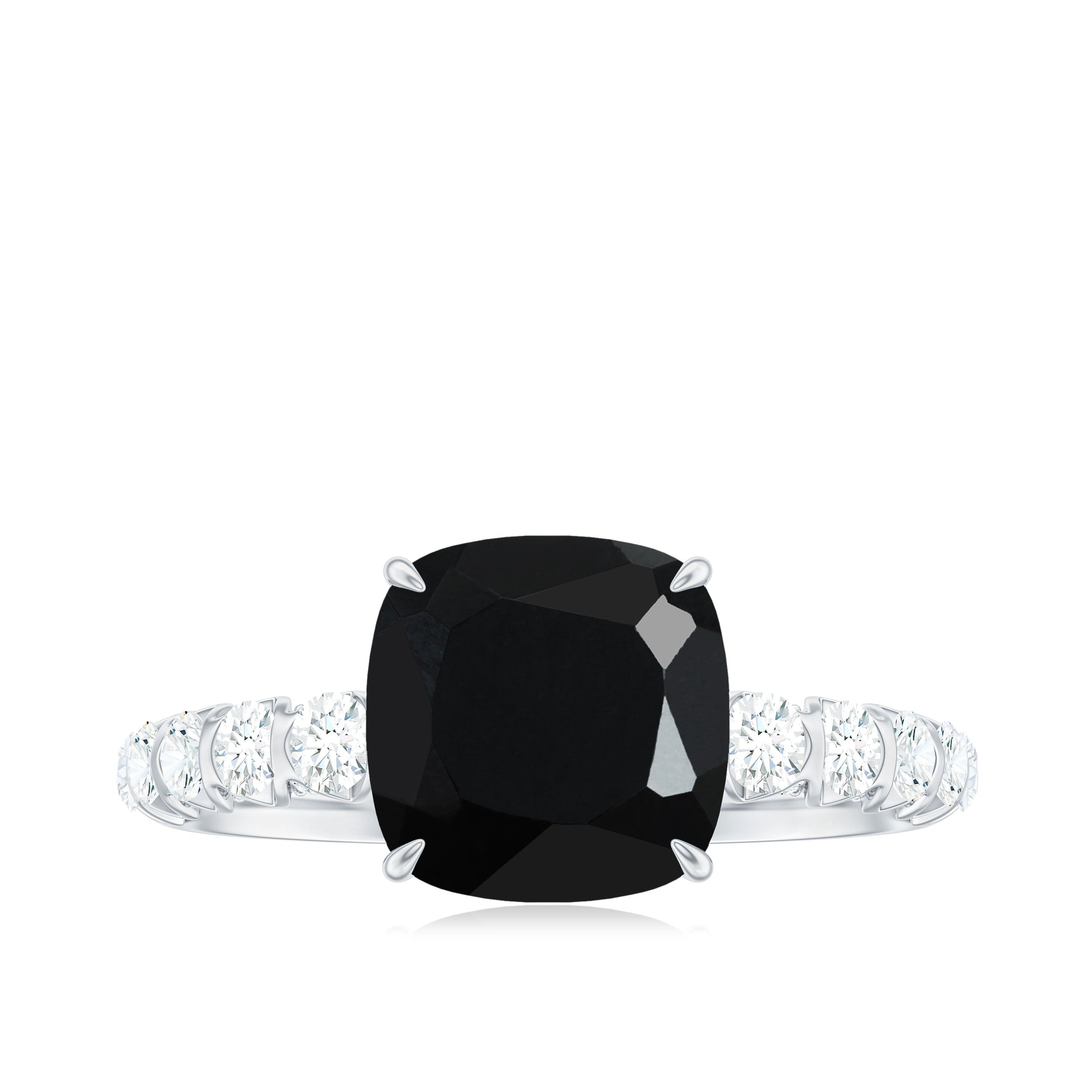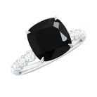 Gracefully embellished in shimmering Metal, this mesmerizing Ring features a stunning Cushion Cut Created Black Diamond at its heart, exuding elegance from a delicate Claw Setting. To further enhance its beauty, Round Brilliant Diamond stones adorn the sides, skillfully arranged in a classic design, adding a touch of sophistication to the overall design. This exquisite piece is sure to captivate hearts with its enchanting allure.