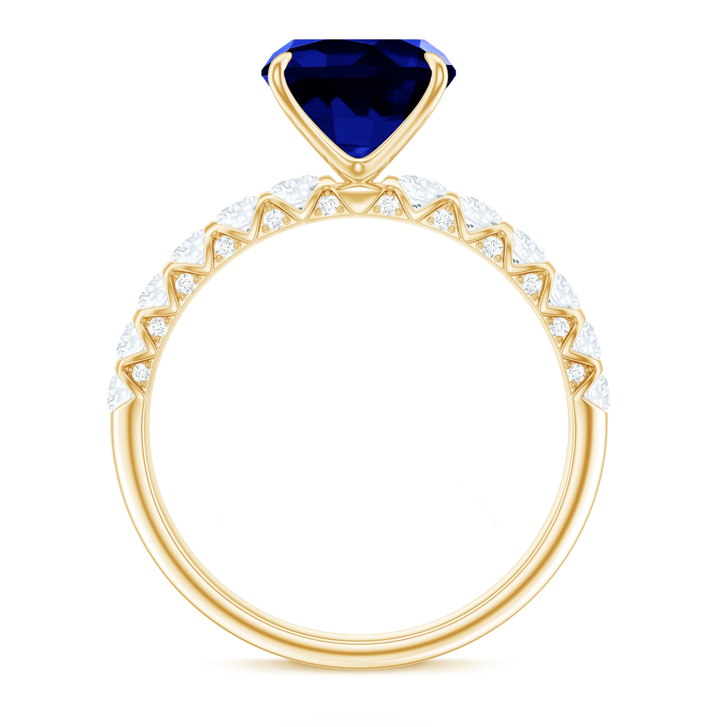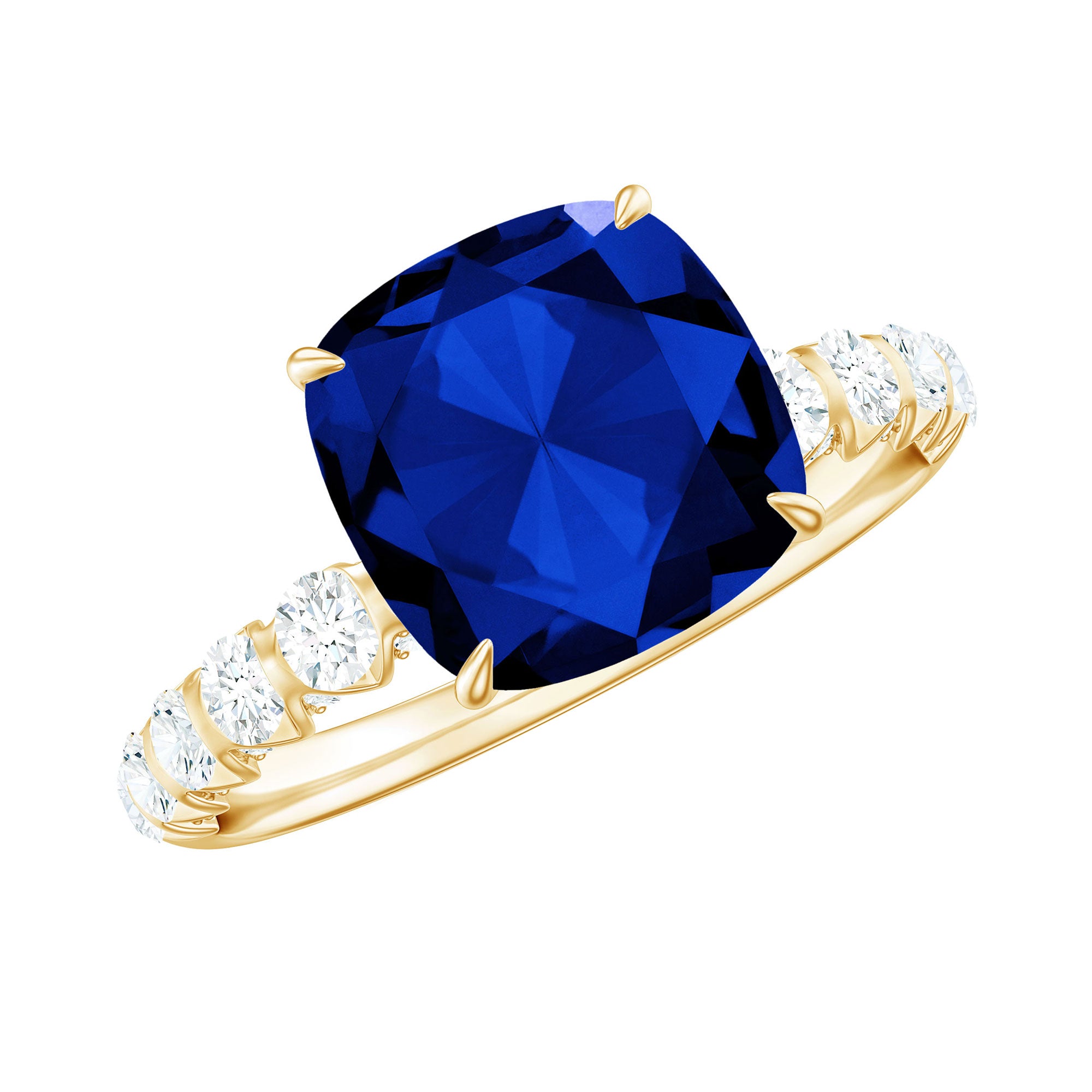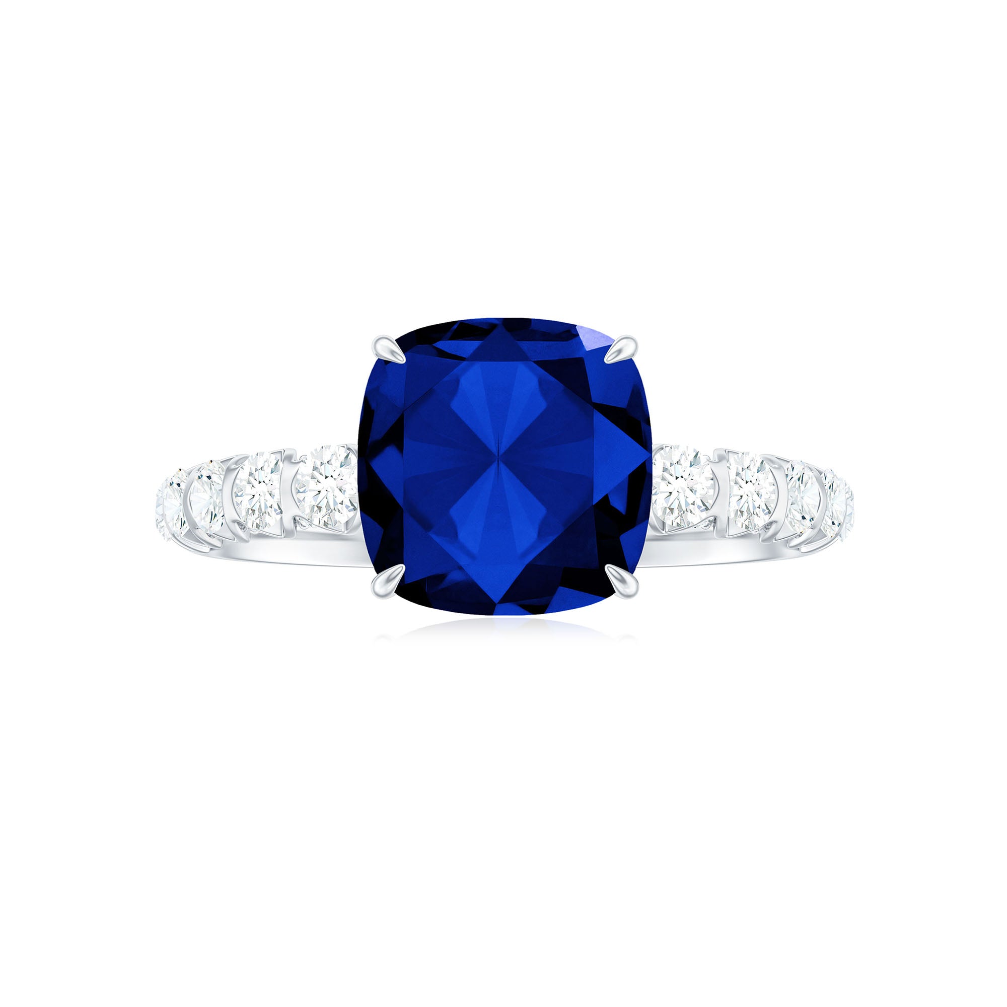 Cushion Cut Created Blue Sapphire Solitaire Ring with Diamond Side Stone