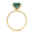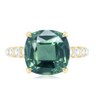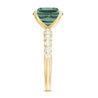 This Engagement Ring showcases a Cushion Cut Lab Created Green Sapphire while Round Shape Moissanite studded as side stones make for a charming piece to style with all your casual and special attires. Treat your special person with this lovely Created Green Sapphire Ring. Your beloved will be flabbergasted when you get her this Cushion Cut Ring as an anniversary gift.