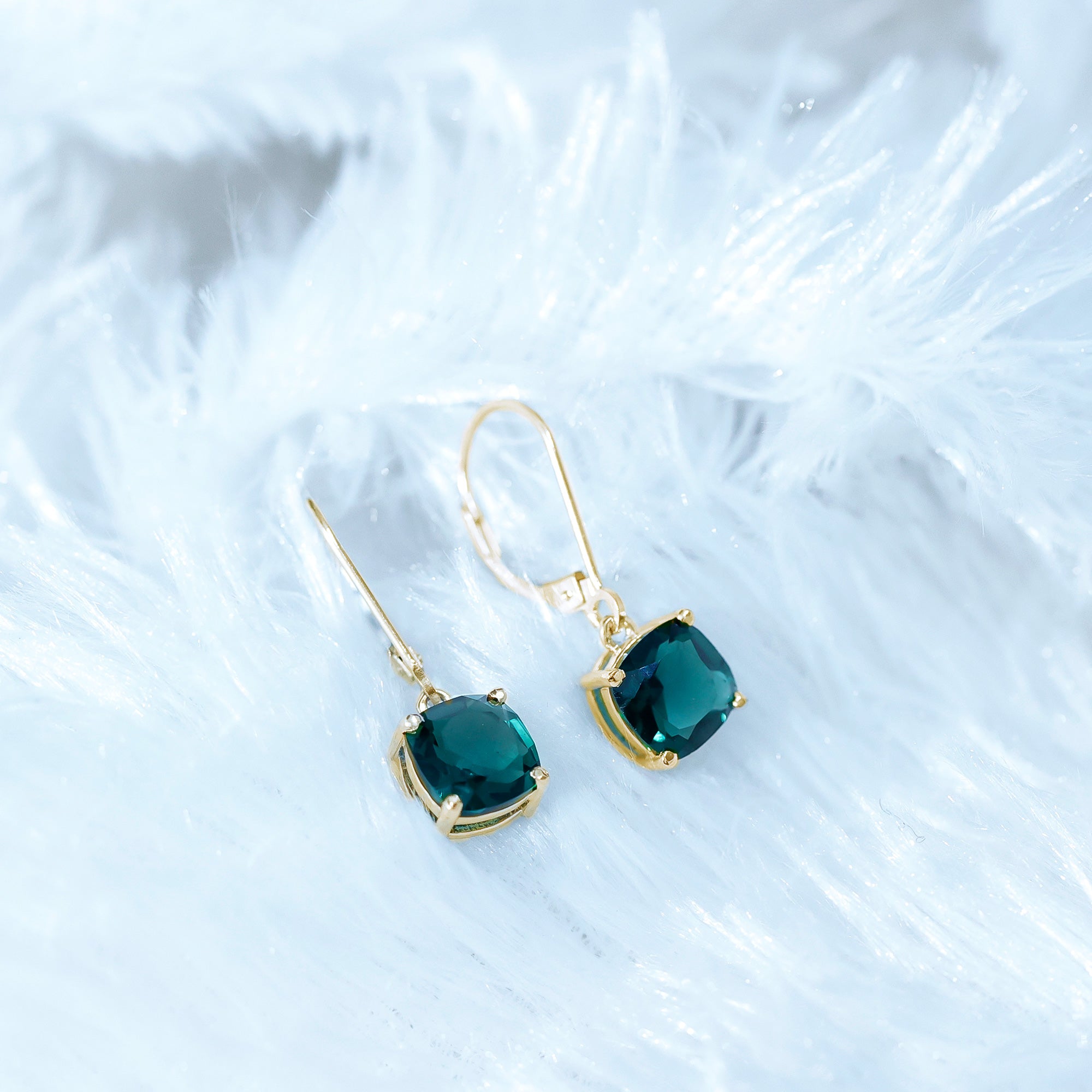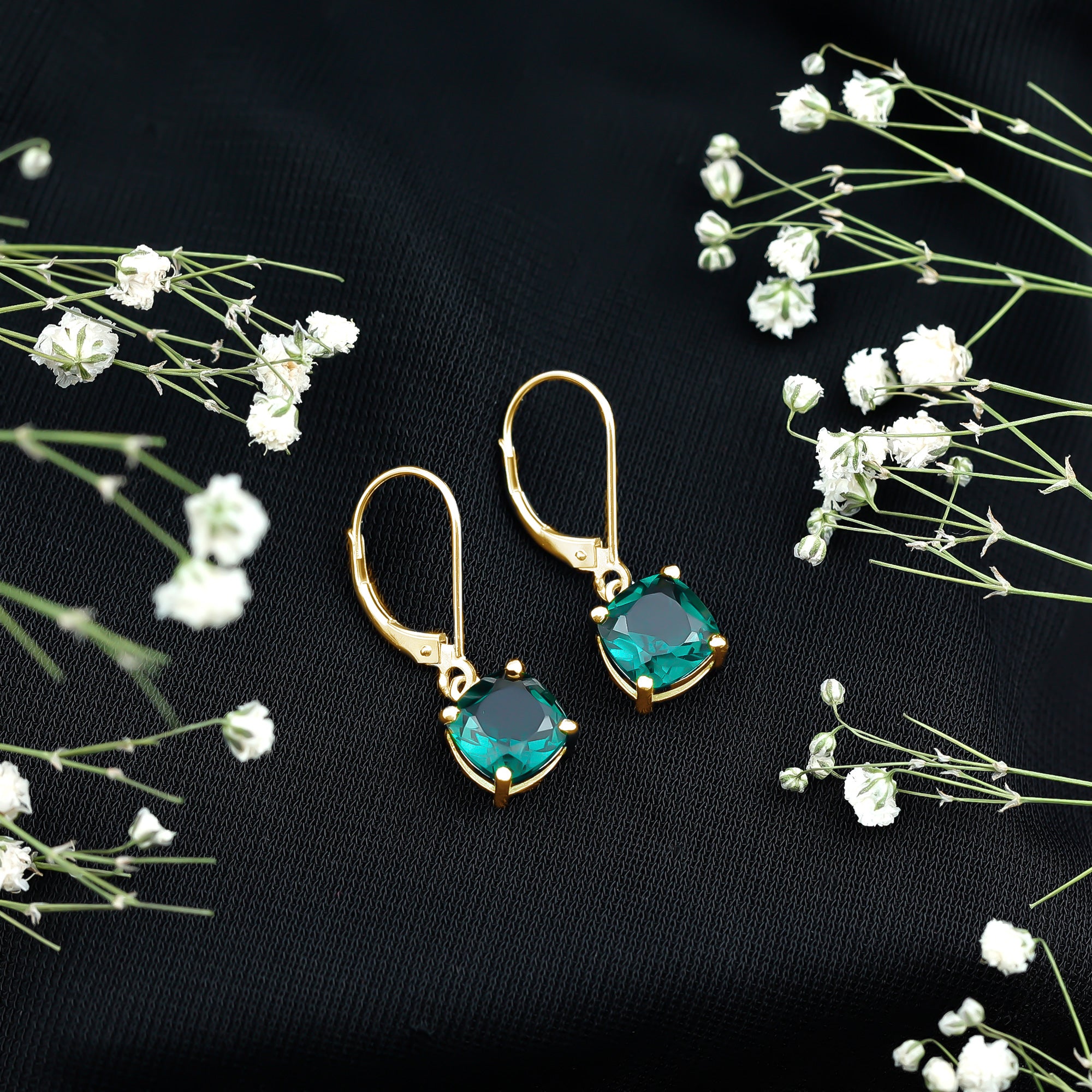 Enhance your style with these exquisite Drop Earrings that exude sophistication. The cushion-cut created green sapphire beautifully complements the lever back design, resulting in a breathtaking combination. A fashion essential for those who appreciate timeless elegance, these created green sapphire earrings effortlessly elevate any outfit with a touch of allure and charm.