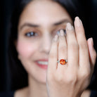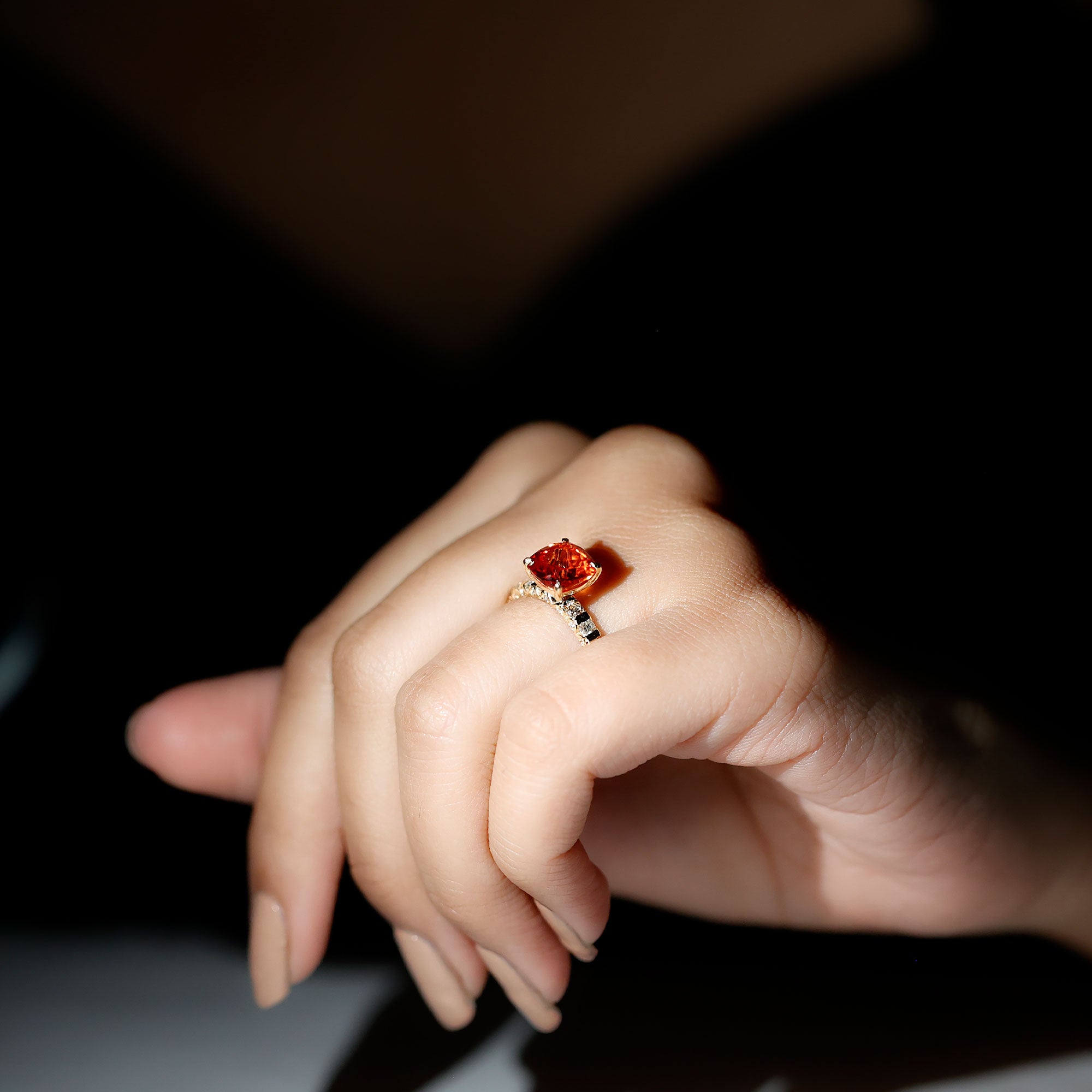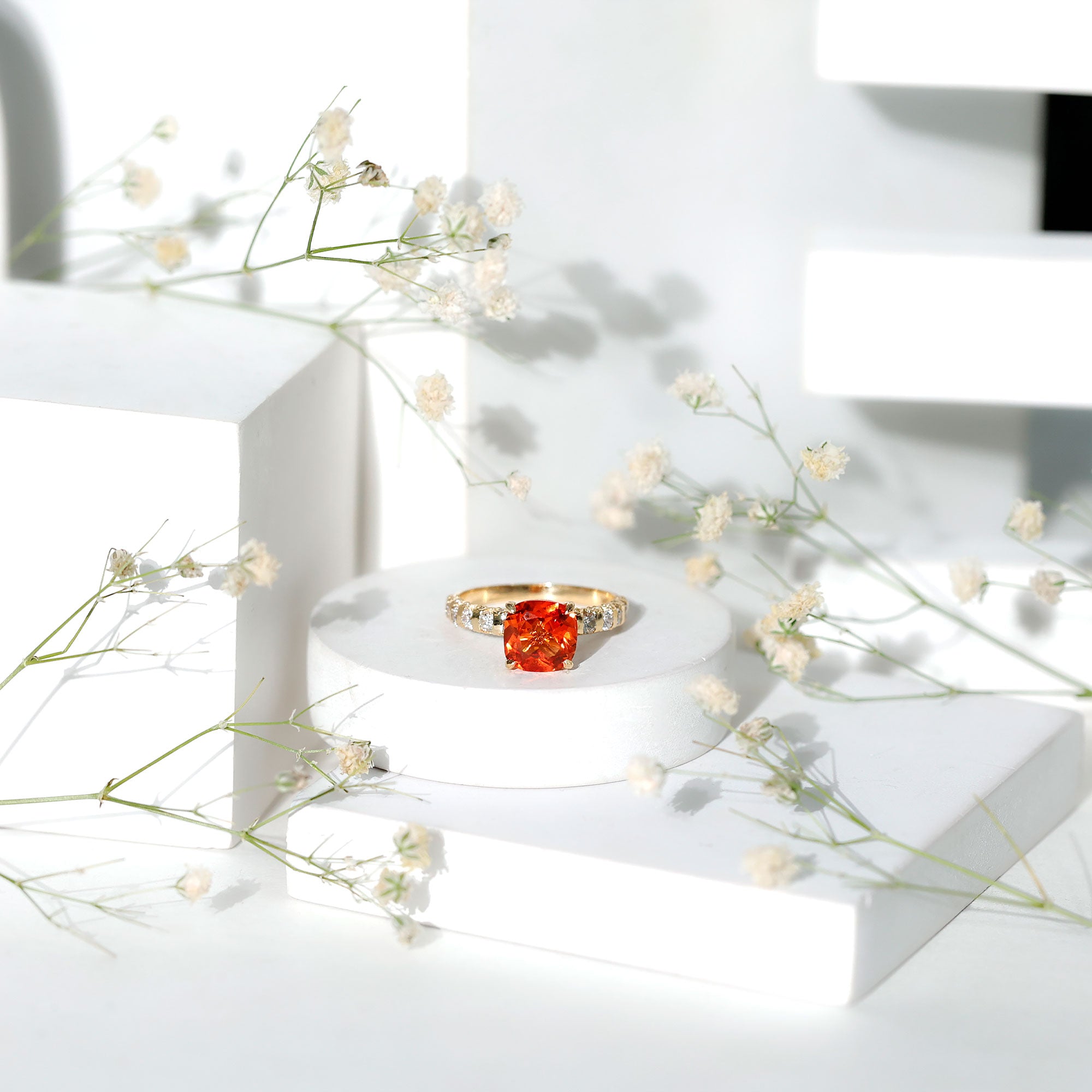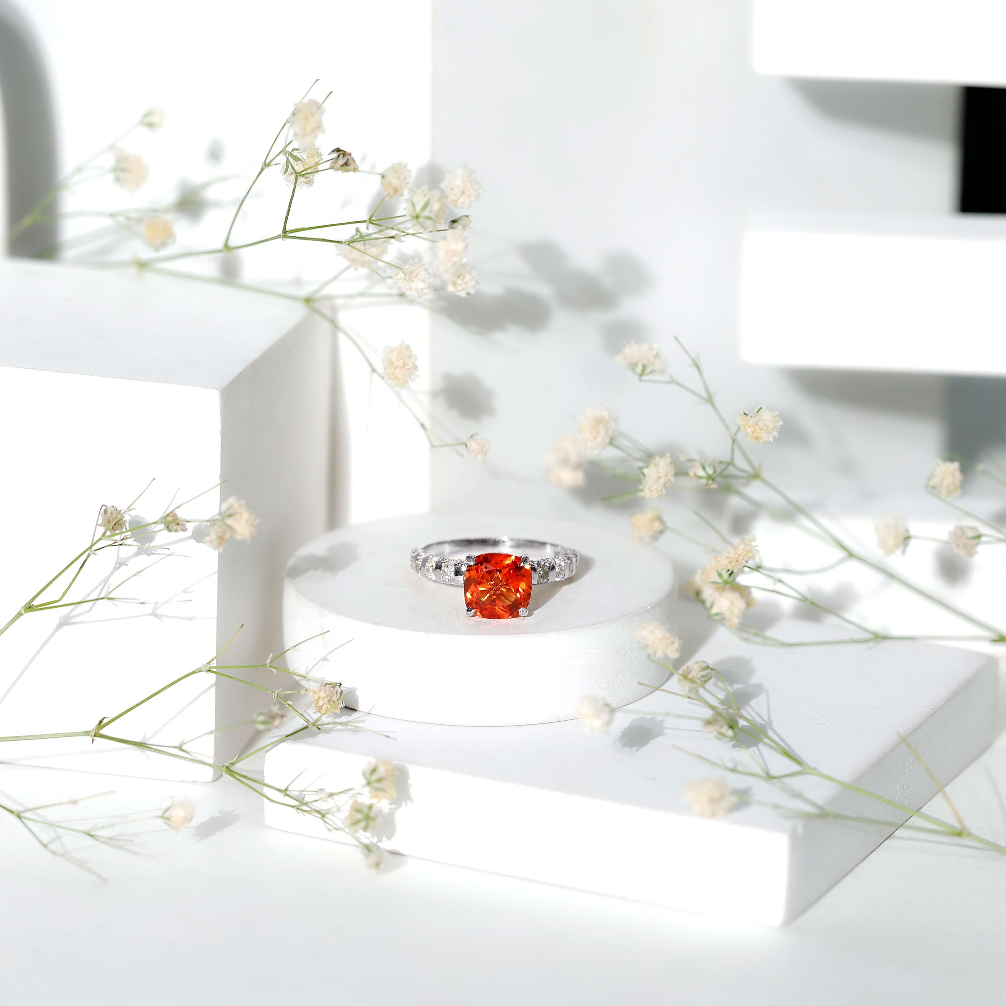 The Created Orange Sapphire Engagement Ring is embellished with Cushion Cut Lab Created Orange Sapphire secured in Claw Setting while Round Shape Diamond studded as Halo. Make a statement with our Created Orange Sapphire Ring whenever you wish to sparkle. The perfect gift for someone special in your life is this mesmerizing Solitaire Ring.