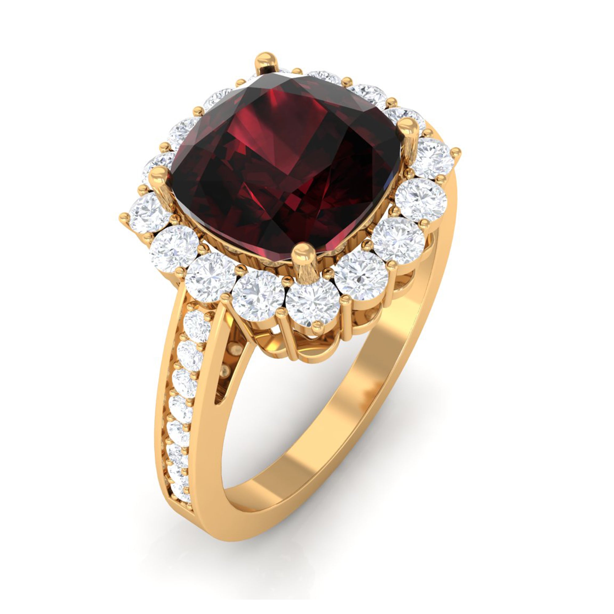 Indulge in the luxurious beauty of this Halo Engagement Ring, showcasing an 8 MM cushion-cut garnet stone in a secure 4-prong setting, mounted in gold. The ring shank is adorned with sparkling Diamond stones, adding a touch of glamour and sophistication. With its exceptional design and high-quality materials, this ring is the perfect symbol of love and commitment.
