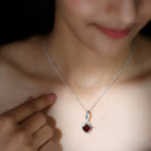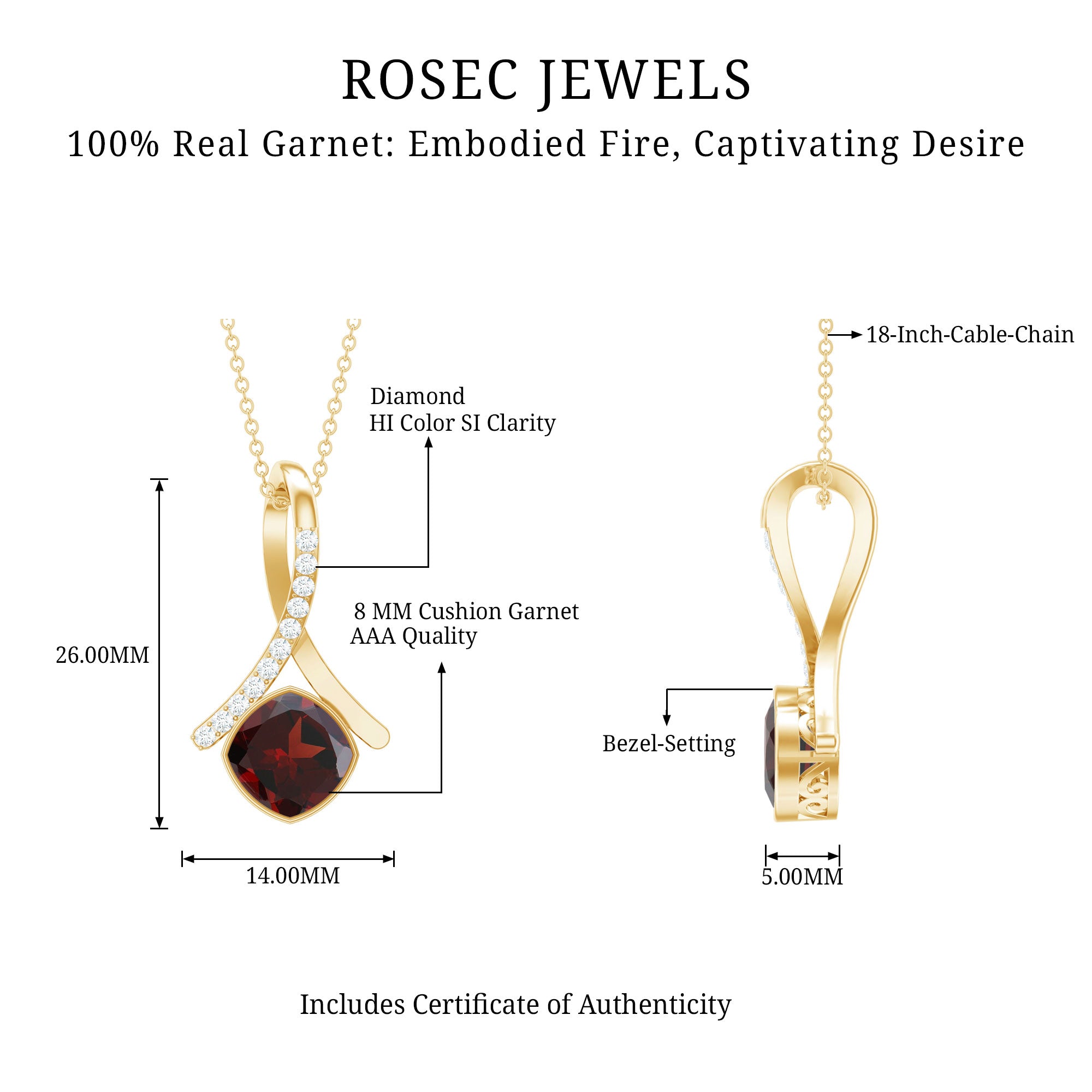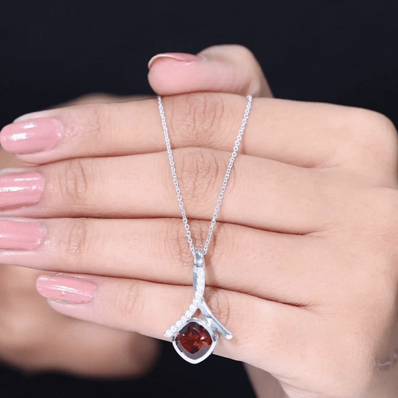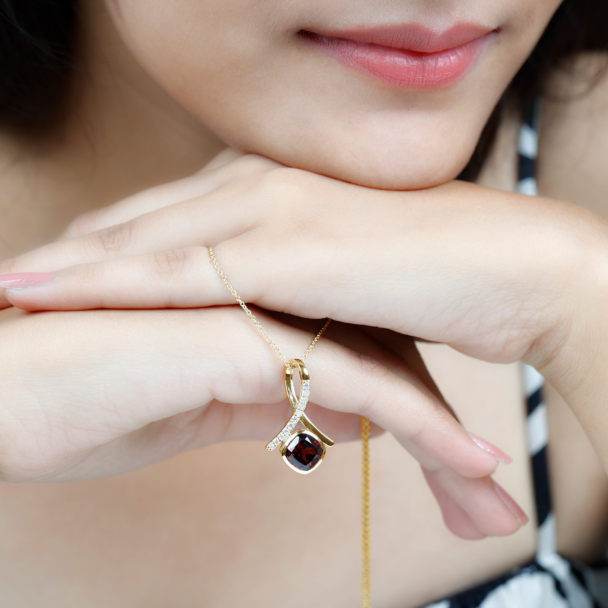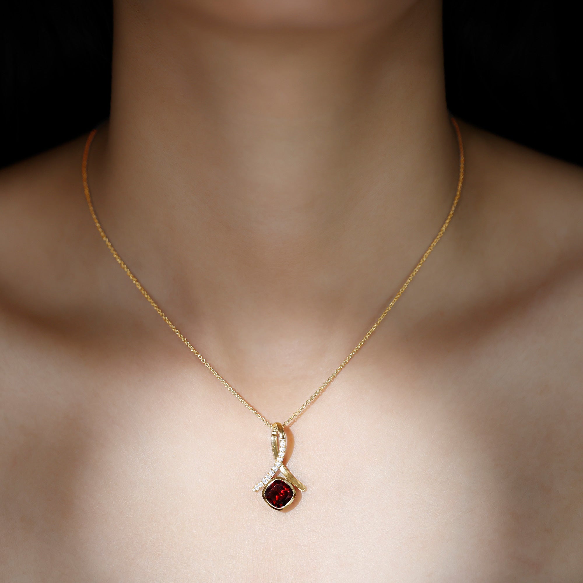 Express your feelings to your lady with this Twisted Pendant adorned with a Cushion Cut Garnet as a solitaire in a Bezel Setting and Round Shape Diamond in a Twisted Bail. This Solitaire Pendant is an opulent choice for different occasions.