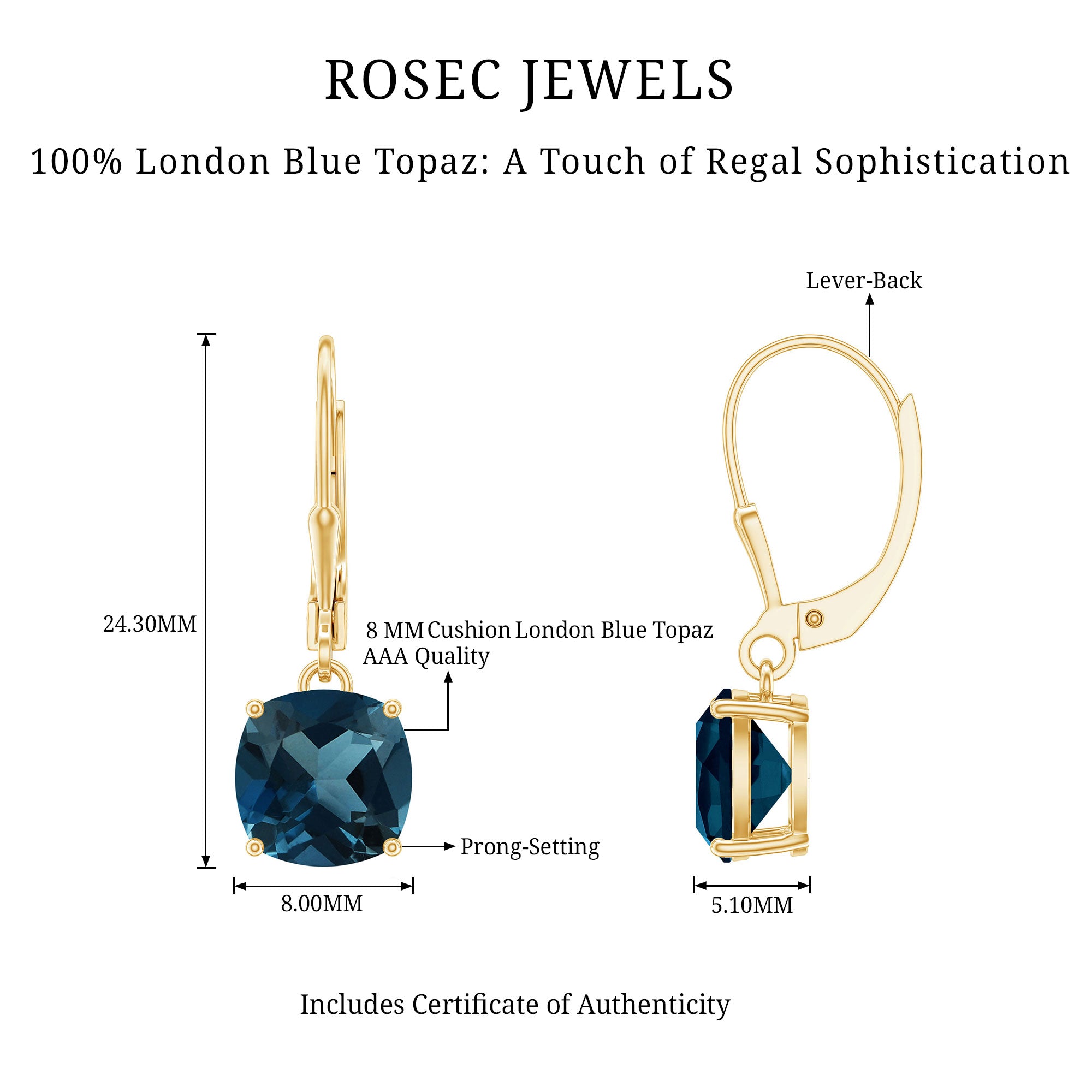 Brighten your style with these beautiful London Blue Topaz Drop Earrings. Each earring features a 8 MM cushion cut London Blue Topaz that shows a rich blue color, perfect for adding a special touch to any look. Known as the December birthstone, London Blue Topaz stands for love, honesty, and confidence, making these Solitaire Drop Earrings a thoughtful choice for yourself or someone special. The gemstone is set securely in a 4-prong setting, keeping it safe while showing off its color from every side. The Cushion Cut Earrings hang from a smooth lever-back closure, making them easy to wear and comfortable all day long. These London Blue Topaz Earrings are perfect for both everyday wear and special occasions. They can add color to casual outfits or complete a more dressed-up look. With their classic style, they will never go out of fashion and can be enjoyed for years to come. Whether given as a birthday gift, anniversary present, or a token of appreciation, these Hoop Drop Earrings carry meaning and beauty. Each pair is carefully made and beautifully finished, ready for gifting or keeping as a personal treasure.