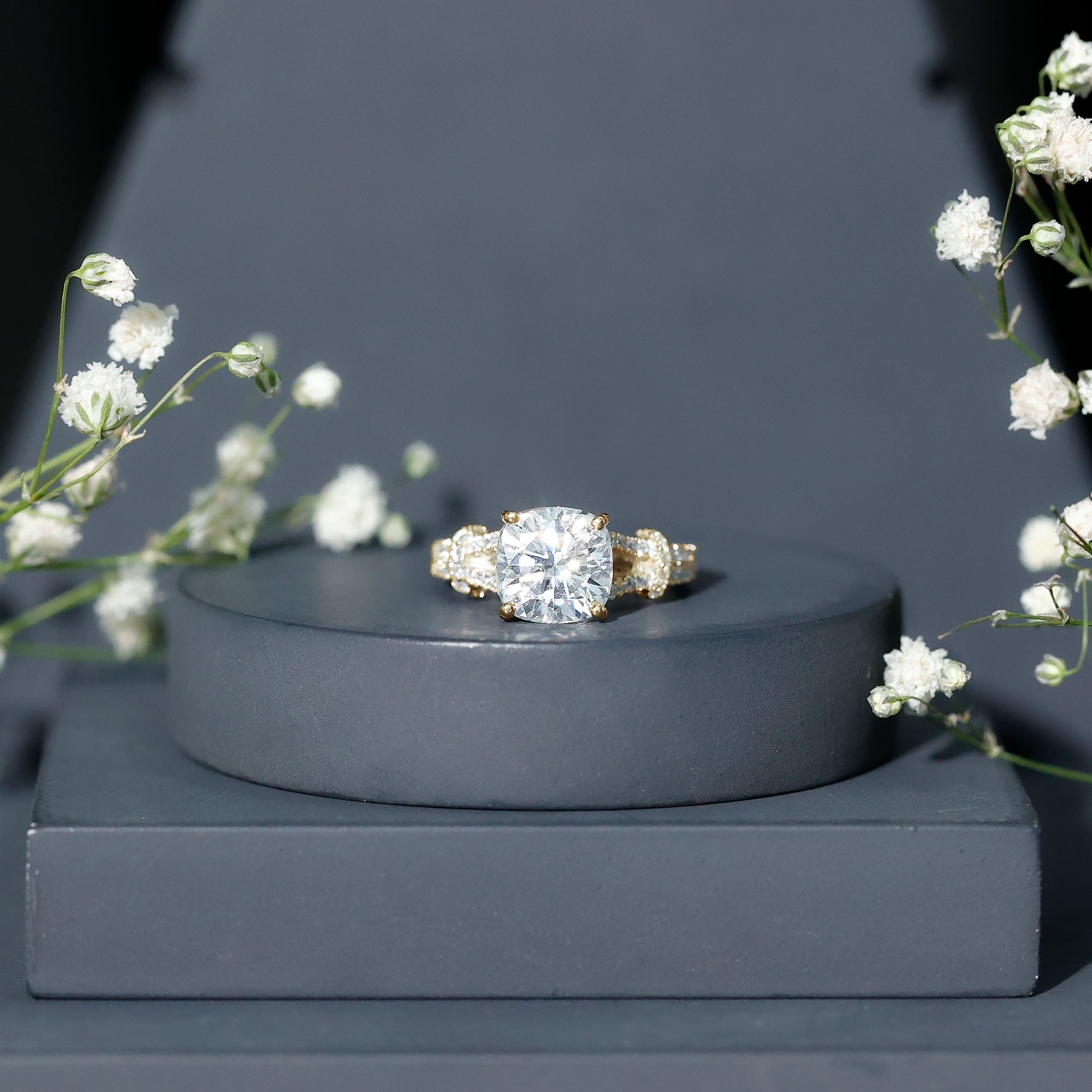 Begin your forever with a ring that reflects the depth of your love and the elegance of your bond. This Cushion Cut Engagement Ring is a captivating blend of sophistication and sentiment, designed to celebrate your most meaningful moments. At its heart lies an 8 MM cushion cut moissanite nestled in a secure prong setting. The center stone radiates timeless charm and modern elegance with every flicker of light. The true beauty of this Solitaire Engagement Ring lies in its split shank design, symbolizing two individual paths coming together as one. The gracefully parted band is embellished with petite moissanite accents, delicately set to enhance the sparkle and significance of the design. This thoughtful detail not only adds dimension but also mirrors the journey of unity and love you share. For added brilliance, moissanite stones are also set along the bridge, creating a luminous pathway that draws attention toward the center, where your love takes focus. This 3 Carat Moissanite Ring effortlessly blends traditional allure with a contemporary touch, making it an ideal choice for proposals, vow renewals, or any heartfelt occasion. Designed to be cherished for a lifetime, it offers a luxurious sparkle that is as enduring as your promises.