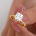 Let your love story shine through timeless design with this stunning Cushion Cut Moissanite Ring. At its heart sits an 8 MM cushion shaped moissanite set in prong setting. With every facet reflecting fire and light, this Solitaire Engagement Ring is crafted to mark moments that matter - proposals, promises, or milestones of self-love. The band features a distinctive twisted rope design, adding depth and texture while symbolizing two lives beautifully intertwined. It’s a subtle nod to unity and strength, perfect for the journey you are about to begin or continue. Just beneath the main stone lies a hidden moissanite, a subtle sparkle placed intentionally for the one who wears it, like a quiet reminder of love that only deepens over time. This Moissanite Engagement Ring is designed for the modern romantic someone who loves clean, classic lines, but with a touch of character and symbolism. The blend of the twisted band with a bold single stone brings both softness and strength together in one unforgettable piece. This 3 Carat Moissanite Ring is thoughtfully packaged in a premium jewelry box and available in US sizes 3 to 13 for a perfect, comfortable fit. This ring is a reflection of your story, your style, and your spark.