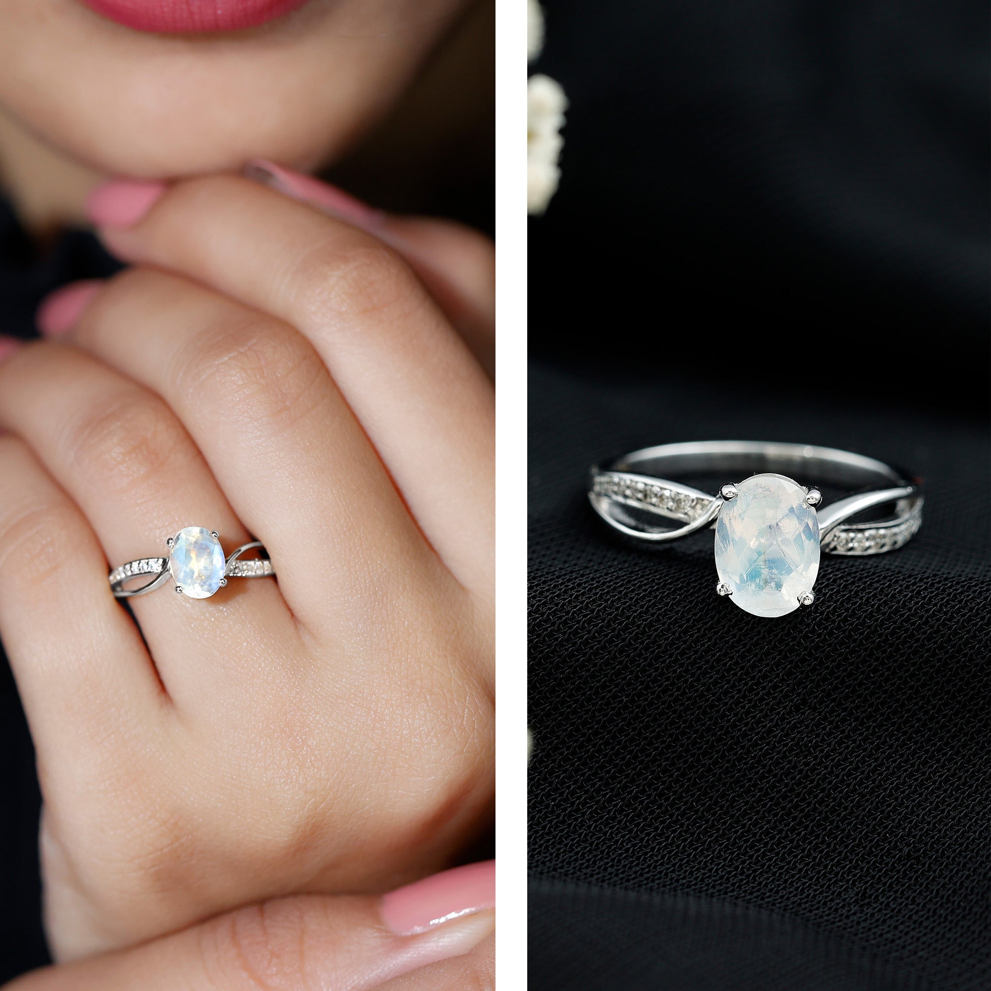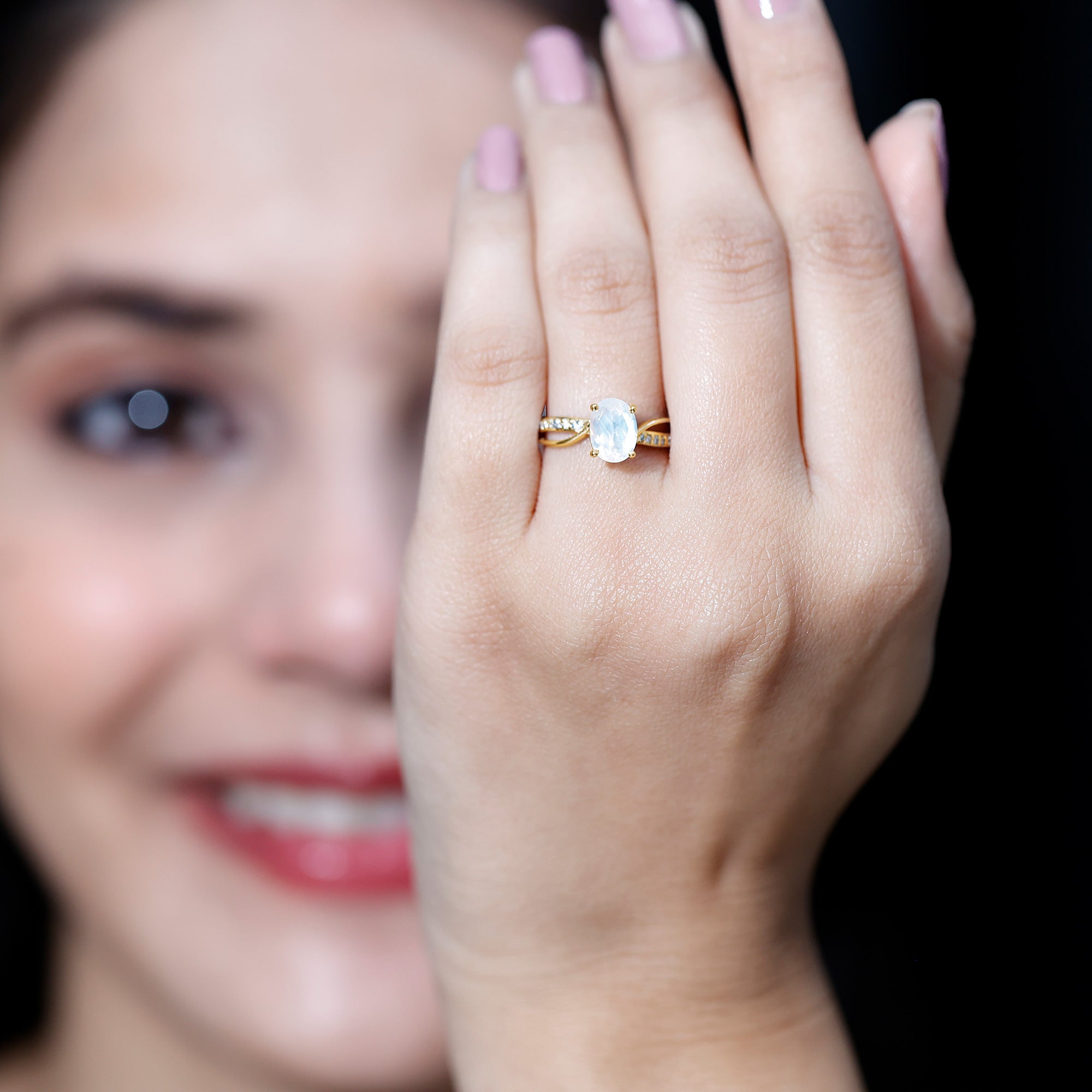 Easily the most sophisticated and Simple Moonstone Ring in the entire collection, a Solitaire Style features the Centerpiece of a Moonstone (of any shape) that stands out on its own. The Moonstone Solitaire here is at least 6 MM in size, which also makes it a one-of-a-kind choice of Moonstone Engagement Ring. It is fashioned in a versatile number of shapes that cater to just as many senses of style. While a Round or Oval Moonstone Ring exudes a conventional touch, a ring adorned with a princess, marquise, or pear-cut Moonstone is more on the fancier side of the spectrum. On the other hand, if you’re on the hunt for an Antique Moonstone Ring, go for the one fashioned in Emerald, Cushion, or Asscher cut Center stone.