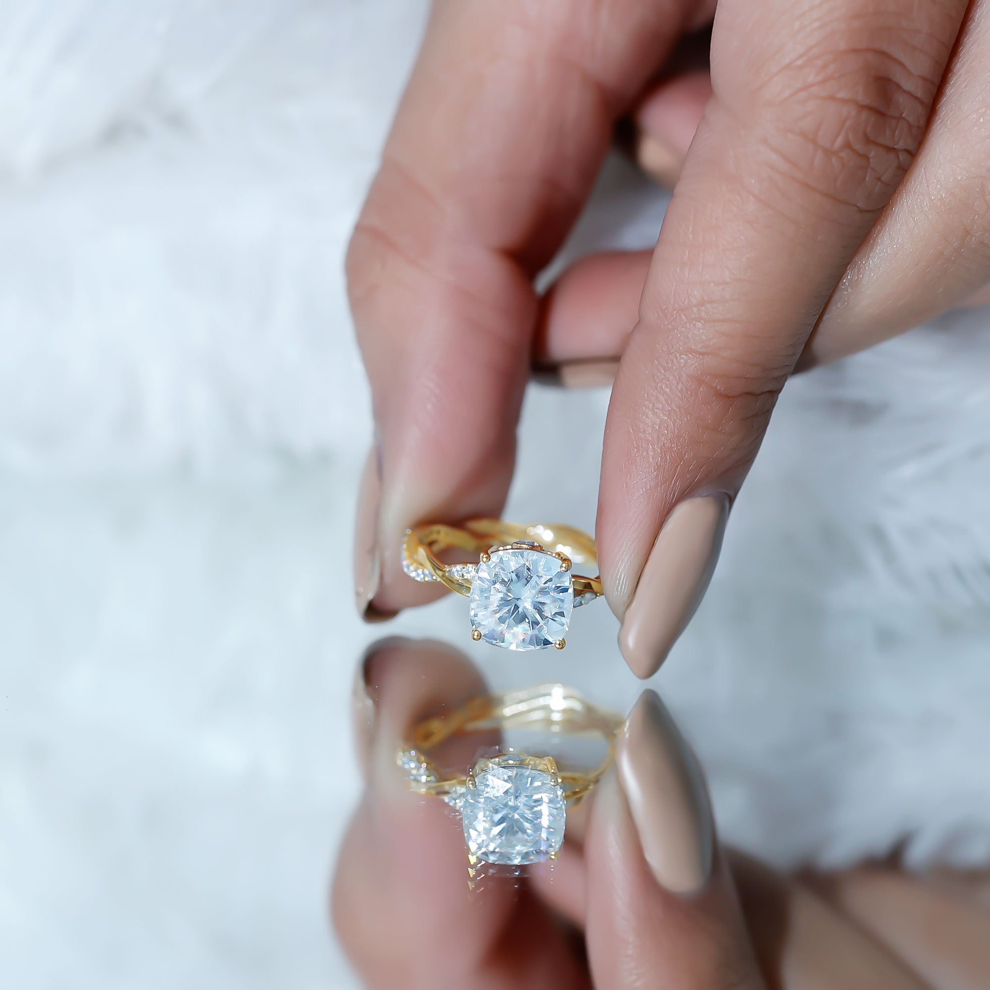 Elevate your forever moment with this Moissanite Engagement Ring that boasts a beautifully braided band. At its heart lies a dazzling D-VS1 Quality 8 MM Cushion Cut Moissanite, set in Prong Setting, selected for its timeless shine and elegant appeal. The band features intricate braiding and is embellished with tiny stones, crafting a delicate yet striking design that represents two lives intertwined in love and harmony. The extra sparkle from the petite hidden moissanite beneath the main gem boosts the overall brilliance, making this Braided Engagement Ring a treasured piece for years ahead. This 3 Carat Moissanite Ring for Women is ideal for those who appreciate a blend of classic elegance and contemporary flair. The braided design lends a romantic touch to this Cushion Cut Engagement Ring, while the Moissanite provides an ethical and stunning option without sacrificing shine. Offered in US standard sizes from 3 to 13, this Moissanite Solitaire Ring is tailored for the perfect fit and comfort, whether for daily wear or special events. Whether youre proposing, celebrating your love, or simply seeking a meaningful piece, this Solitaire Engagement Ring is a gorgeous choice that narrates your story with style and sparkle.