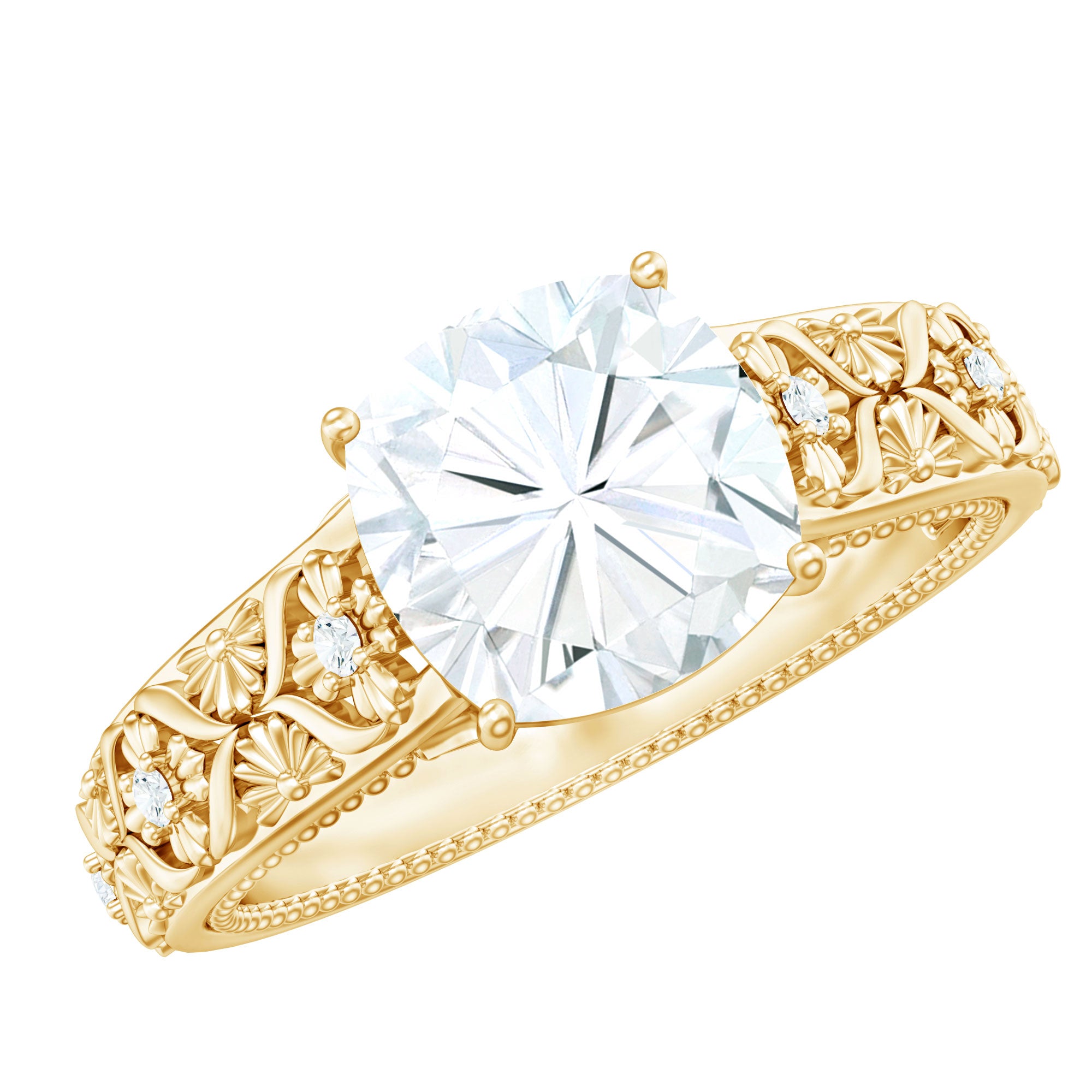 Cushion Cut Solitaire Zircon Gold Floral Engagement Ring