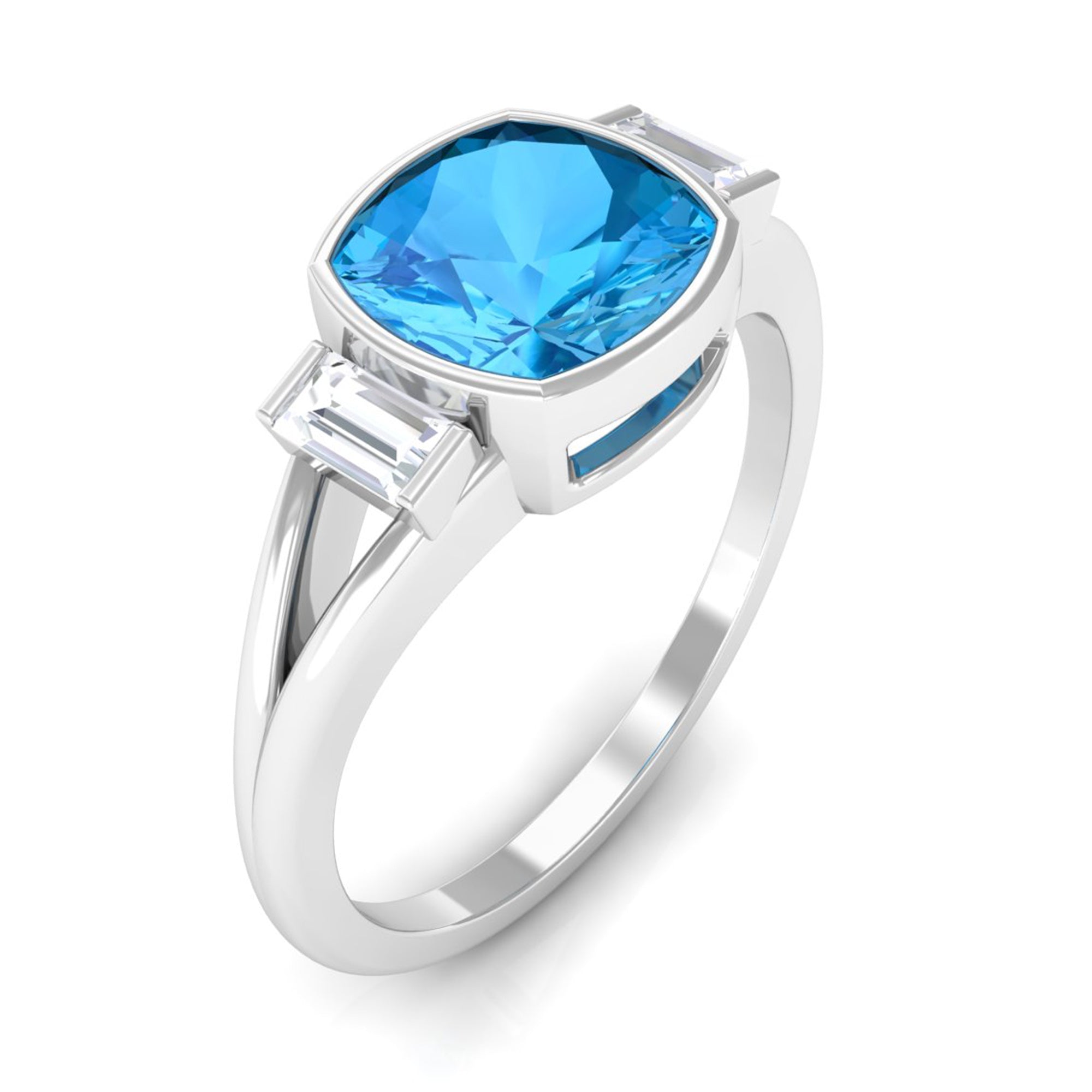 Experience the allure of this Solitaire Ring adorned with a Cushion Cut Swiss Blue Topaz in Bezel Setting over the Split Shank with Diamond on either side.