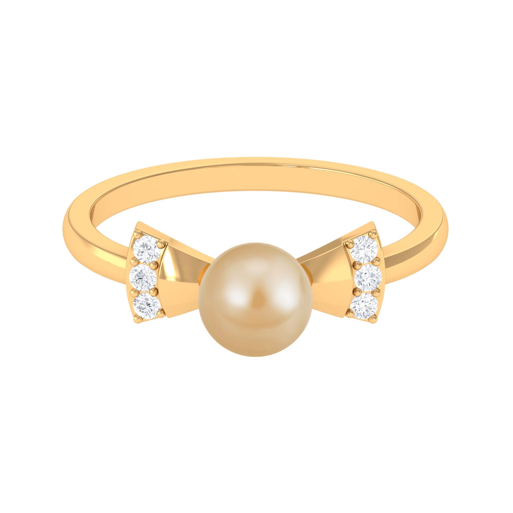 Make her day with this adorable bow-style pearl engagement ring, the sweetest jewelry for her. Crafted from gold, this pearl ring features a round south sea pearl in a bead setting as its solitaire, accented with a Diamond for added sparkle. With its charming design and elegant details, this golden pearl ring is sure to glitter and shine on her finger, just as she does in your life.