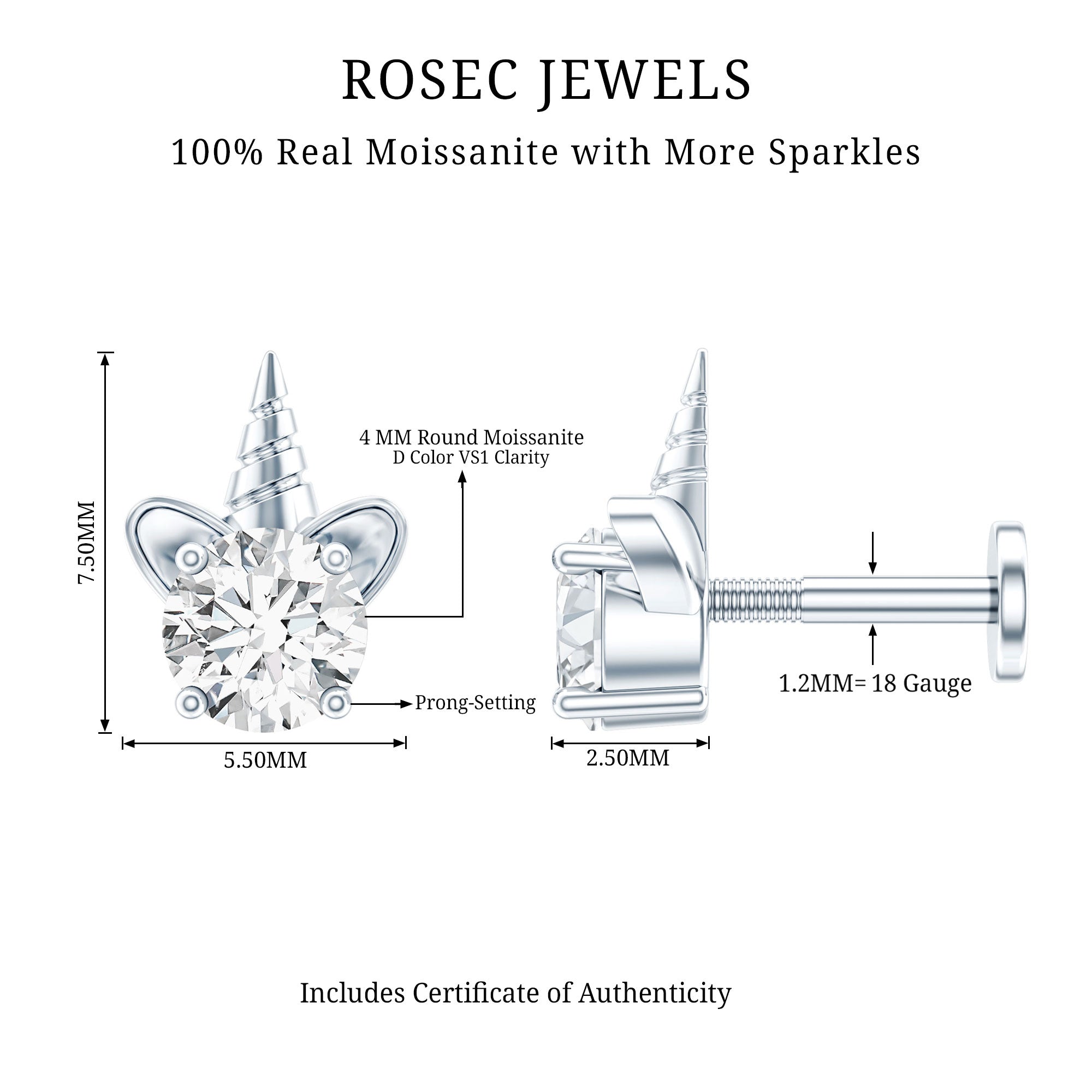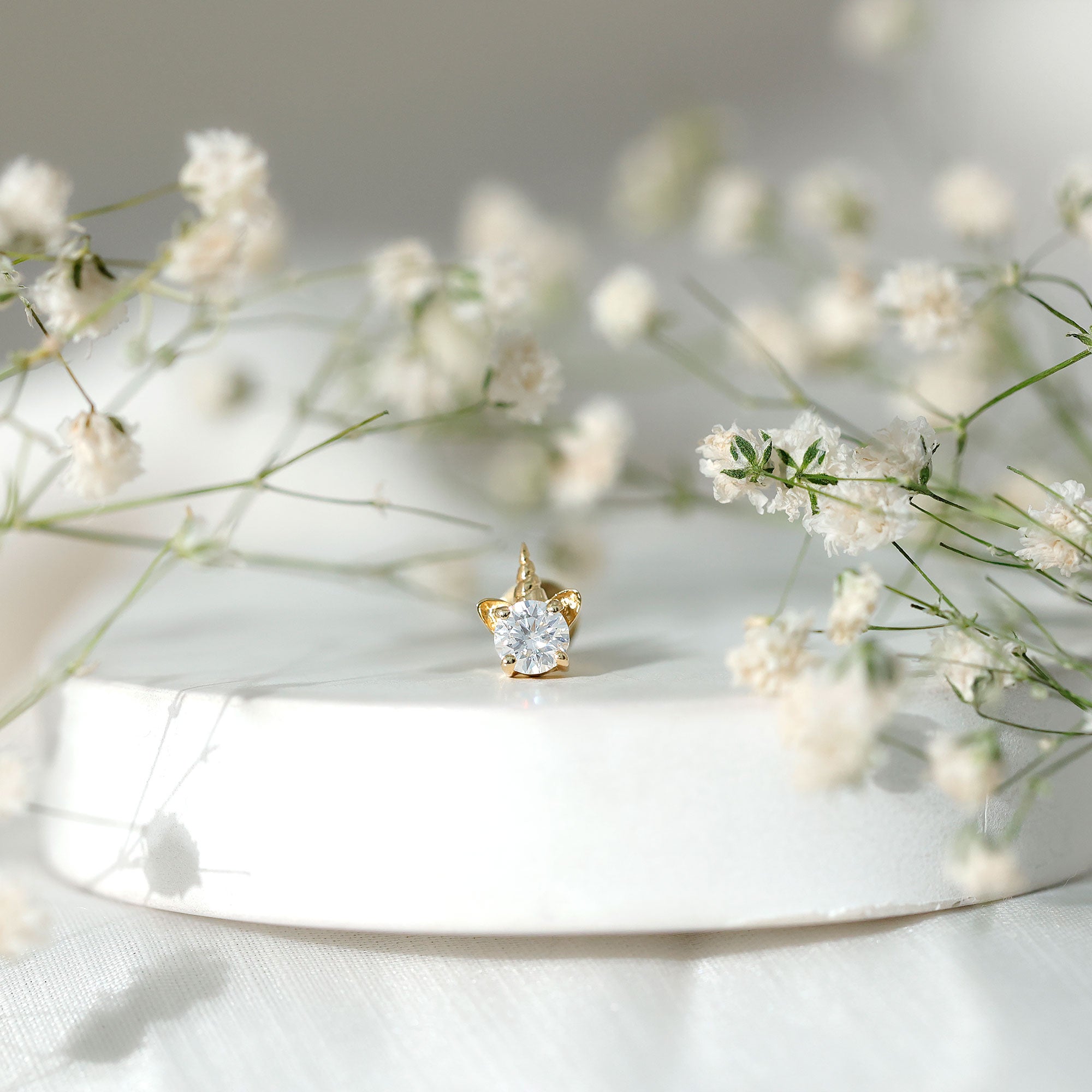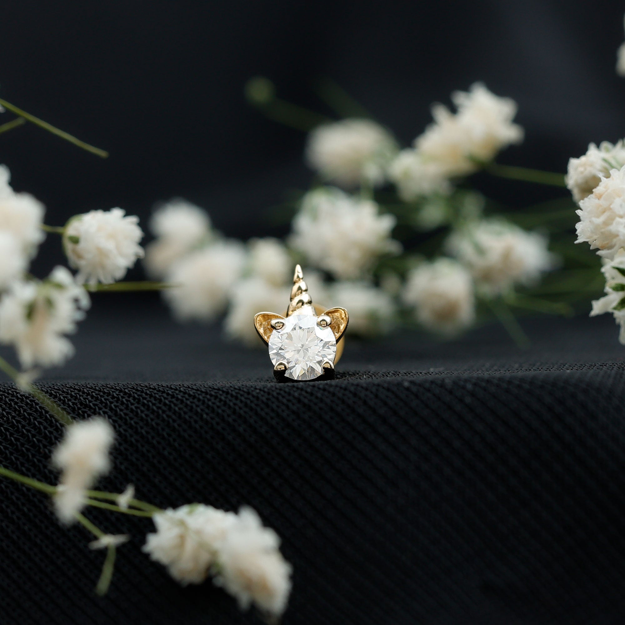 Add a touch of magic to your ear stack with this adorable Moissanite Helix Earring. Shaped with charming unicorn ears and a delicate horn, this piece brings a fun and fantasy-inspired vibe to your everyday jewelry. A brilliant 4MM round cut moissanite of D-VS1 quality is secured in a prong setting, catching the light beautifully and adding eye-catching shine. This versatile Unicorn Earring is made to be styled your way. It looks great on the helix, cartilage, tragus, conch, or upper lobe, making it easy to mix and match with other studs and hoops. Whether you are building a curated ear look or wearing it solo, this Animal Stud Earring adds personality and a little sparkle to any style. Crafted for comfort and daily wear, it features a flat back closure that sits comfortably against the skin and stays secure all day long. Durable, lightweight, and full of character, this Solitaire Moissanite Earring is perfect for anyone who enjoys whimsical jewelry with a modern twist and just the right amount of shine.