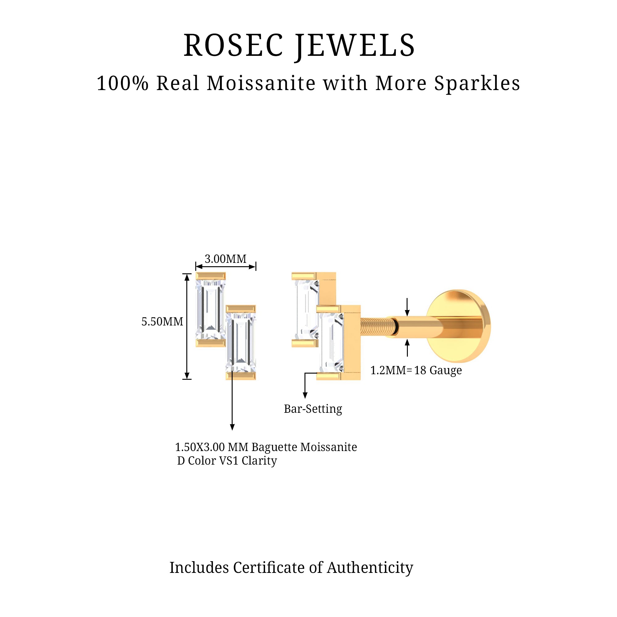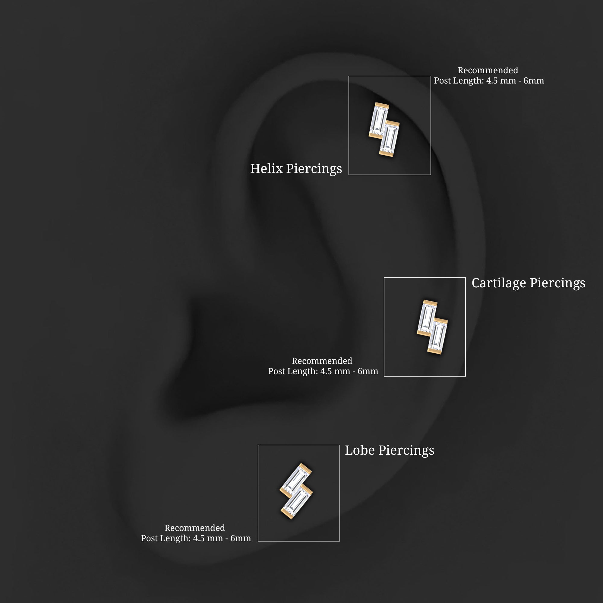 The Baguette Moissanite 2 Stone Dainty Earring has a sleek and modern design. Featuring two Baguette Cut Moissanite secured in Bar Setting, making it the perfect accessory for anyone who wants to add a touch of elegance to their everyday look. Wear it on your Helix, Cartilage, Conch, Tragus, or Upper Lobe Piercing.