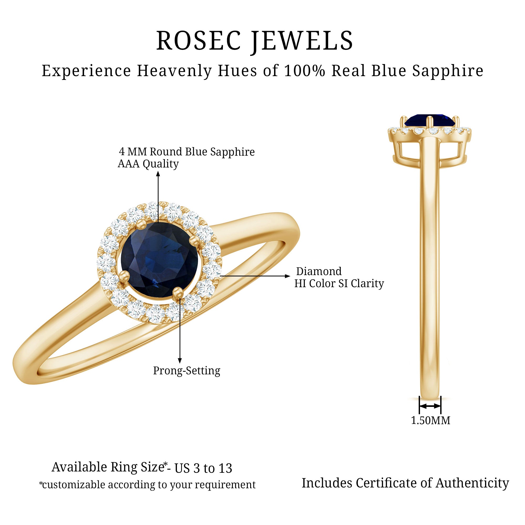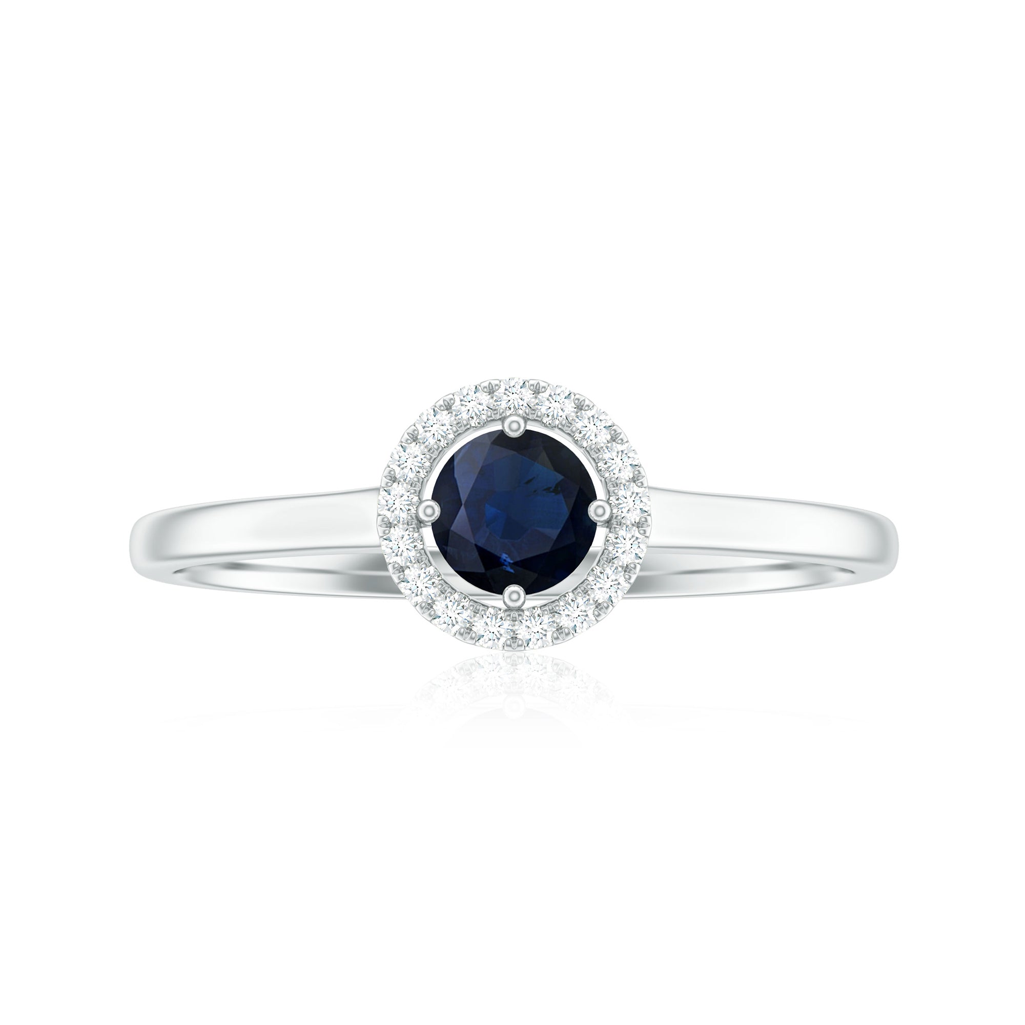 True feminine design to adorn you Solitaire Halo Ring. A gigantic Brilliant Round Blue Sapphire is set in the Prong Setting and to enhance the look petite Tiny Round Diamond are engraved in the Floating Halo Setting. Propose her with the sparkling Floating Halo Ring.