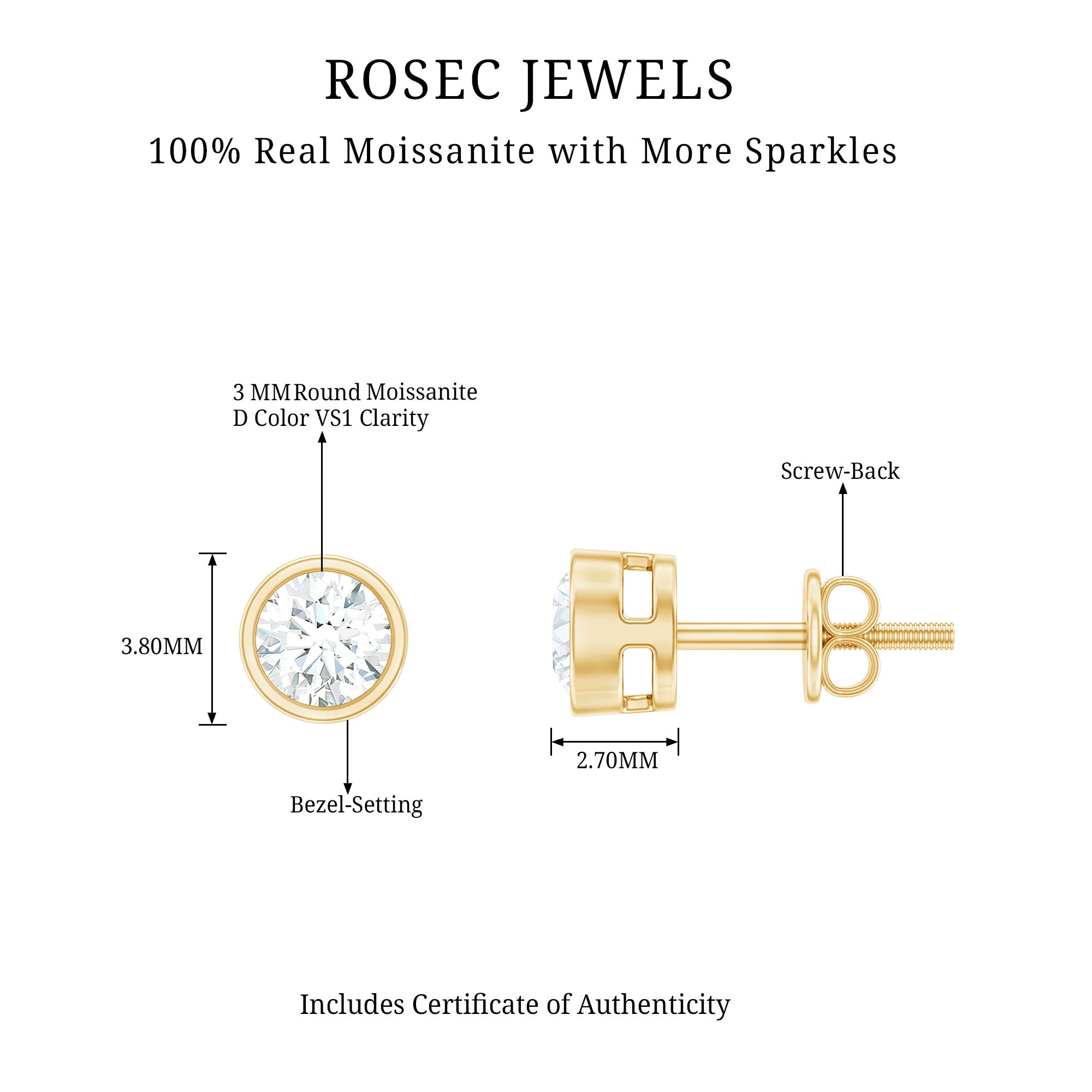 Experience the brilliance of a pair of Moissanite Stud Earrings which reflects a captivating look. These earrings are set with sparkling round shape Moissanite in a classic bezel setting. These earrings are a timeless and classic piece of jewelry which beholds the shine of D-VS1 Moissanites. These Solitaire Earrings can be styled by both men and women for special occasions and worn with casual outfits. The Round Stud Earrings will catch the light and sparkle with every movement, making these earrings a mesmerizing addition to any jewelry collection.