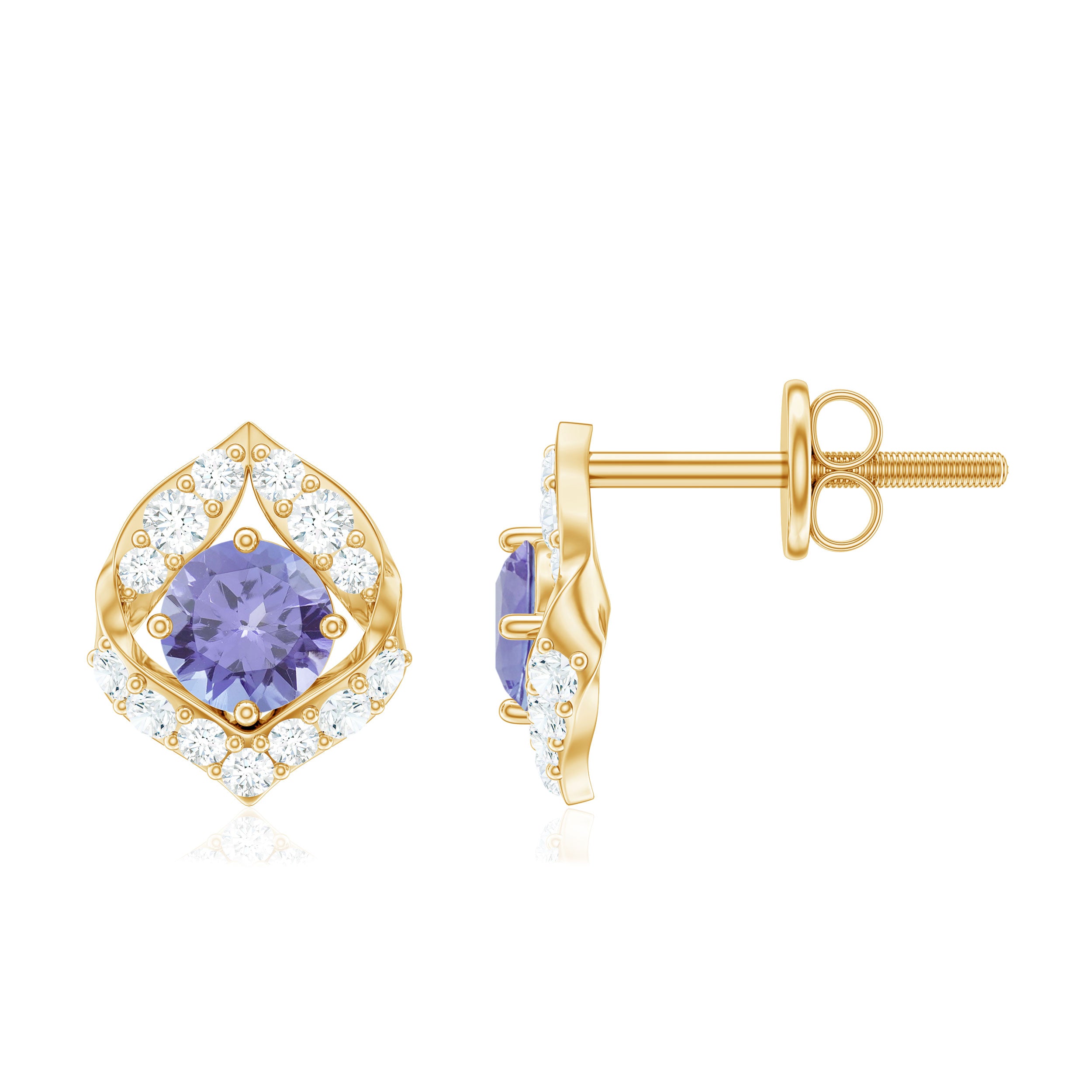 These tanzanite stud earrings are a stunning and unique piece of jewelry. The round tanzanite center stone is surrounded by tiny sparkling diamonds encased in a petal design, adding a touch of luxury and sparkle to the earrings. They can be dressed up or down and will surely add a touch of glamour to any outfit.