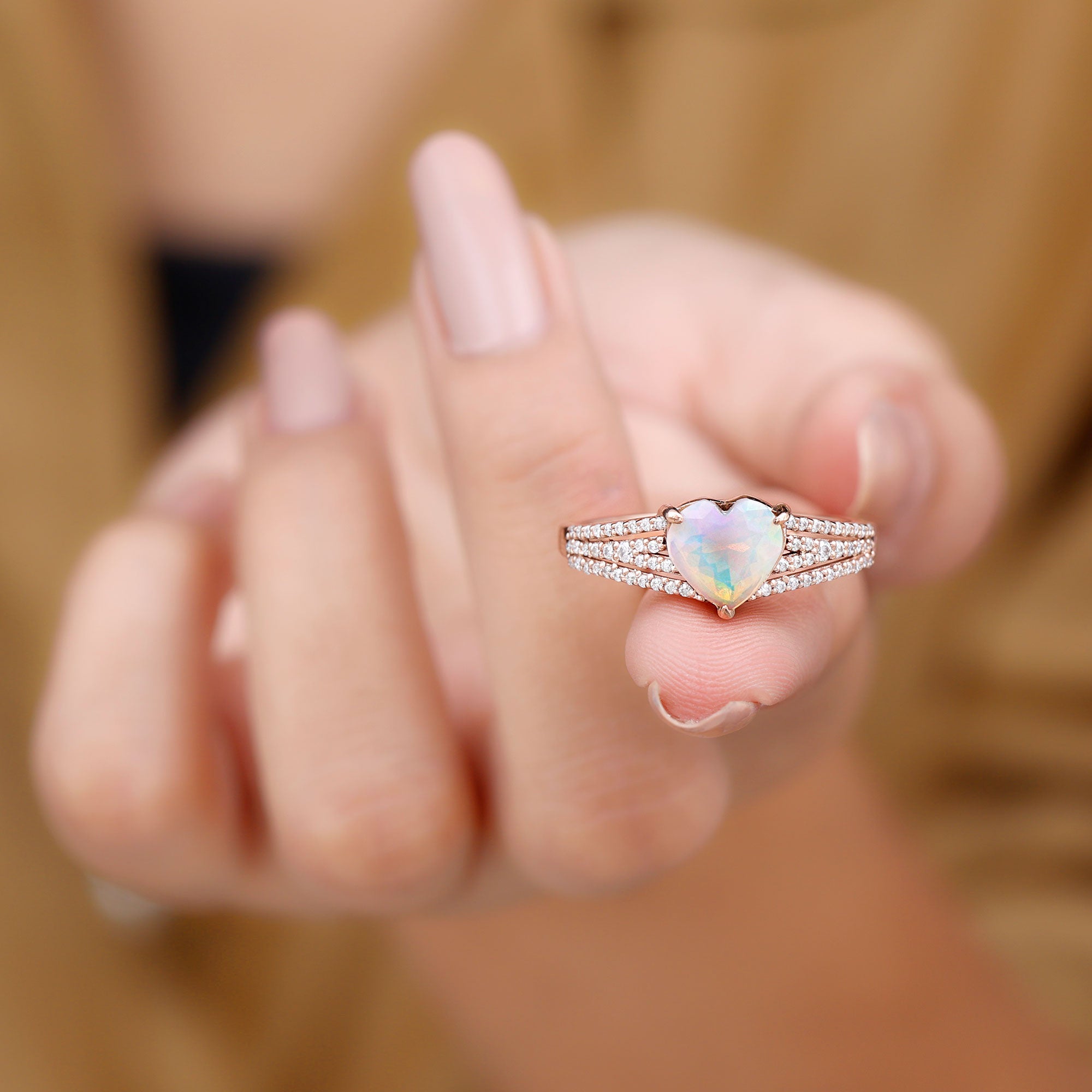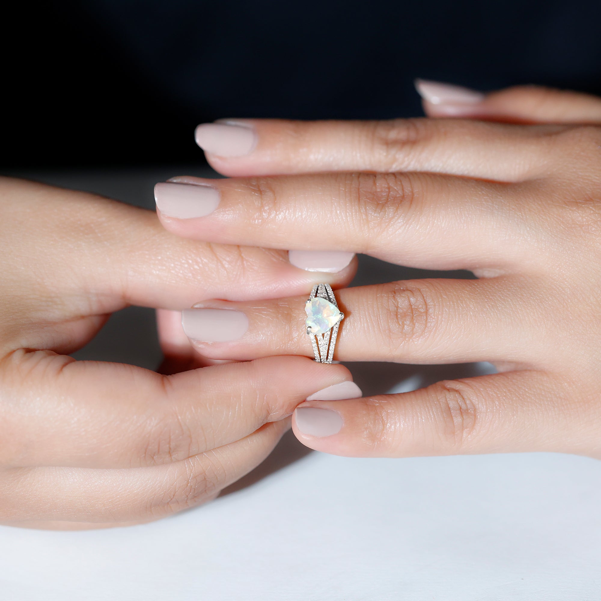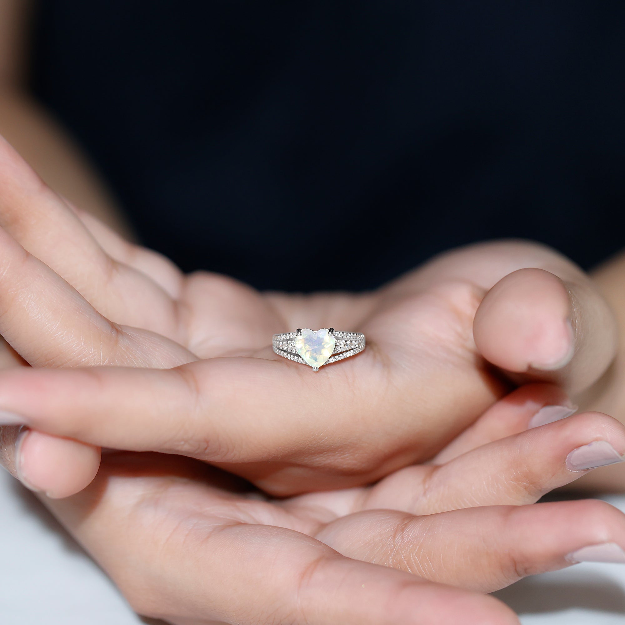 Unveil your love story with this exquisite Heart Shaped Engagement Ring, a true symbol of passion and elegance. At the center, a captivating 8 mm Heart Shape Ethiopian Opal set in Claw Setting radiates a mesmerizing play of colors, flashes of red, green and blue that dance with every movement. The Opal is embraced by a sophisticated Split Shank Band, where delicate Diamond stones shimmer along separate strands, creating a dynamic and modern twist on classic romance. This design effortlessly blends bold artistry with timeless beauty, making it perfect for the person who dares to stand out while celebrating deep, heartfelt connections. Whether you are sealing a promise or celebrating a milestone, this Designer Engagement Ring offers an unforgettable sparkle that is as unique as your love. Delivered in a signature jewelry box and available in multiple sizes, this Split Shank Engagement Ring is ready to make any moment magical. For those who want an engagement ring that is more than just jewelry, this Opal Diamond Engagement Ring is a wearable work of art, crafted to capture hearts and turn heads.