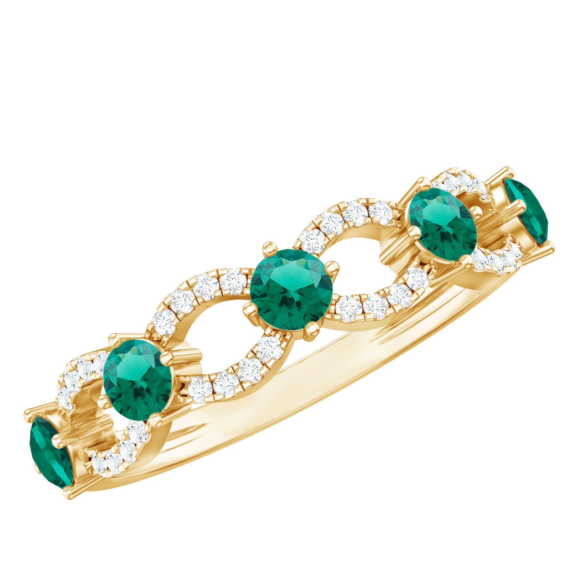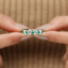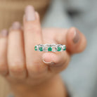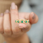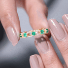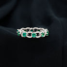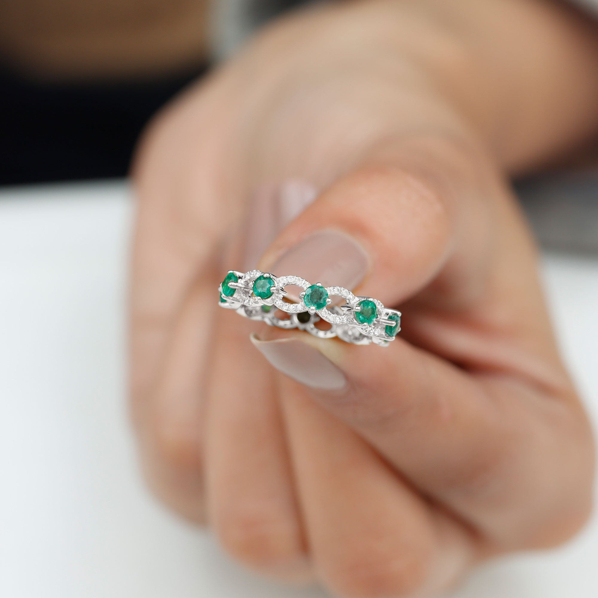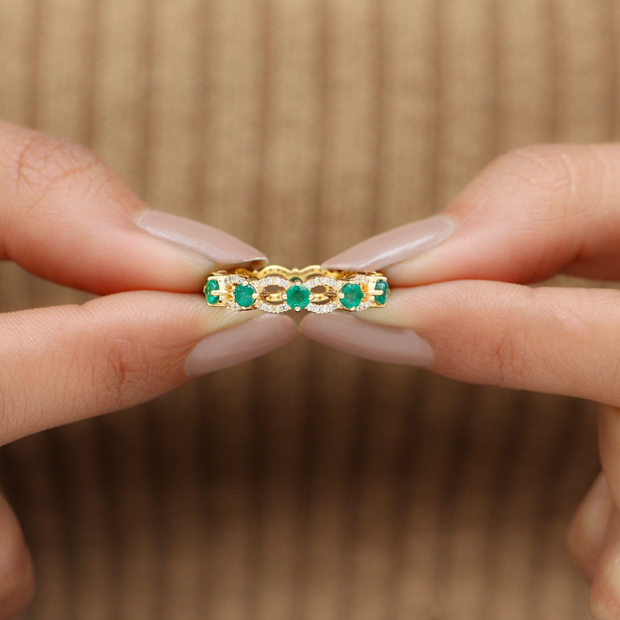 Designed to capture hearts, this Designer Wedding Ring is a beautiful symbol of lasting love. This Full Eternity Ring features 3 mm Round Shape Lab Created Emerald stones set in Prong Setting that goes all the way around the band, creating a look that never ends, just like true love. Each green AAAA Quality Lab Emerald is carefully set next to dainty sparkling Diamond gemstones studded over the unique design, giving this Eternity Wedding Band extra shine and making the Lab Emerald stones stand out even more. The full eternity design means the stones circle the entire band, making this Lab Grown Emerald Ring perfect to wear every day or for special occasions. The band is designed to fit comfortably on the finger while still looking elegant and eye-catching. Its simple yet stylish design makes it a perfect choice for weddings, anniversaries, or any moment you want to celebrate love. This Emerald Wedding Band is a meaningful way to show your commitment. This Emerald Diamond Ring comes in a beautiful signature jewelry box, ready to be a lasting reminder of your special bond.